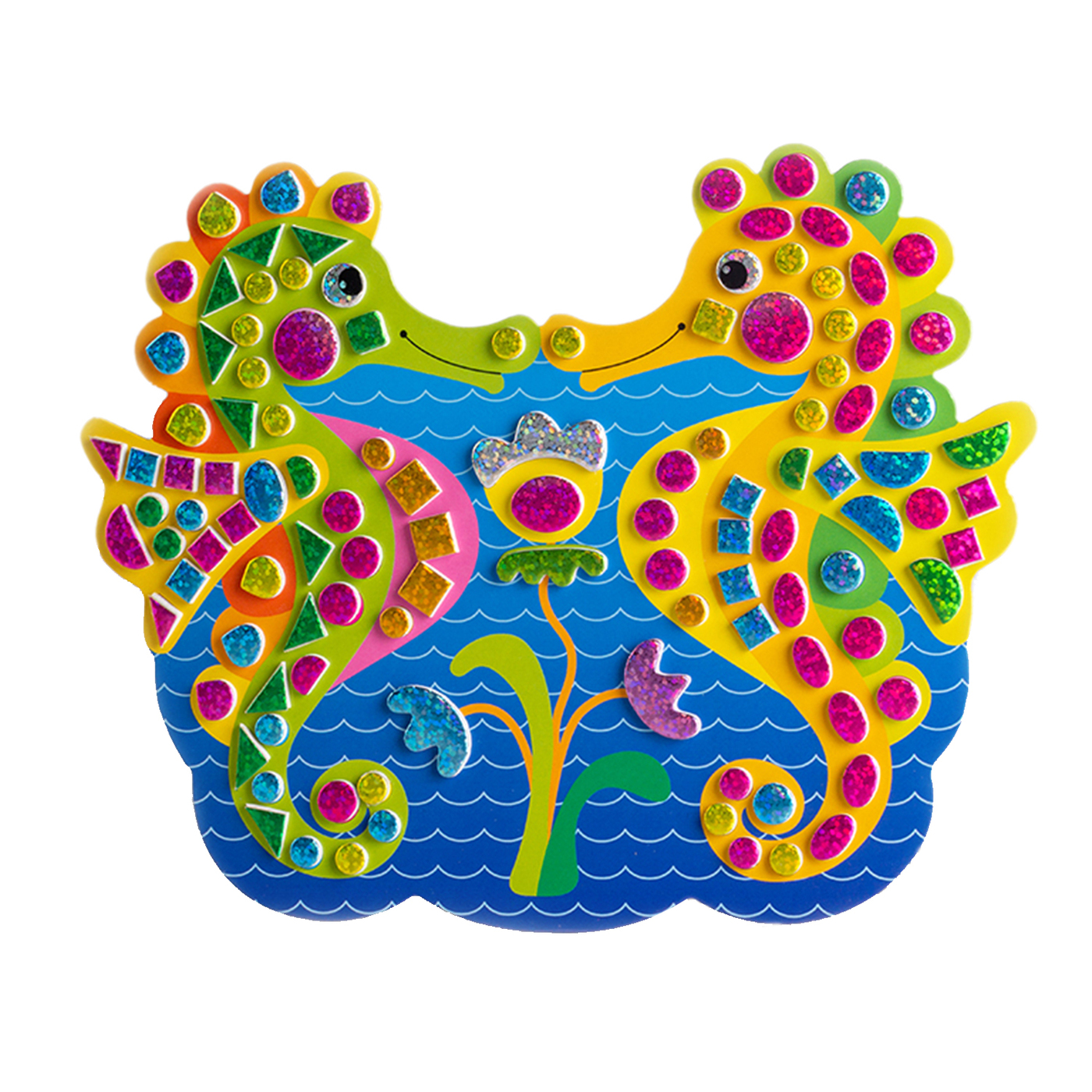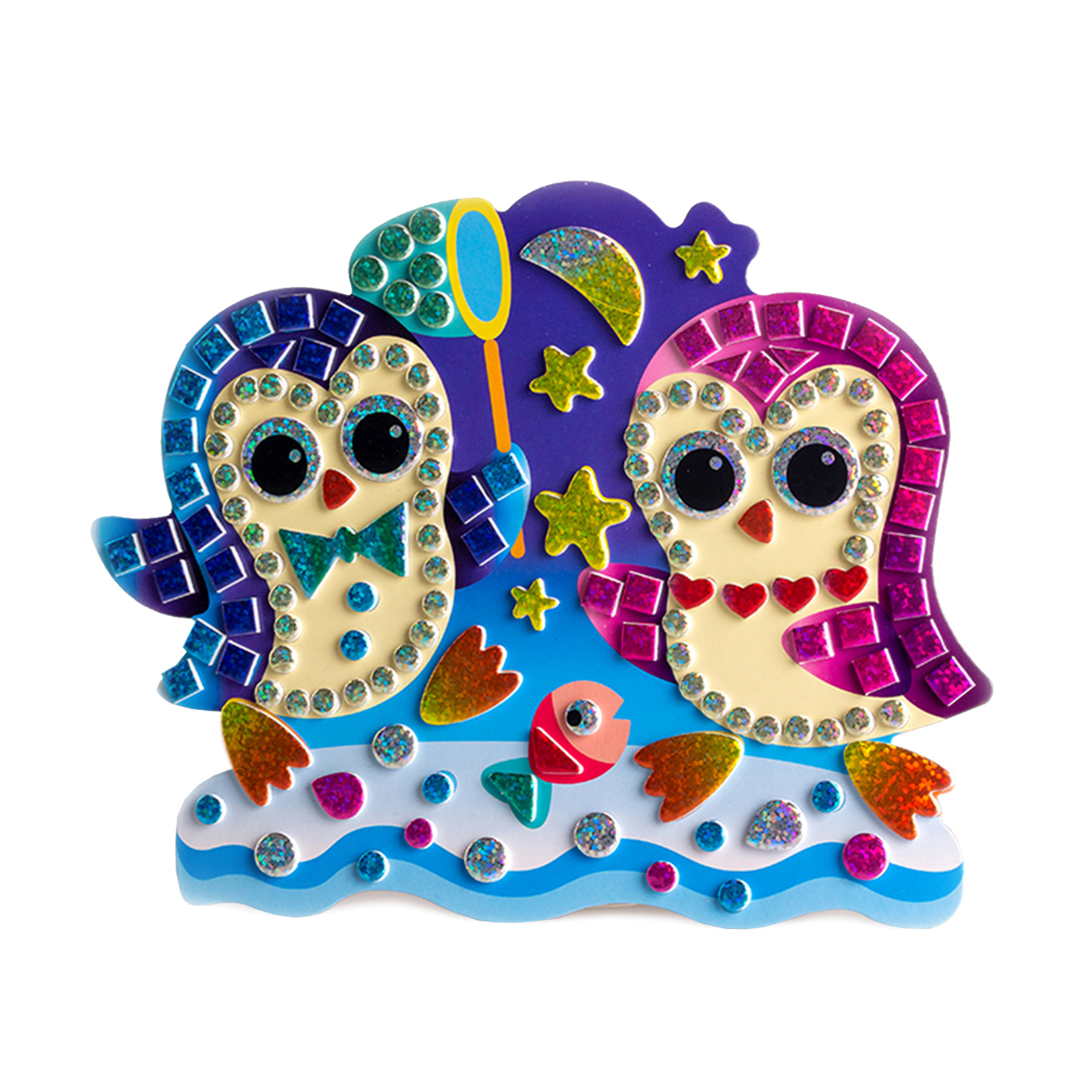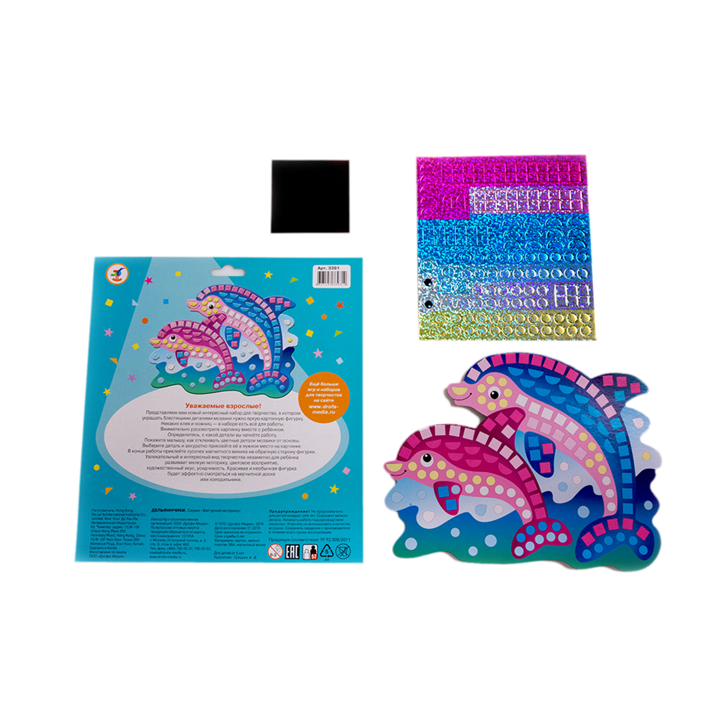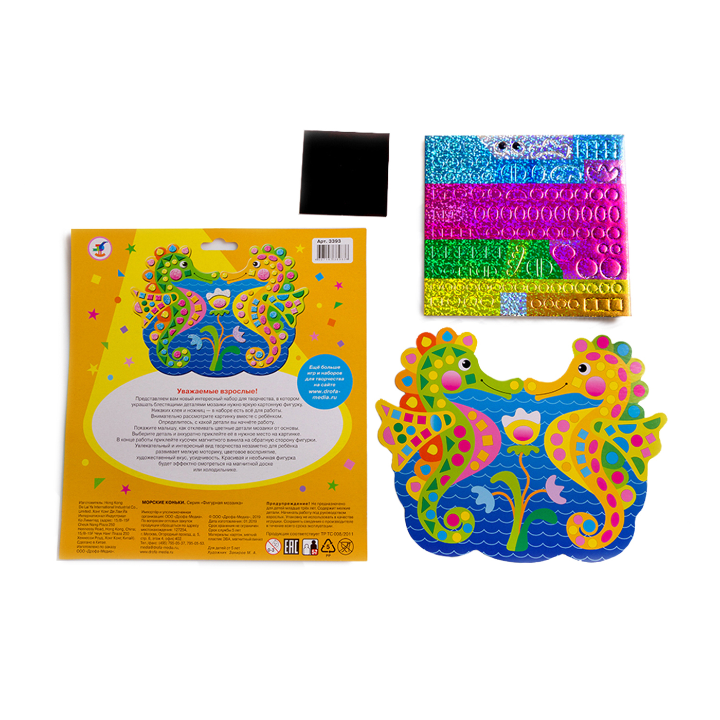 Картонные фигурки, вырубленные по контуру, нужно украсить блестящими деталями из ЭВА. Никаких клея и ножниц — в наборе есть всё для работы. Блестящие детали легко отклеиваются от основы и надёжно крепятся к фигурке-персонажу. В комплект входит магнитный в