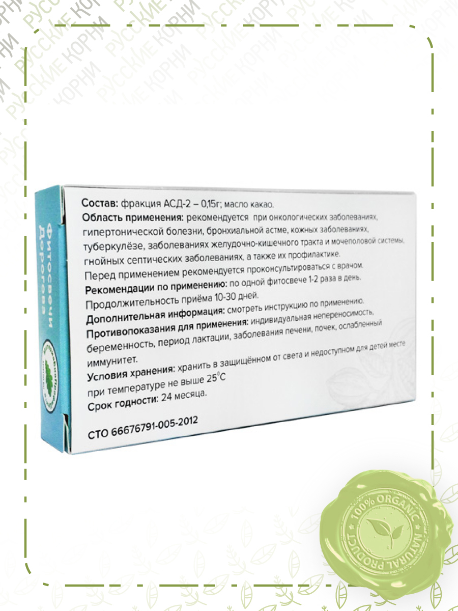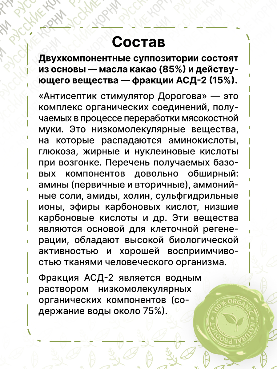 Состав:масло какао; АСД 2Описание:Антисептик стимулятор Дорогова" (АСД) - легендарное иммуномодулирующее, противовирусное и противоопухолевое средство, активно применяющееся в народной медицине. Использование в официальной медицине ограничено по причине о