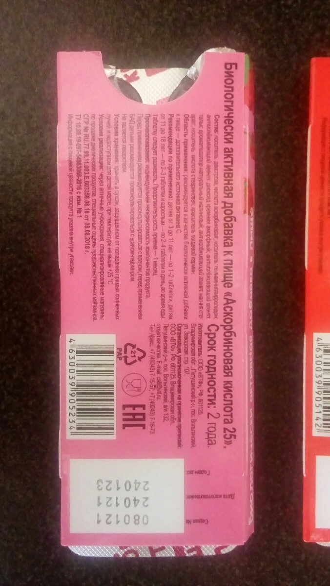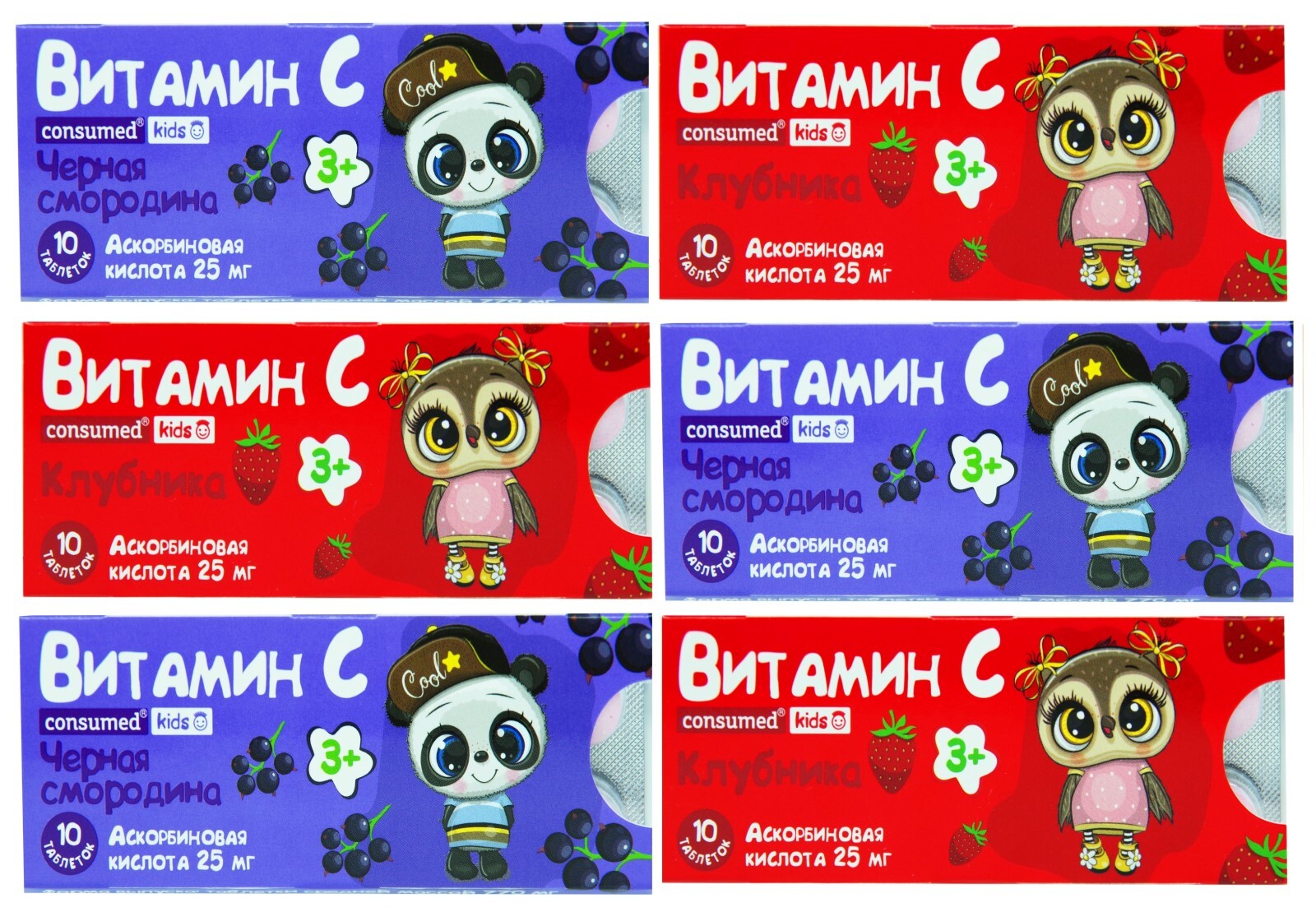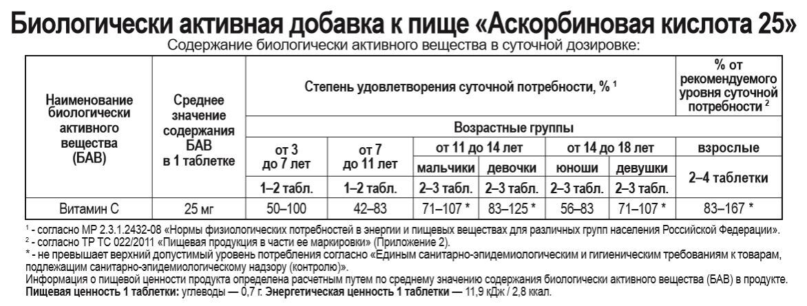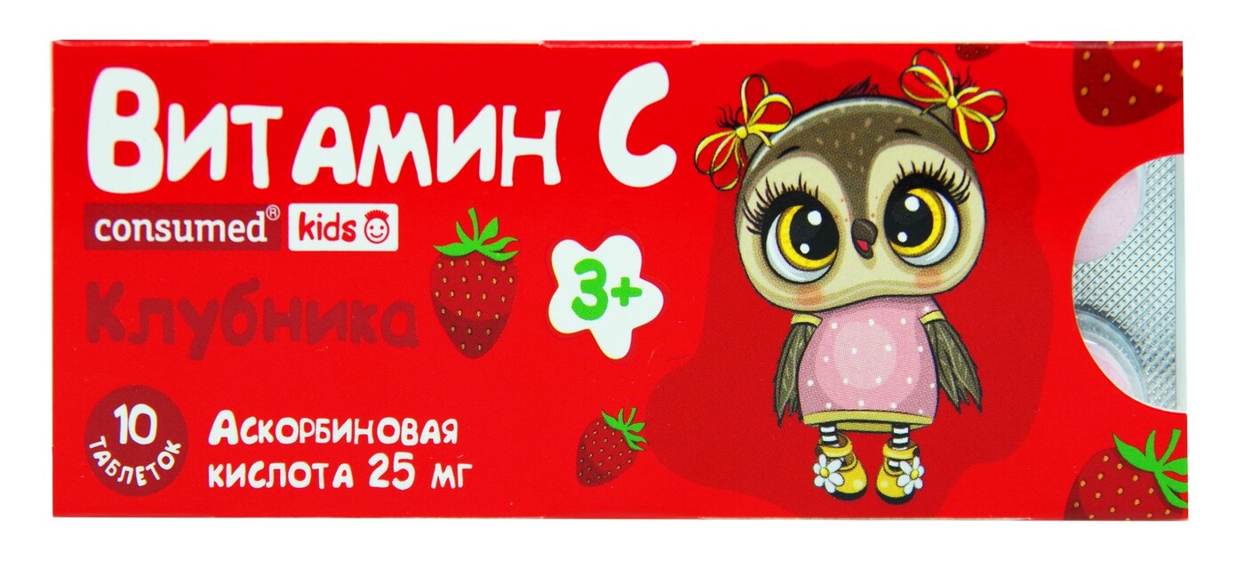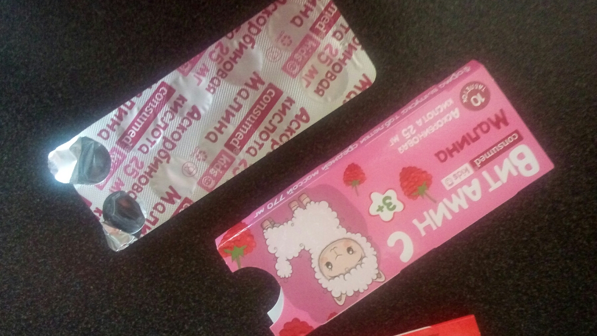 МНН/Действующее вещество:аскорбиновая кислота Дозировка:25 мгСостав:кислота аскорбиновая; антислёживающие агенты, ароматизатор натуральный малиновый и клубничный; краситель пищевой карминСпособ применения:детям от 3 до 11 лет — по 1–2 таблетки, детям от 1