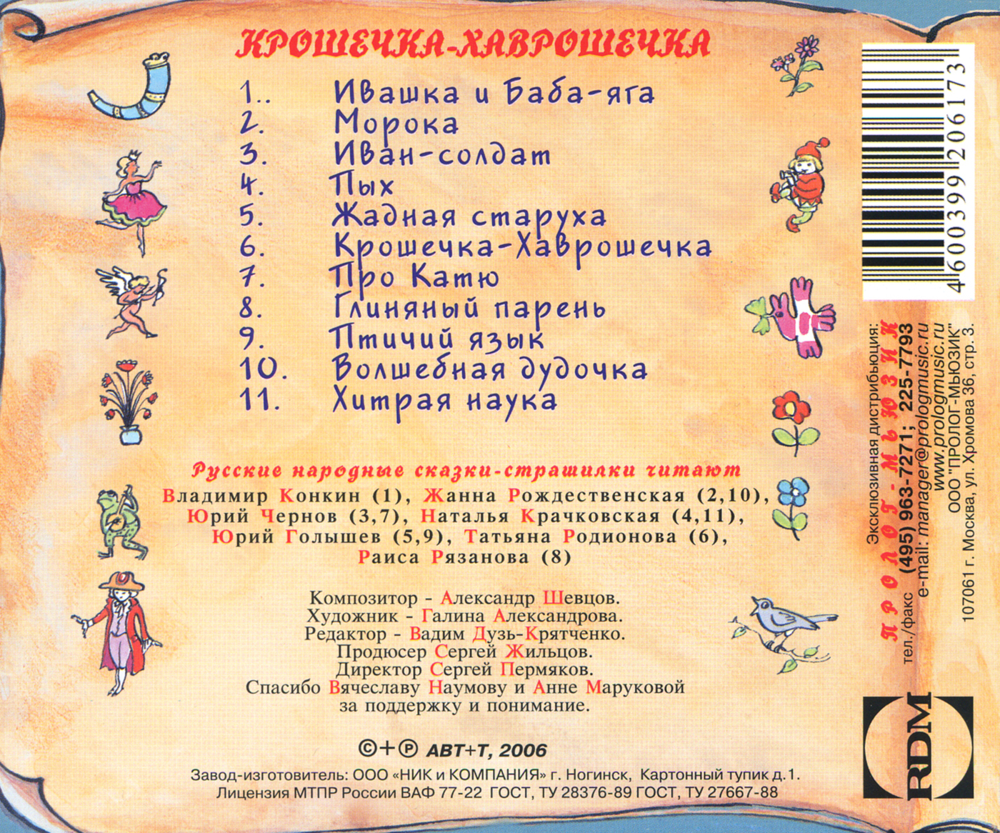 В издание вошли известные русские народные сказки.Список музыкальных треков:1. Ивашка и Баба-яга (Исполнитель аудиокниги: Конкин Владимир Алексеевич, Исполнитель аудиокниги: Крачковская Наталья Леонидовна, Исполнитель аудиокниги: Чернов Юрий). Сказка. 2.