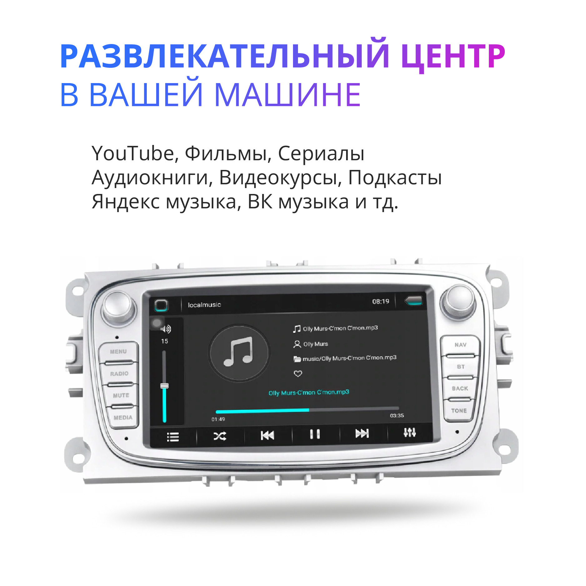 ОсобенностиОС Android, Поддержка камеры заднего вида, Поддержка кириллицы, Управление с кнопок на руле (SWC), Автоматическое приглушение звука при ответе на вызов, Поддержка Android, Поиск по файлам