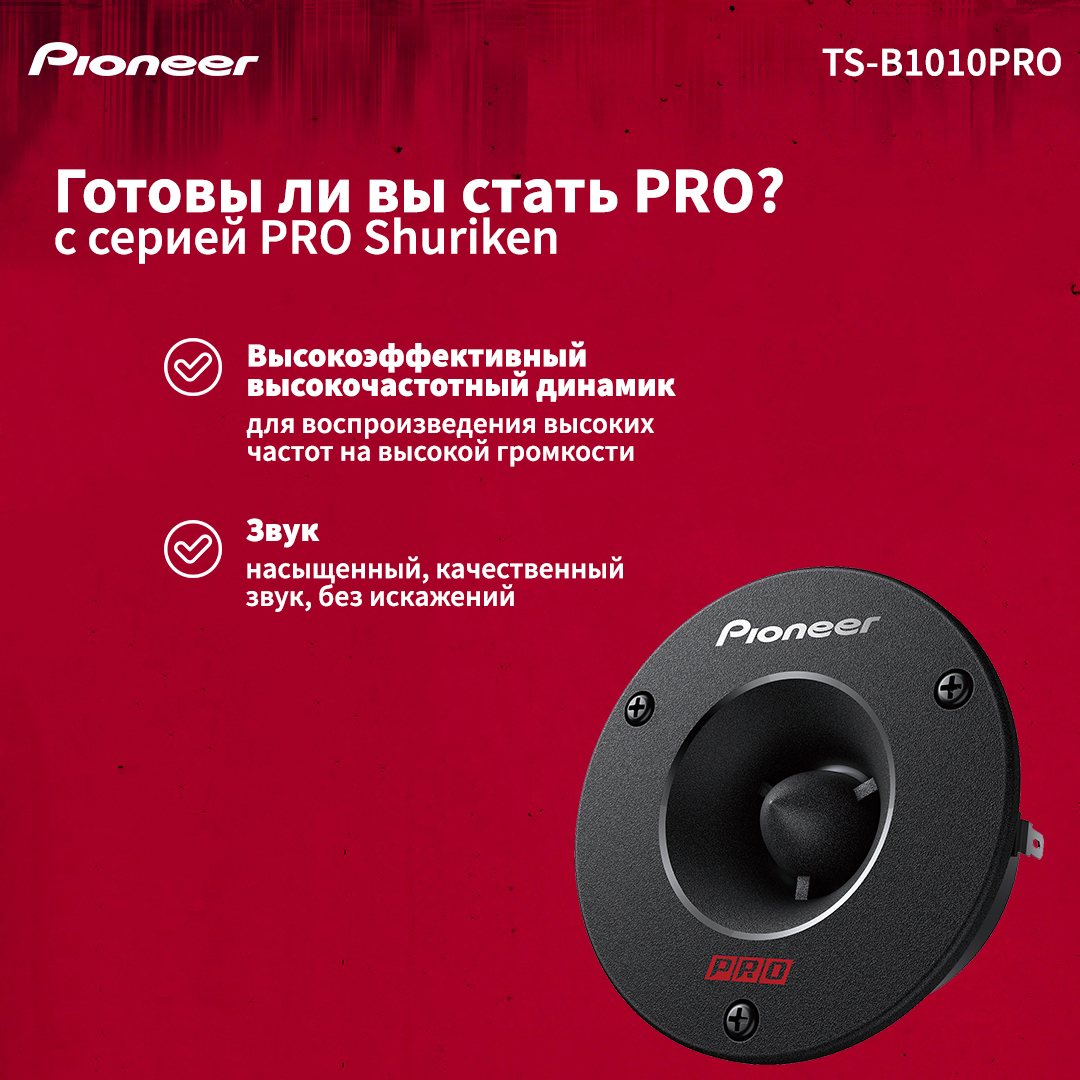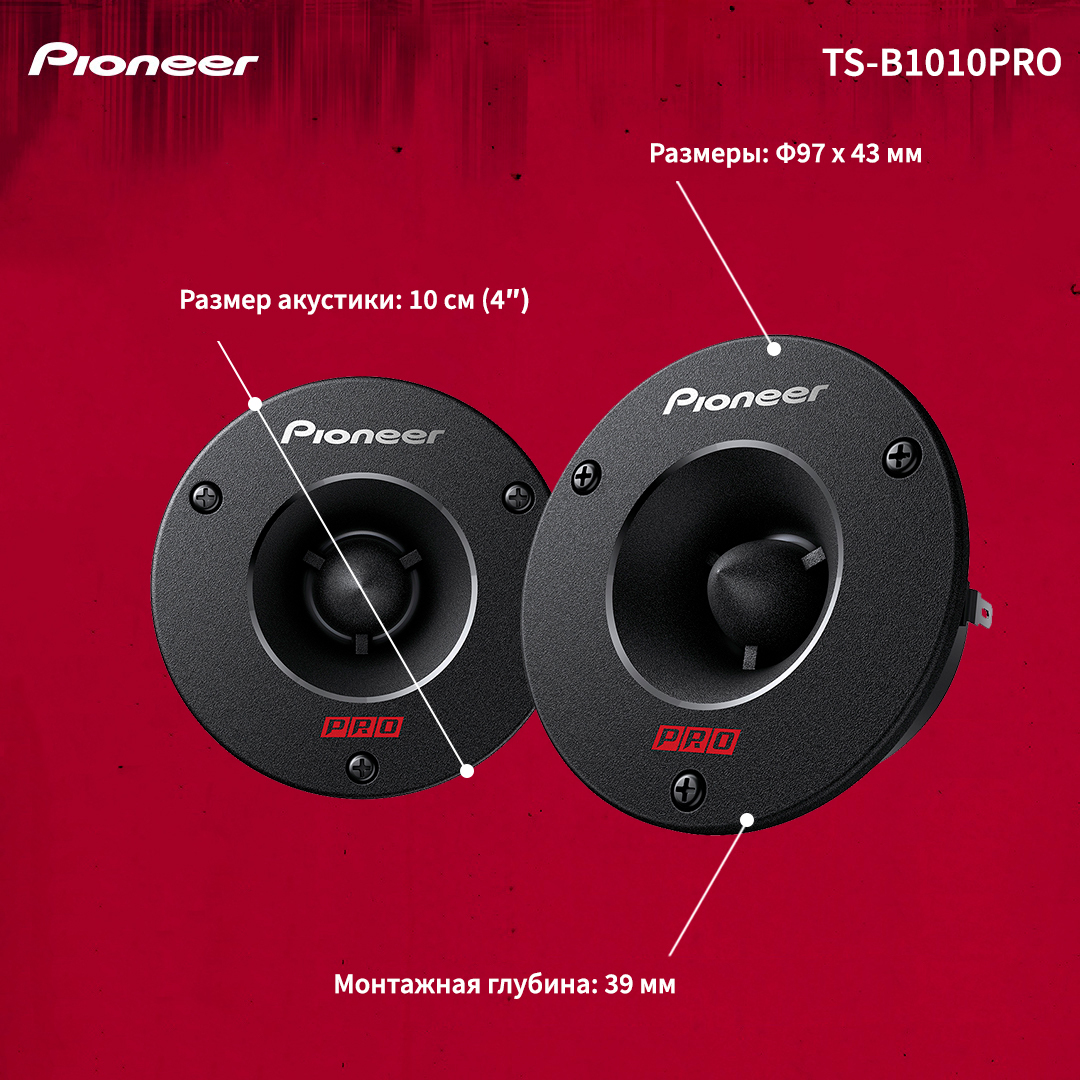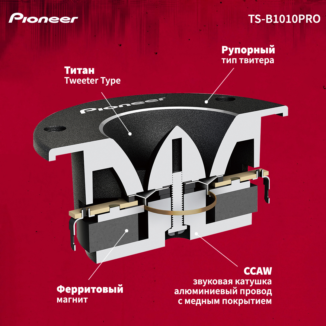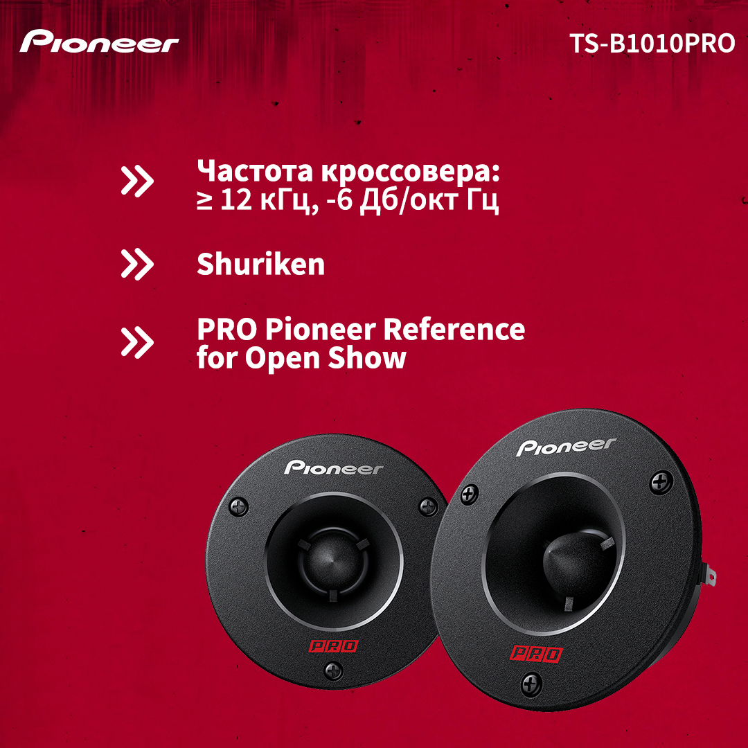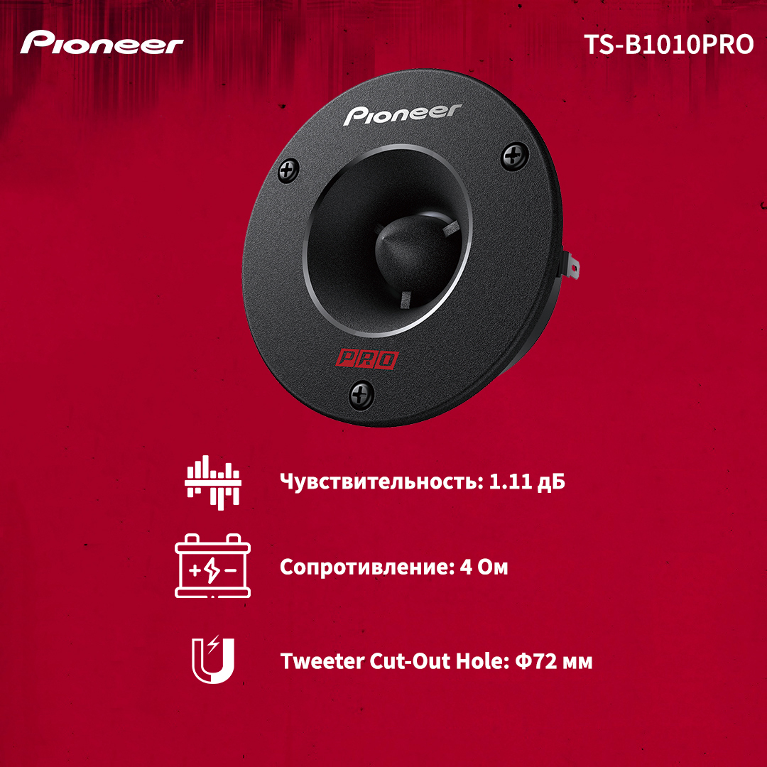 Комплектация:Динамики - 2штКрепежные винтыОписание:Рупорный твитер Pioneer TS-B1010PRO серии PRO Shuriken - это высокоэффективный высокочастотный динамик размером 10 см с алюминиевым литым корпусом, легкой и жесткой титановой диафрагмой, большим ферритовы