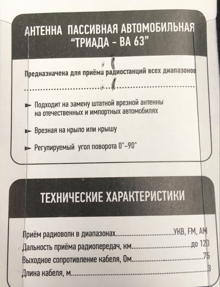 Антенна пассивная Триада-ВА 63-04 - это пассивная антенна для приема радио с регулируемым углом наклона приемного элемента 0-70 градусов. Антенна герметизирована и водонепроницаема. Устанавливается "в четыре руки": один человек прижимает антенну снаружи к