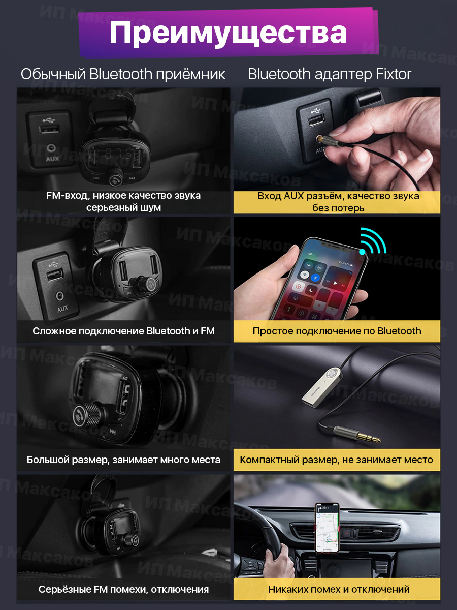 Автомобильный Bluetooth ресивер Fixtor BUA2 превращает обычную автомагнитолу в блютуз-совместимую. Он коннектится к смартфону при помощи Bluetooth соединения, а к автомобильной аудиосистеме посредством разъема AUX 3.5 мм. Для питания устройства его нужно