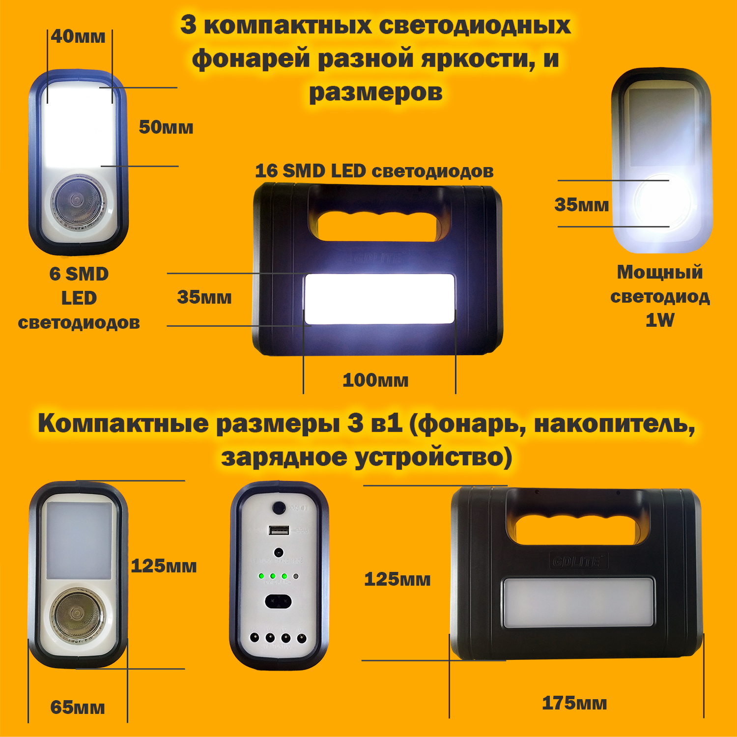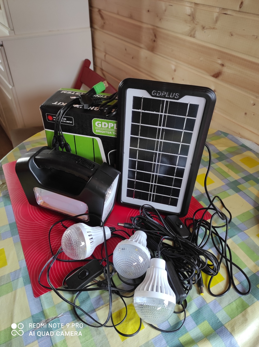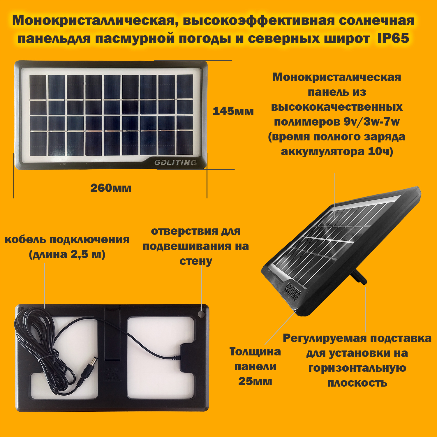 Комплектация:Комплект включает в себя:1) Солнечная батарея 7Вт, 6-9в с кабелем 2,5м2) Накопитель заряда (контролер заряда, АКБ +фонарь-прожектор с USB) 4) Провод к сети 110-240V 50cм5) Светодиодная лампочка 6 вольт - 3шт.6) USB адаптер для зарядки мобиль