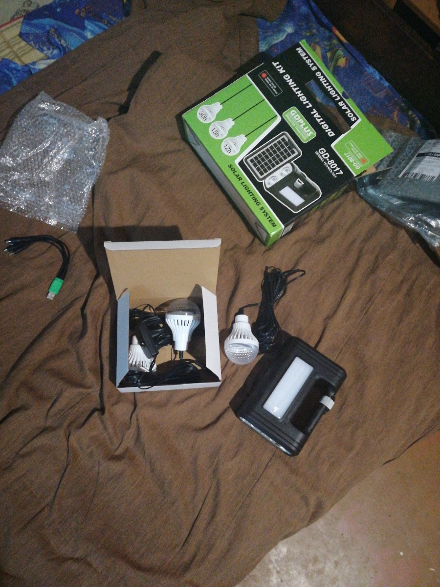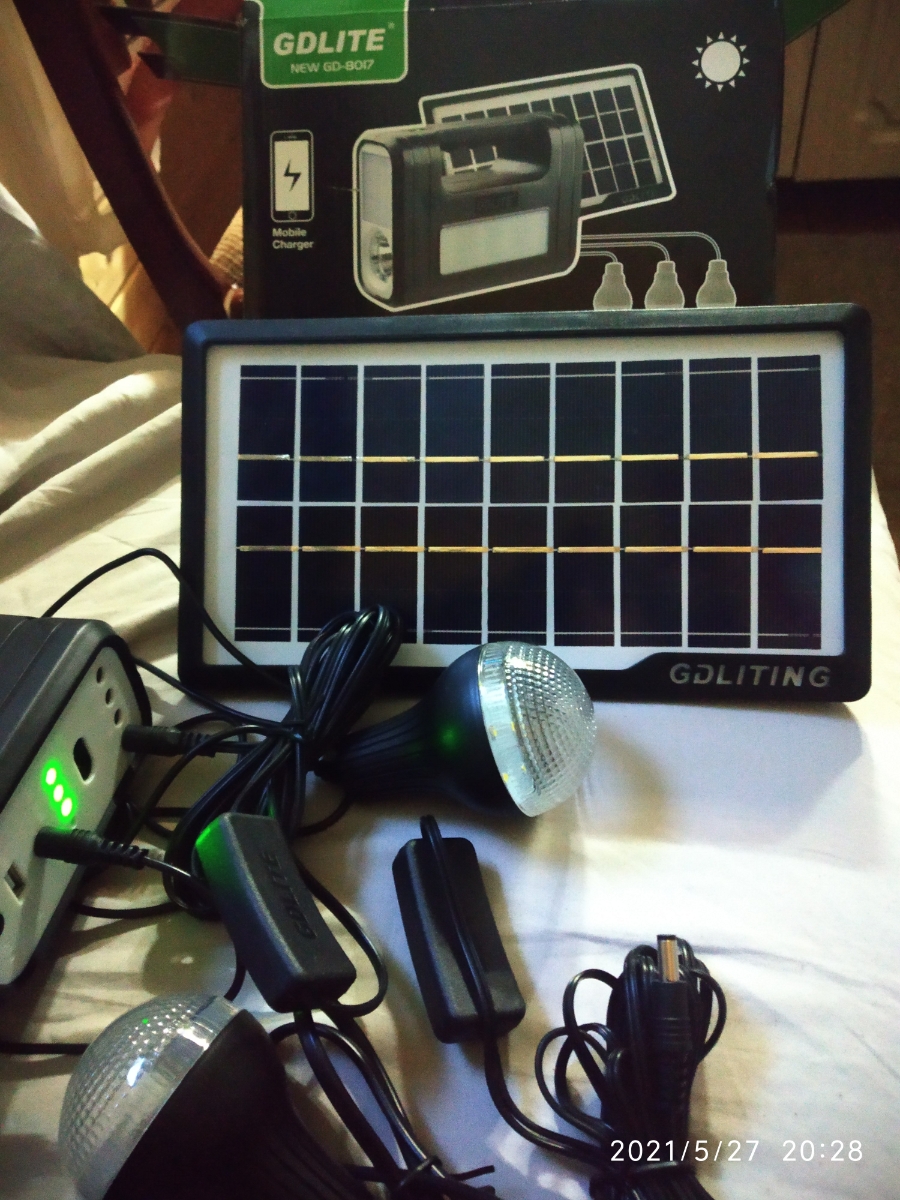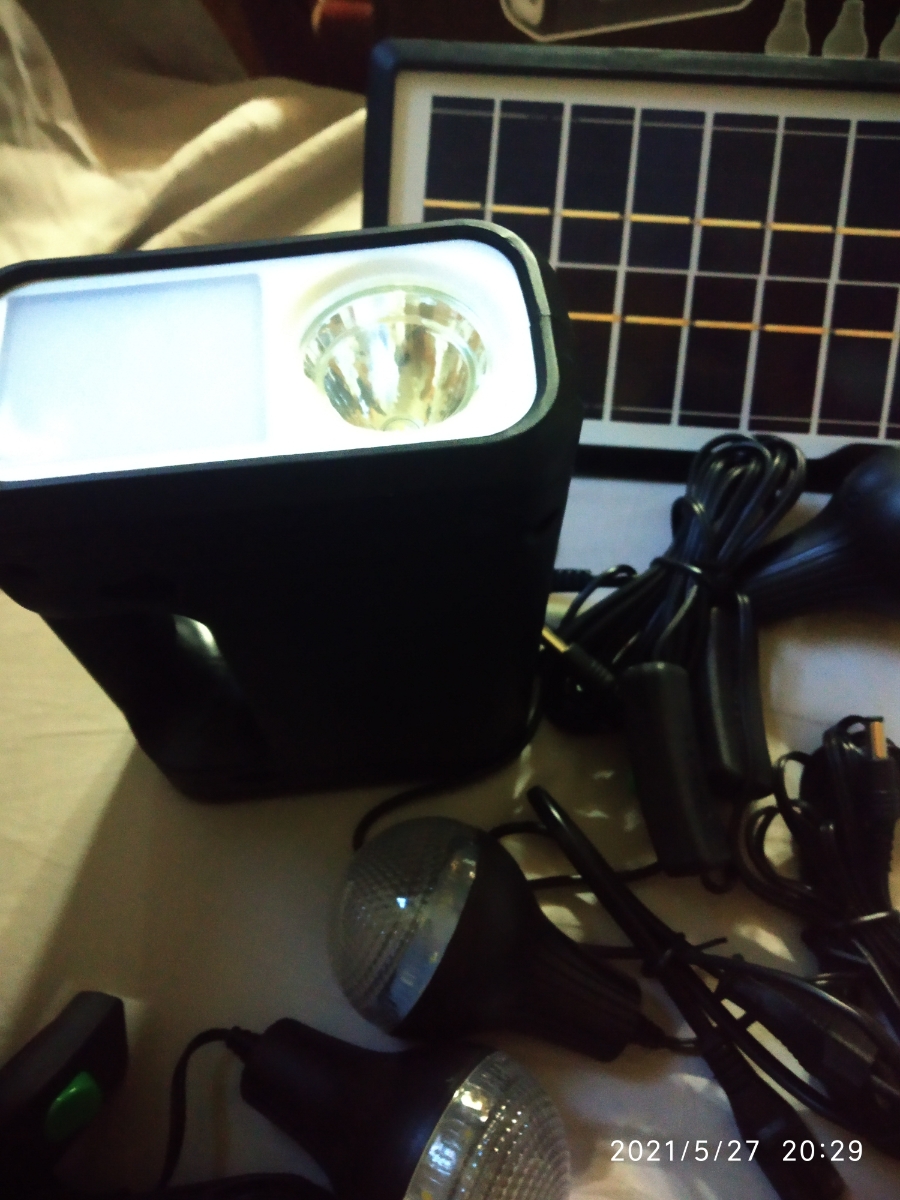 Комплектация:Комплект включает в себя:1) Солнечная батарея 7Вт, 6-9в с кабелем 2,5м2) Накопитель заряда (контролер заряда, АКБ +фонарь-прожектор с USB) 4) Провод к сети 110-240V 50cм5) Светодиодная лампочка 6 вольт - 3шт.6) USB адаптер для зарядки мобиль