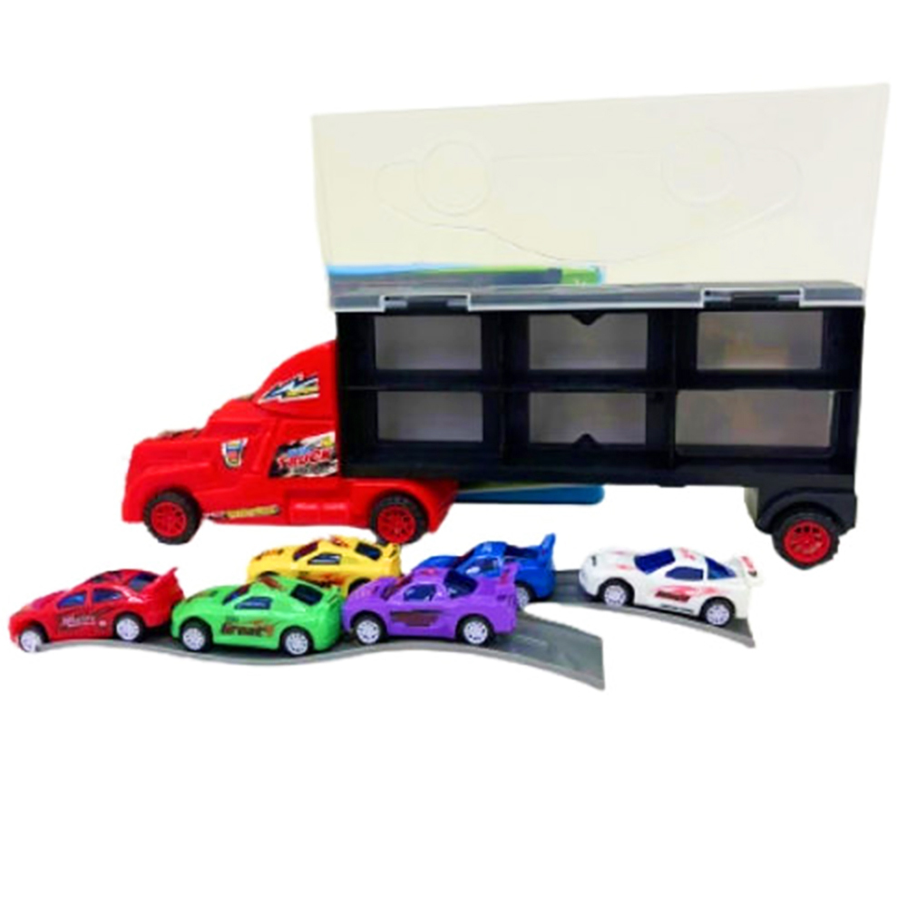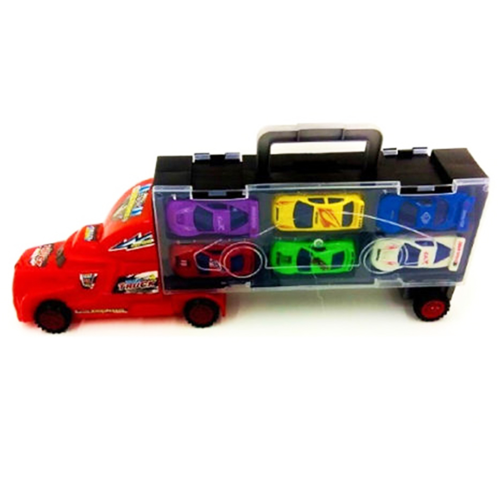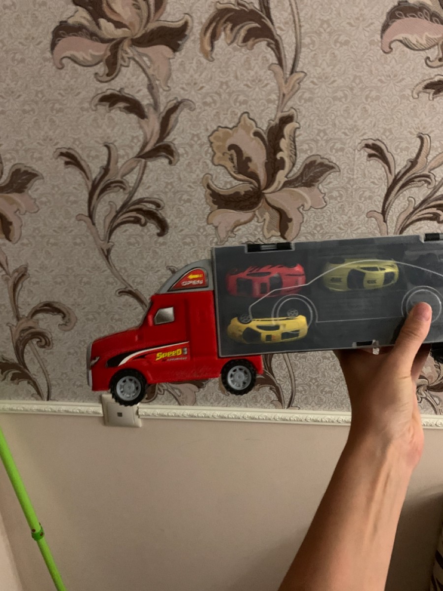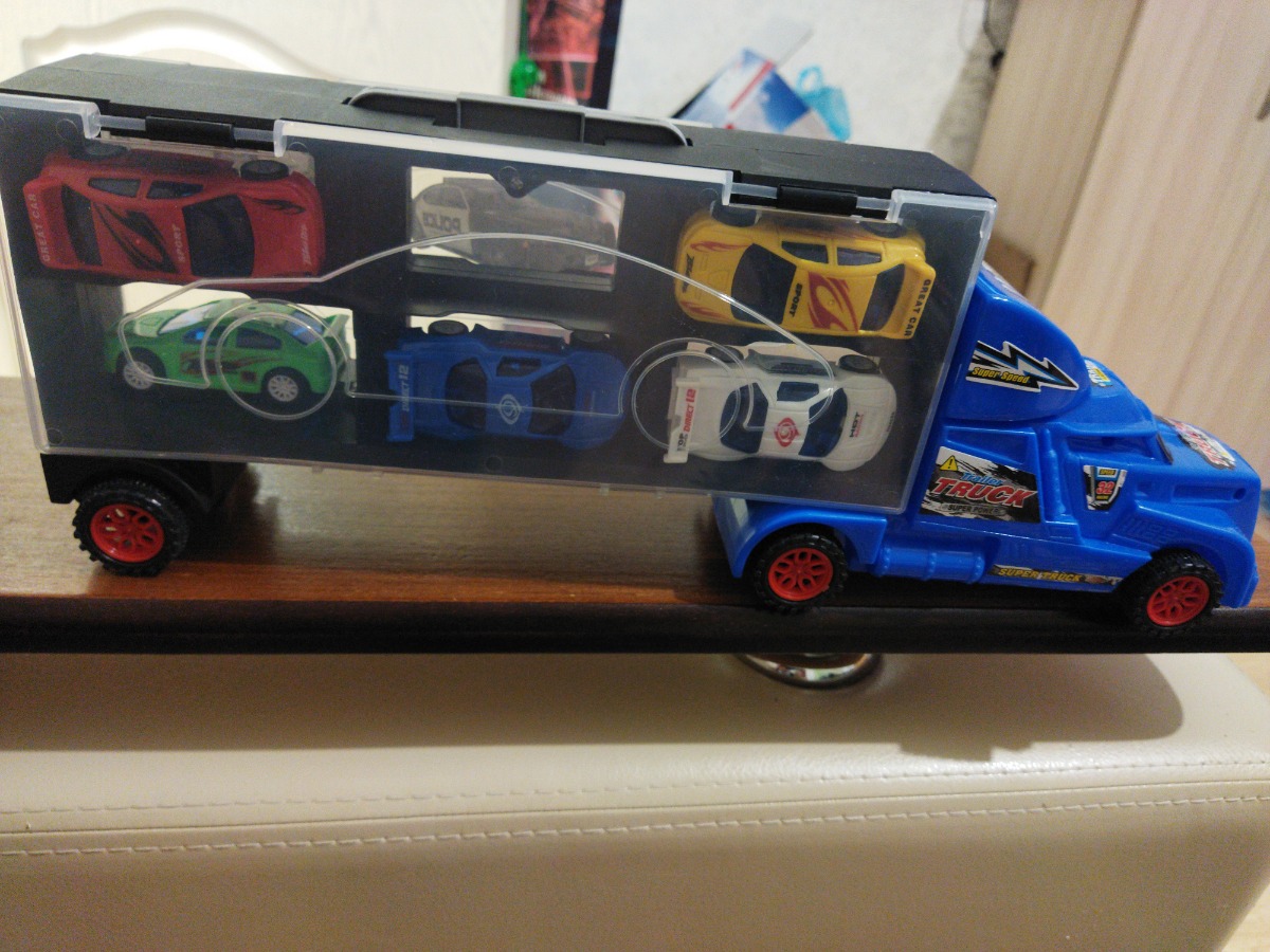 Прекрасный подарок любому мальчику в любом возрасте!В коробке находится трейлер-автовоз большого размера с удобной ручкой сверху и набор машинок.Грузовик-автовоз можно брать с собой куда угодно или просто прятать в него игрушки-машинки. Боковая стенка куз