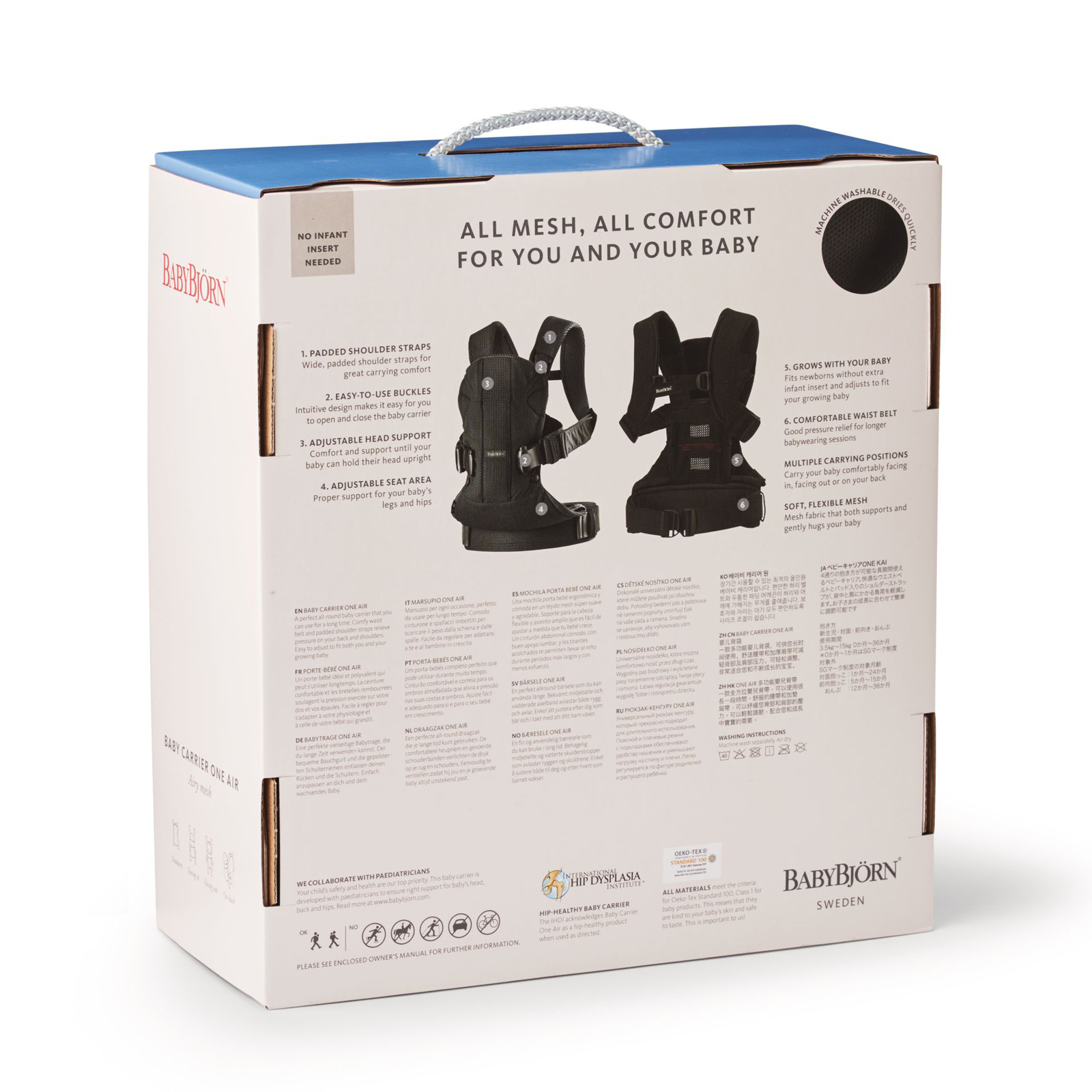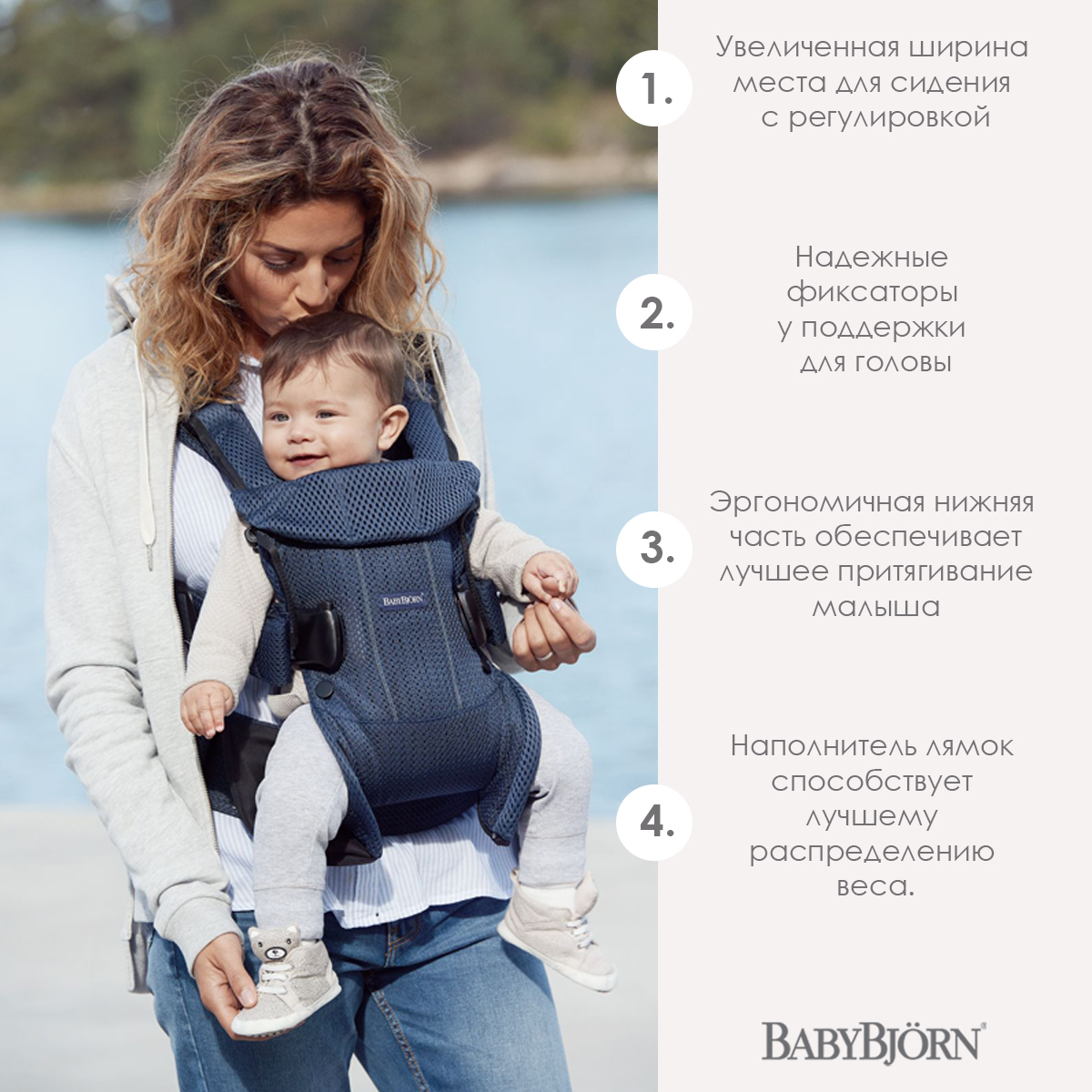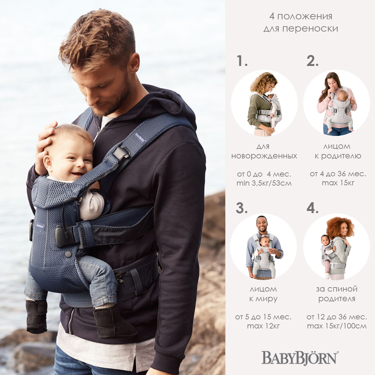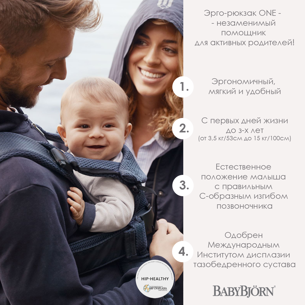 Эрго-рюкзак BabyBjorn One Mesh• Эргономичный, мягкий и удобный.• Предназначен для переноски детей с первых дней жизни до 3 лет (от 3,5 до 15 кг).• 4 положения для переноски ребенка: для новорожденных, лицом к родителю, лицом к миру, за спиной родителя.• Л
