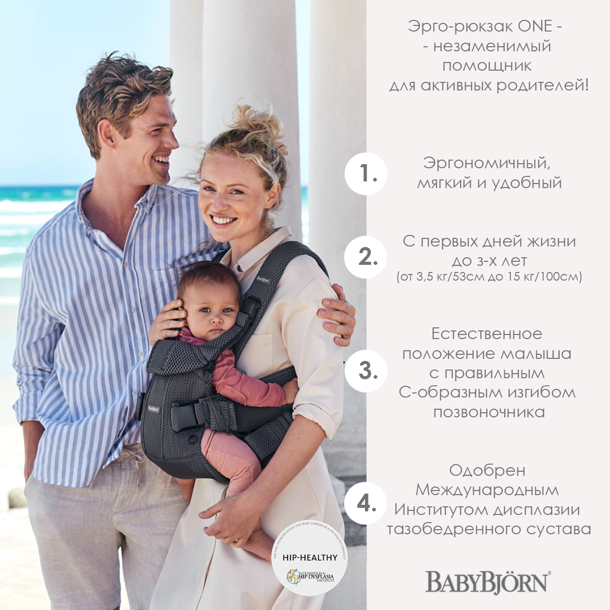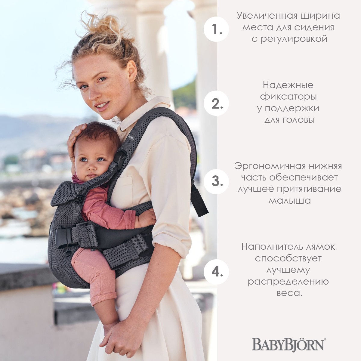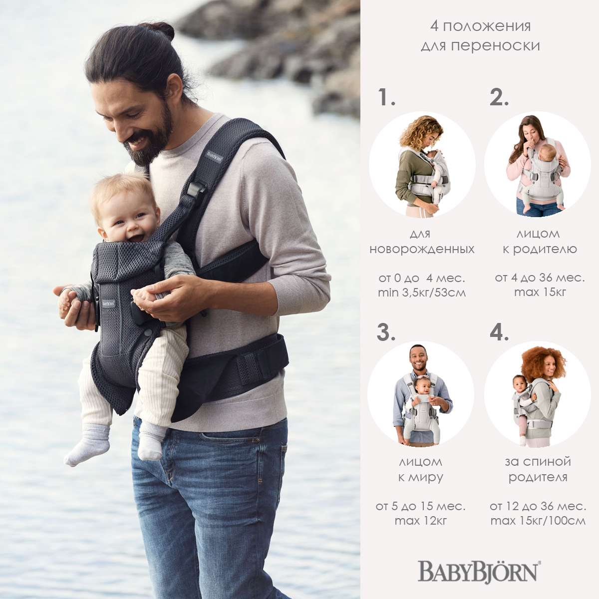Эрго-рюкзак BabyBjorn One Mesh· Эргономичный, мягкий и удобный.· Предназначен для переноски детей с первых дней жизни до 3 лет (от 3,5 до 15 кг).· 4 положения для переноски ребенка: для новорожденных, лицом к родителю, лицом к миру