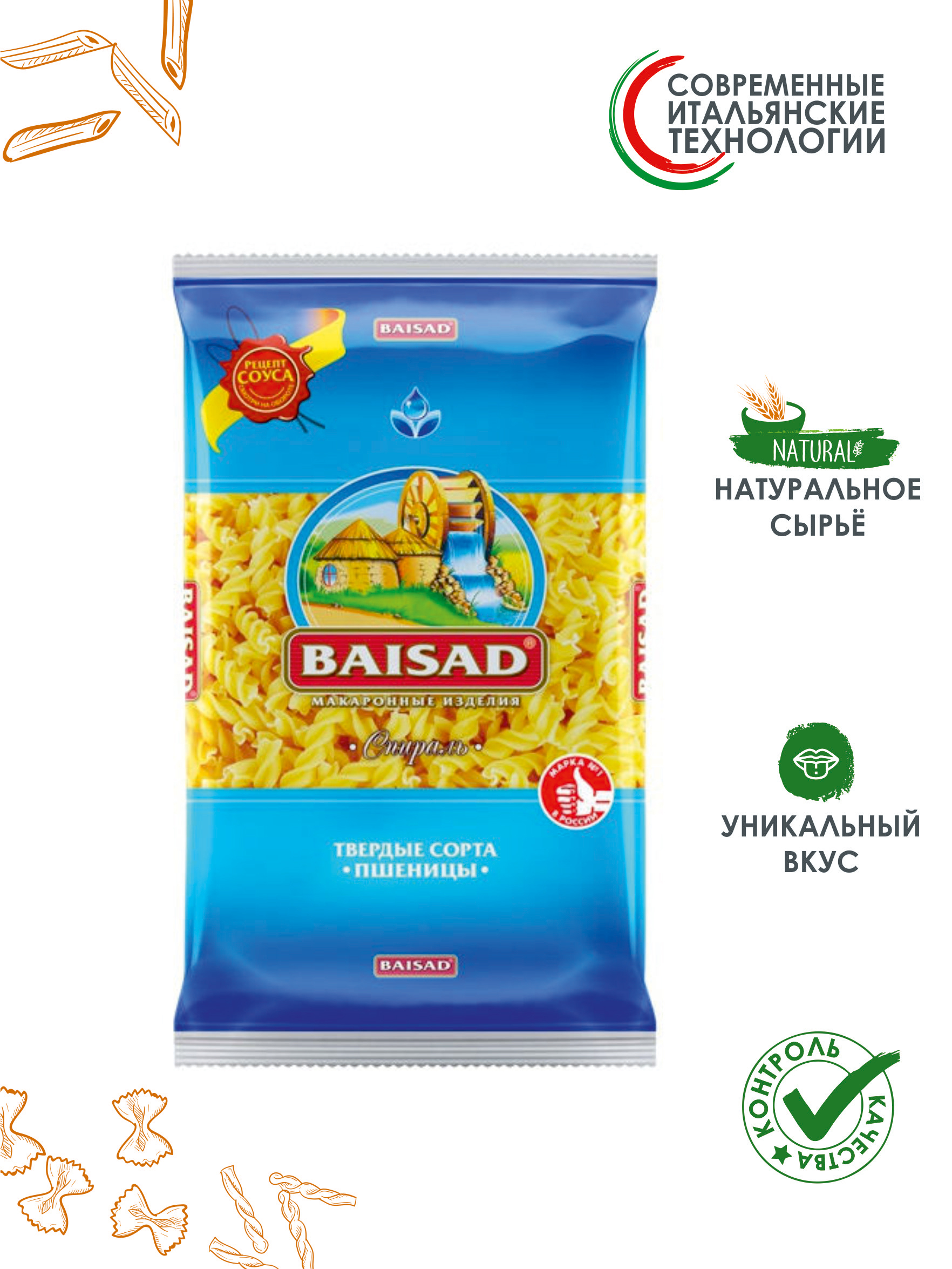 Условия хранения:В сухом местеОписание:Макароны группы А, приготовленные из тщательно отобранного зерна твёрдых сортов пшеницы, с использованием артезианской воды, полностью соответствующие европейским стандартам. Бренд BAISAD является обладателем семи Гр