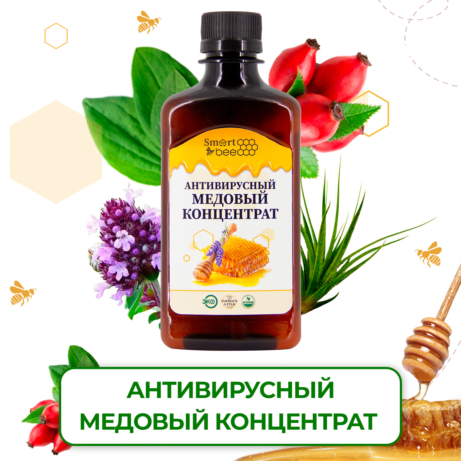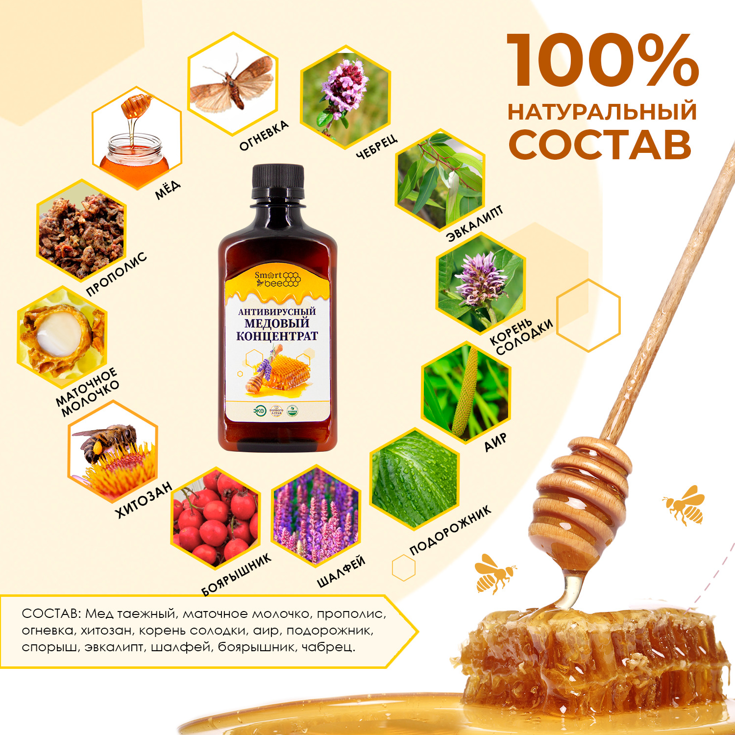 Состав:Мед таежный, маточное молочко, прополис, огневка, хитозан, корень солодки, аир, подорожник, спорыш, эвкалипт, шалфей, боярышник, чабрец.Способ применения:Способ применения: перед употреблением встряхнуть, 1 чайную ложку продукта растворить в 1 стак