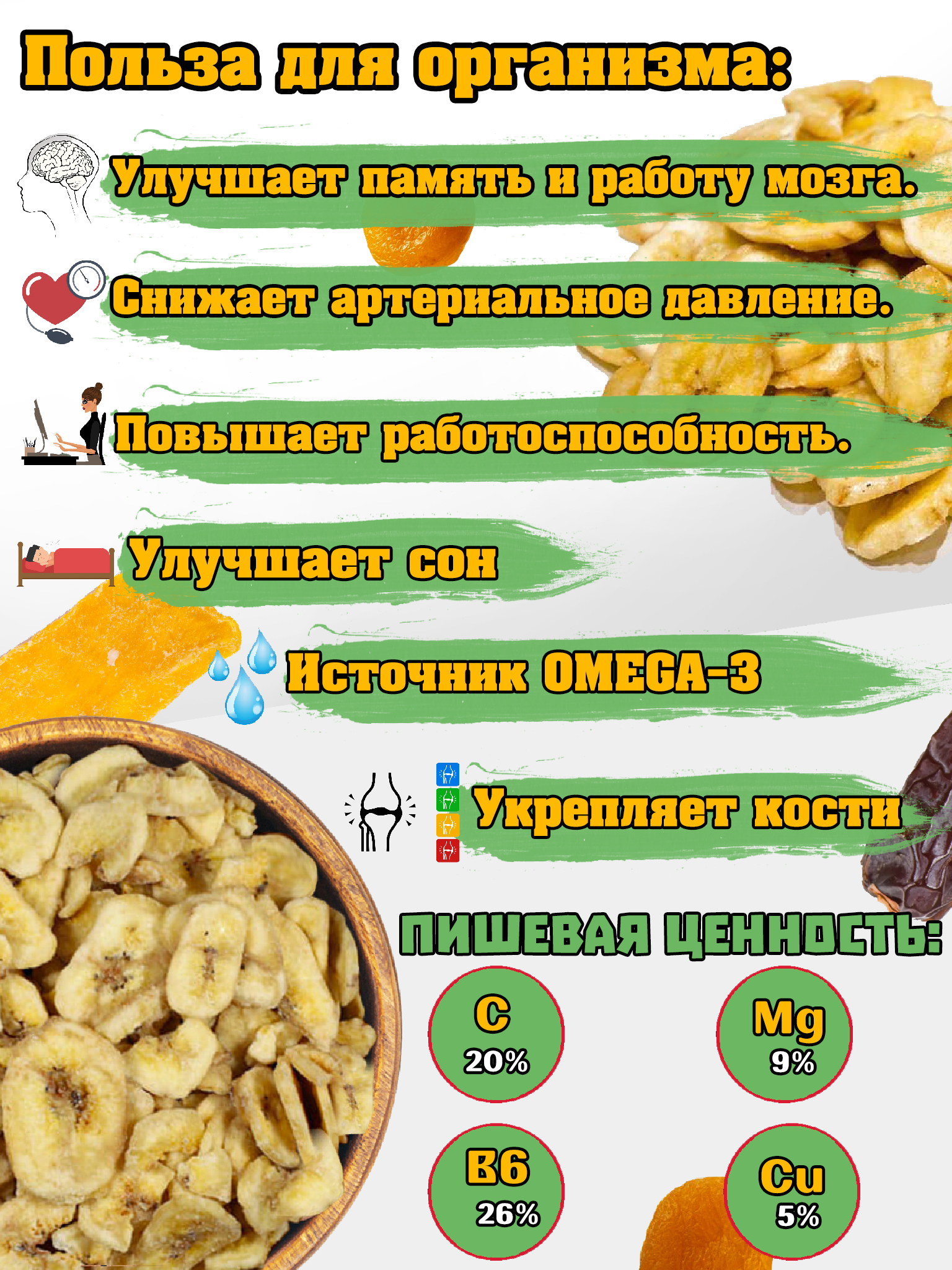 Банановые чипсы - хрустящие, в меру твердые и сладкие дольки натуральной мякоти банана.Бананы - это отличный помощник для работы нашего кишечника, улучшают качество крови, благотворно влияют на всю пищеварительную систему. Банановые снеки - способствуют х