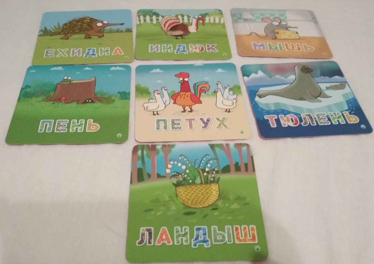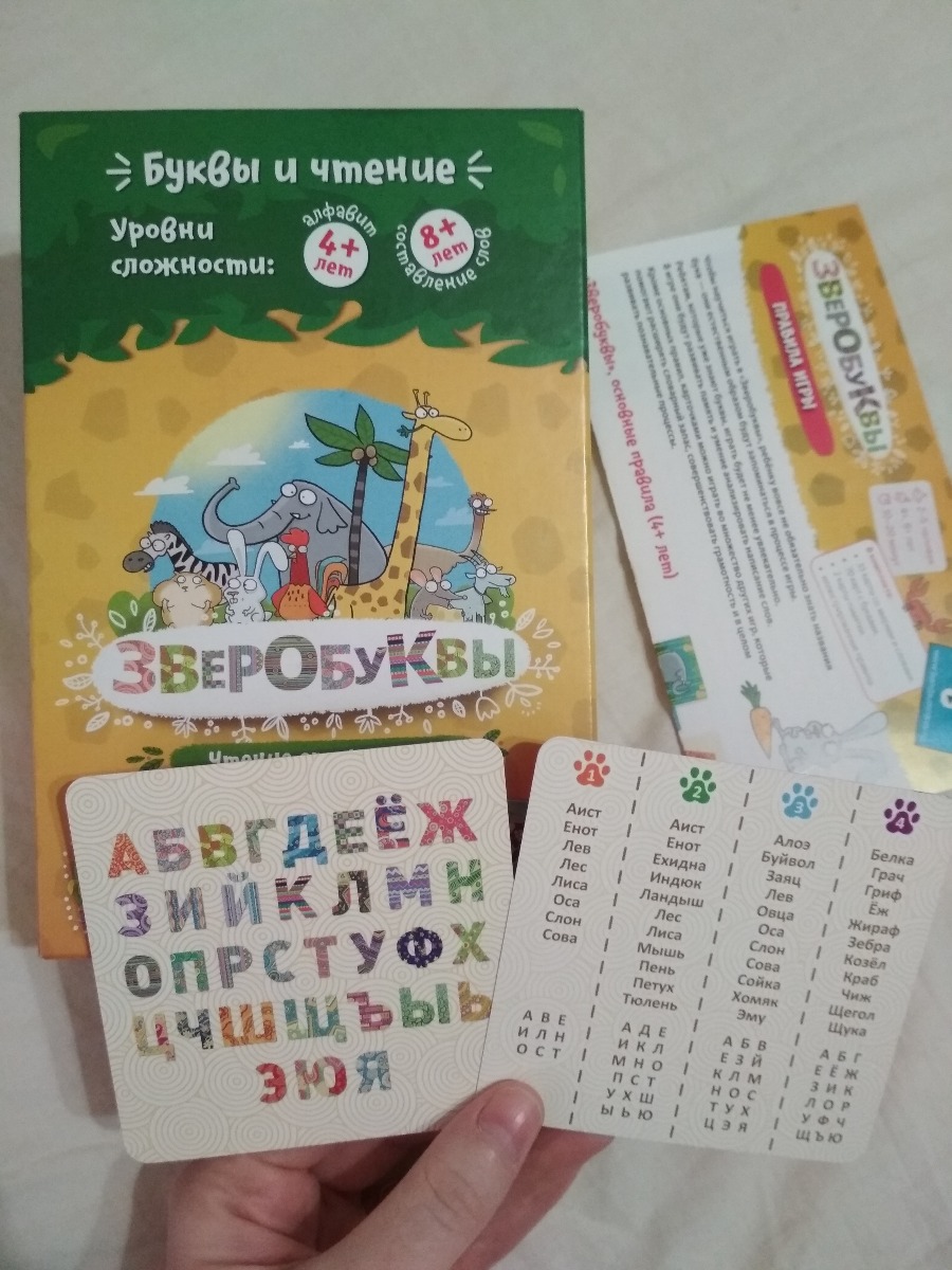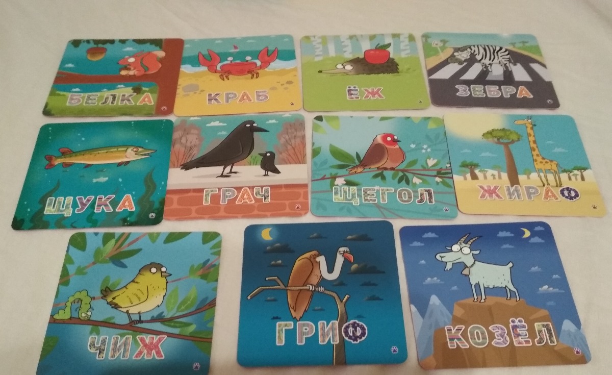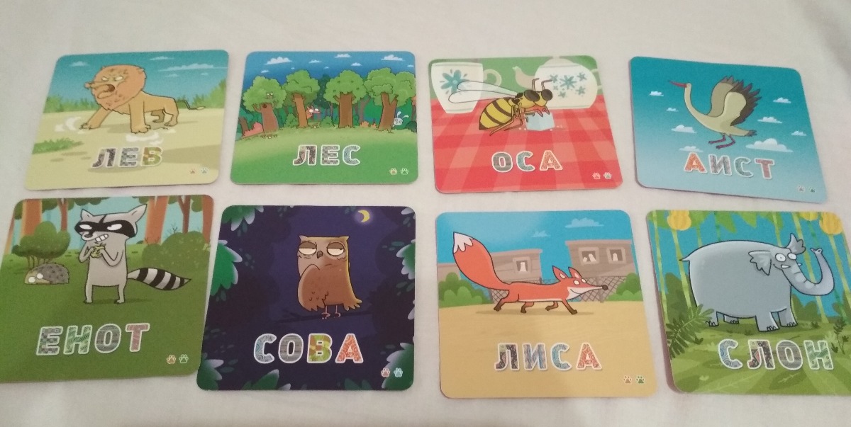 33 карты со зверями и словами, 70 карт с буквами, 2 карты-памятки, правила игры