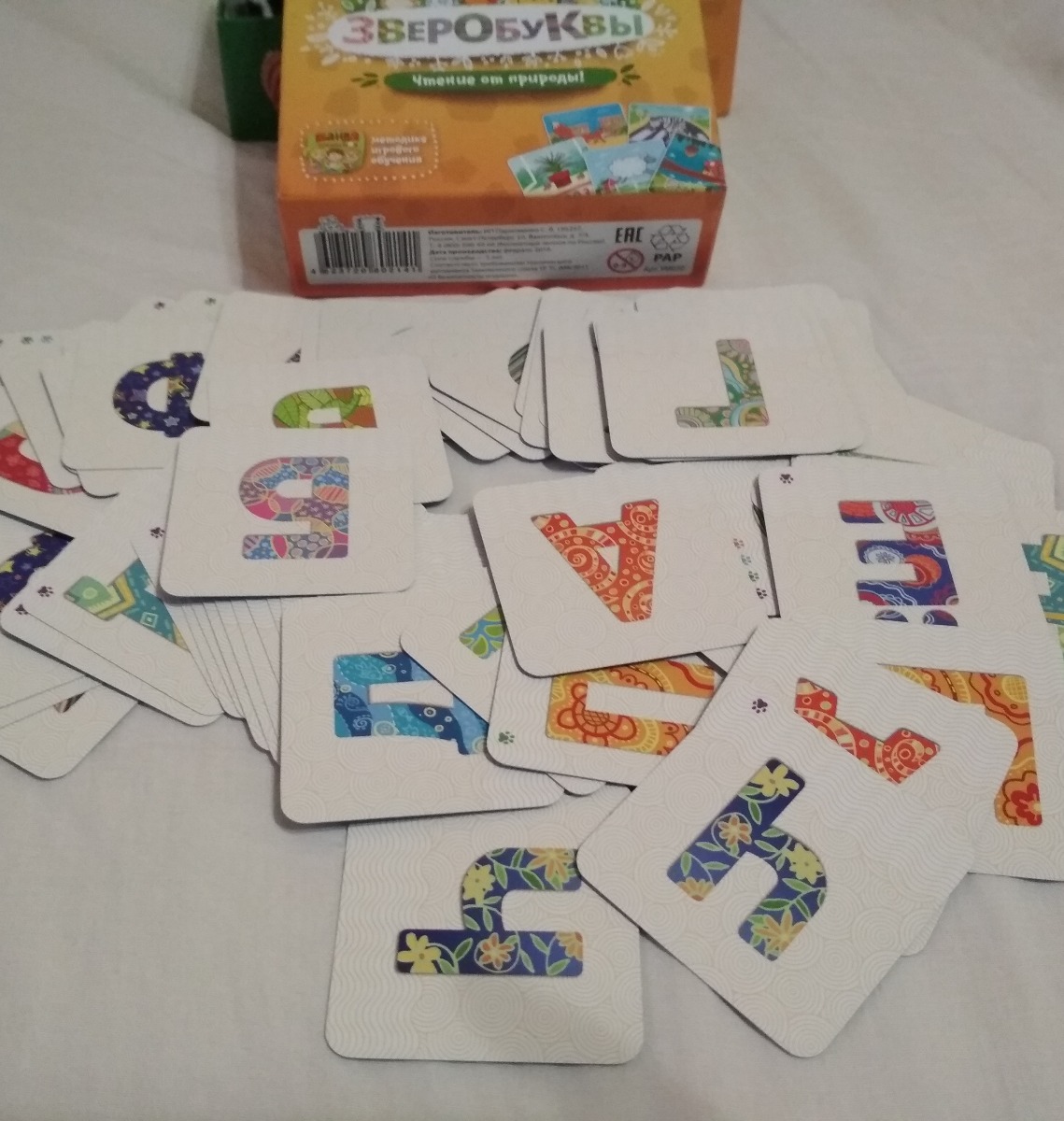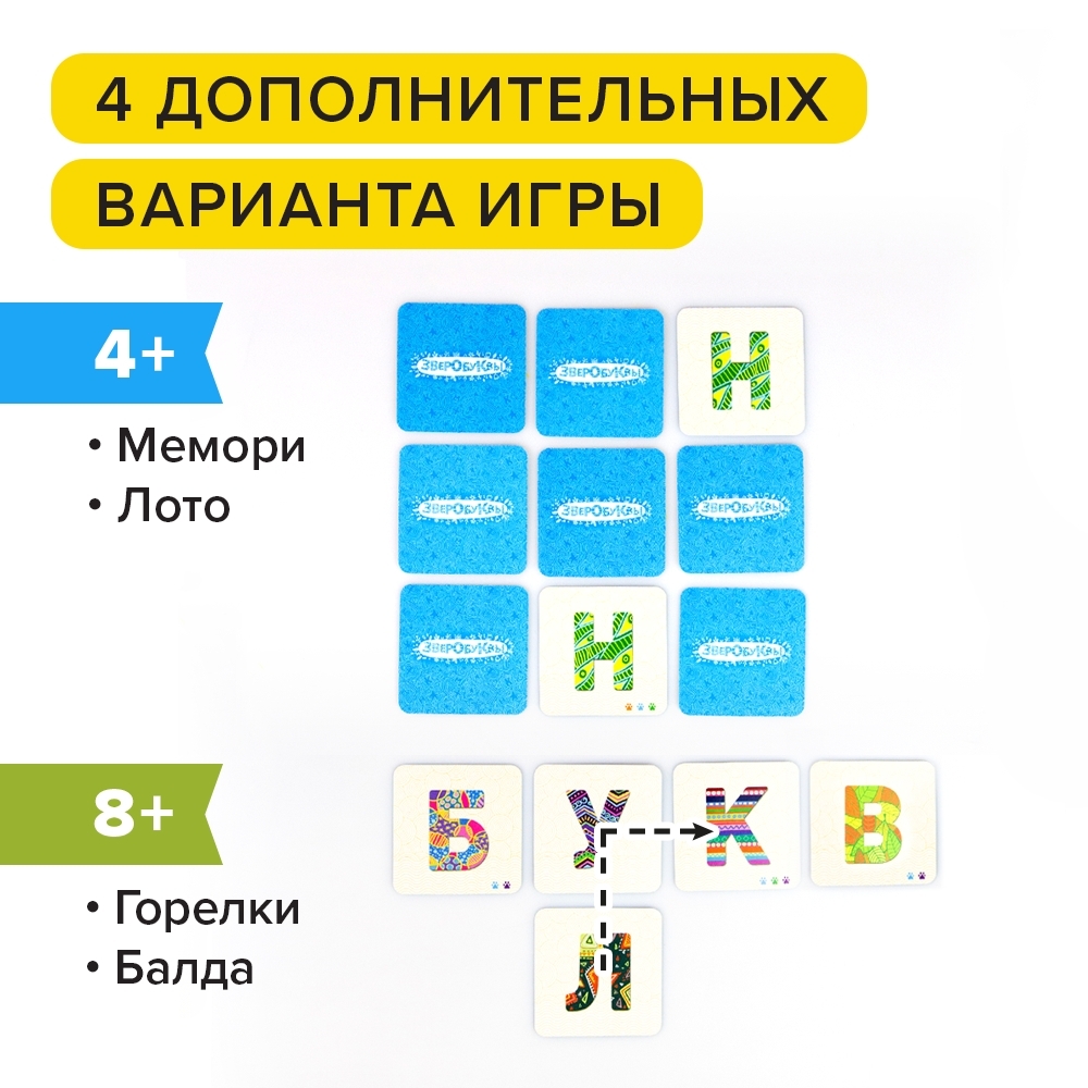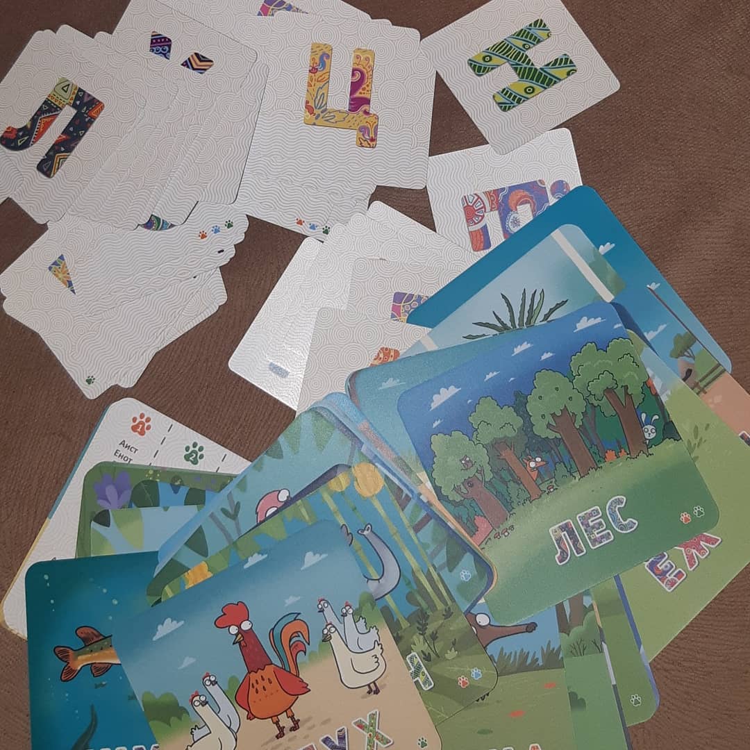 33 карты со зверями и словами, 70 карт с буквами, 2 карты-памятки, правила игры