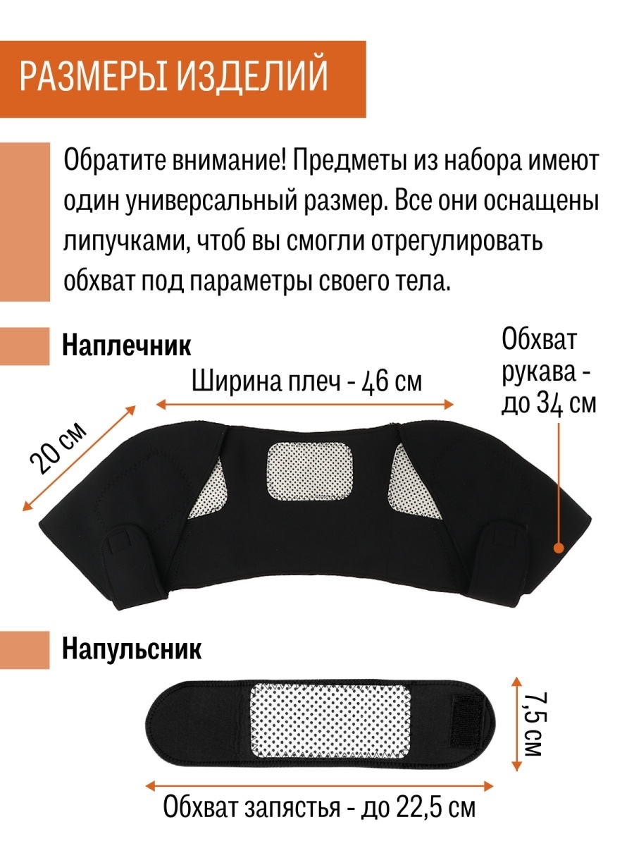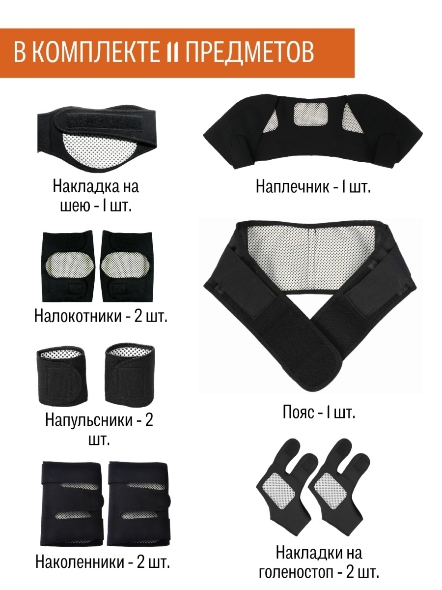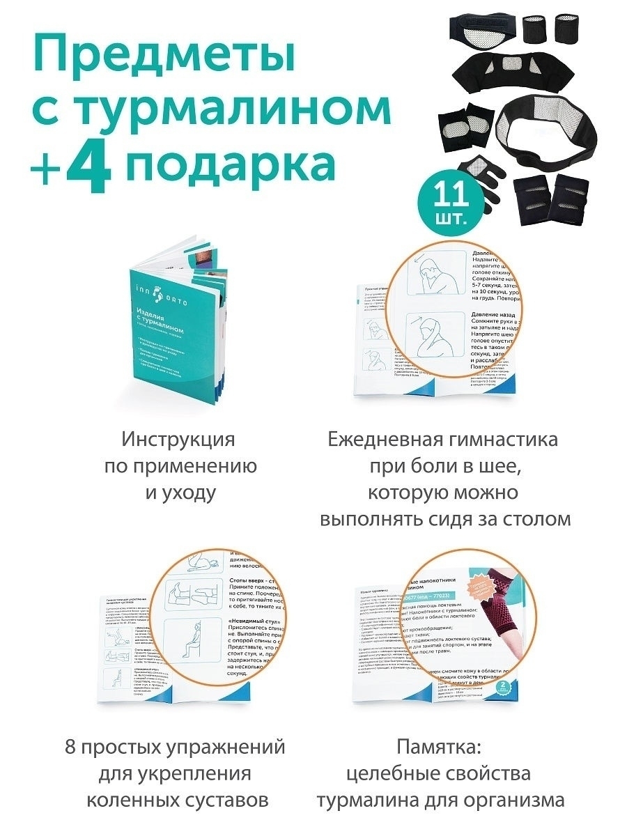 Набор из 11 турмалиновых предметов "Здоровые суставы" с прогревающим эффектом уникален своей комплектацией: он включает в себя бандажи с турмалином для всех зон организма. Они прогревают мышцы и суставы, снимают боль и напряжение в теле, помогают при артр