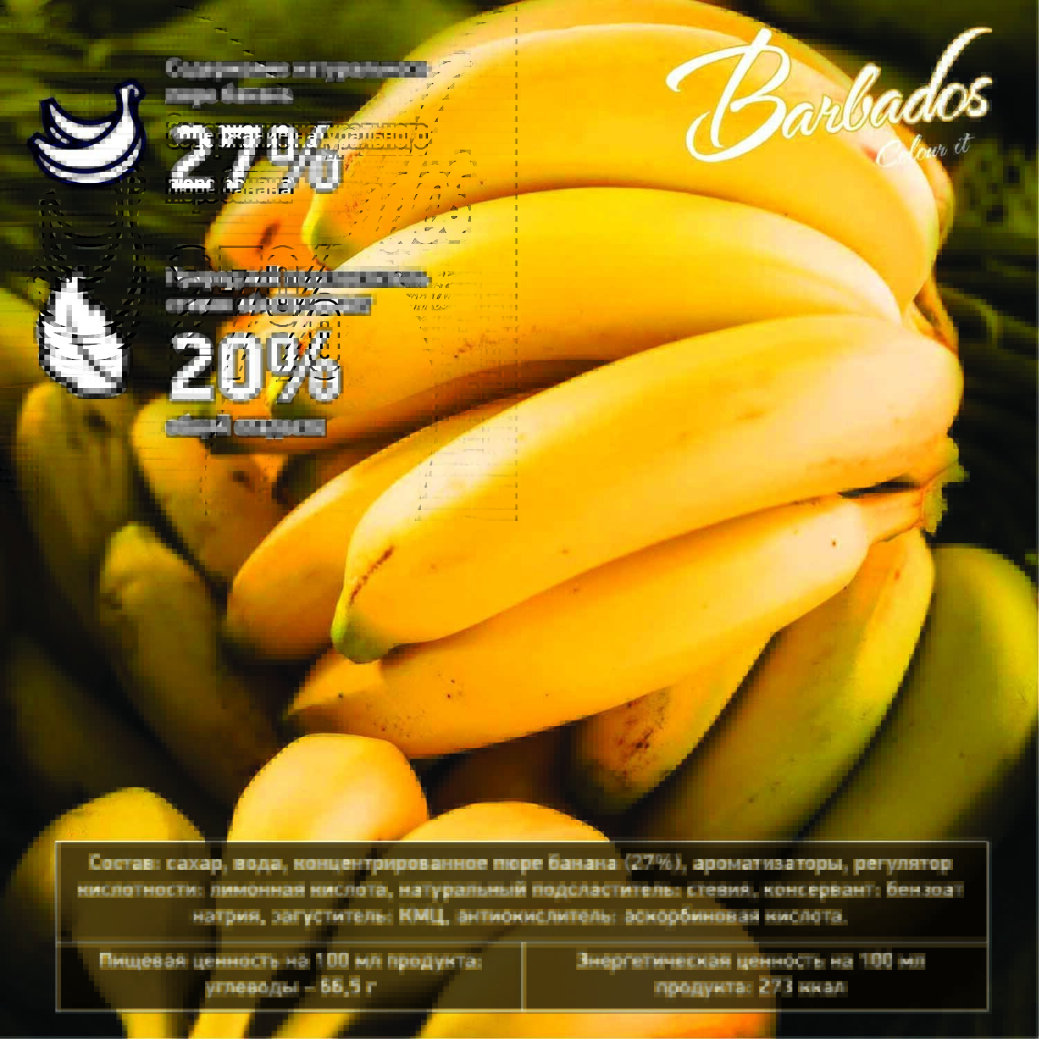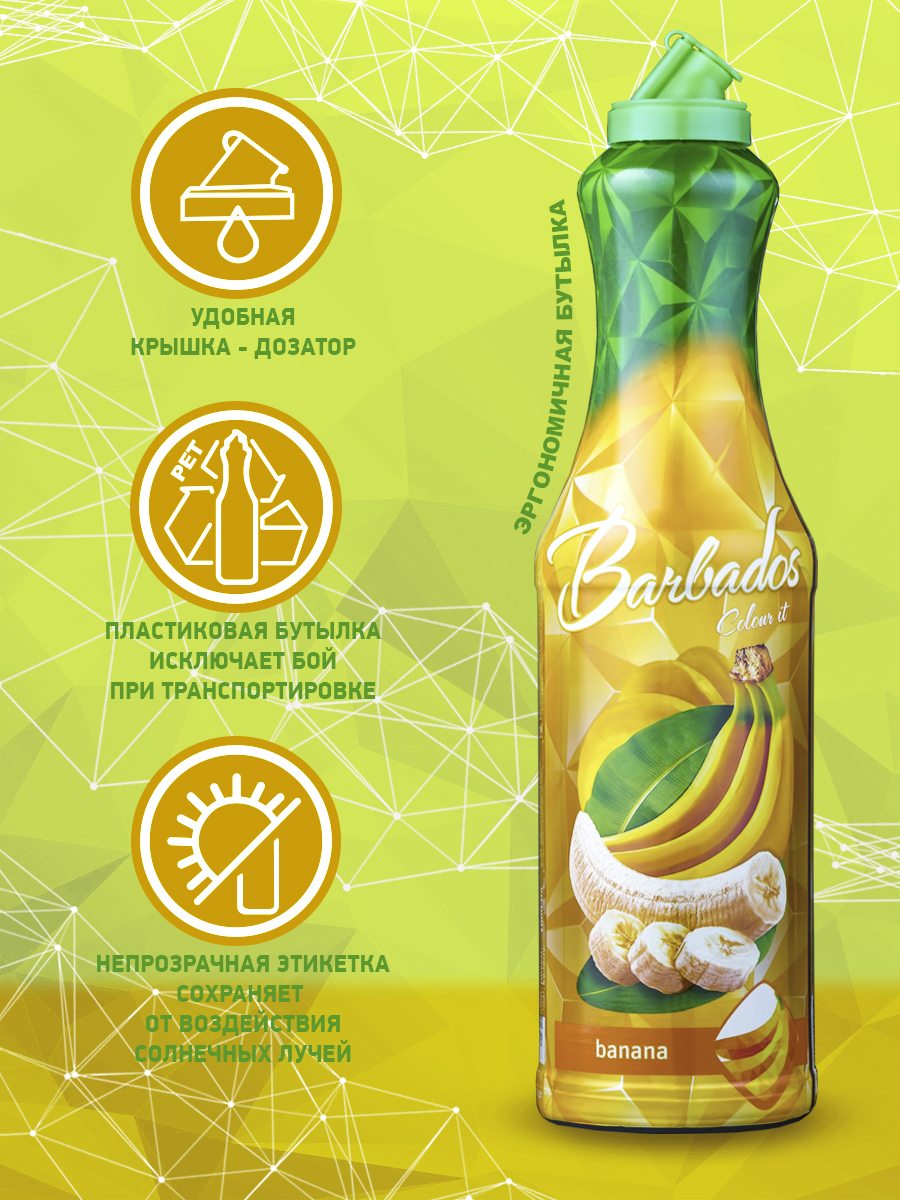 Условия хранения:Хранить при температуре от 0°С до +25°С и относительной влажности не более 75%. Вскрытую бутылку хранить при температуре не более 25°С, не более 2 месяцев.Состав:сахар, вода, концентрированное пюре банана, ароматизаторы, регулятор кислотн