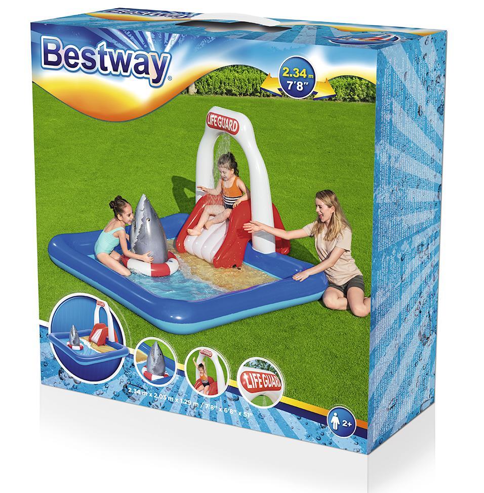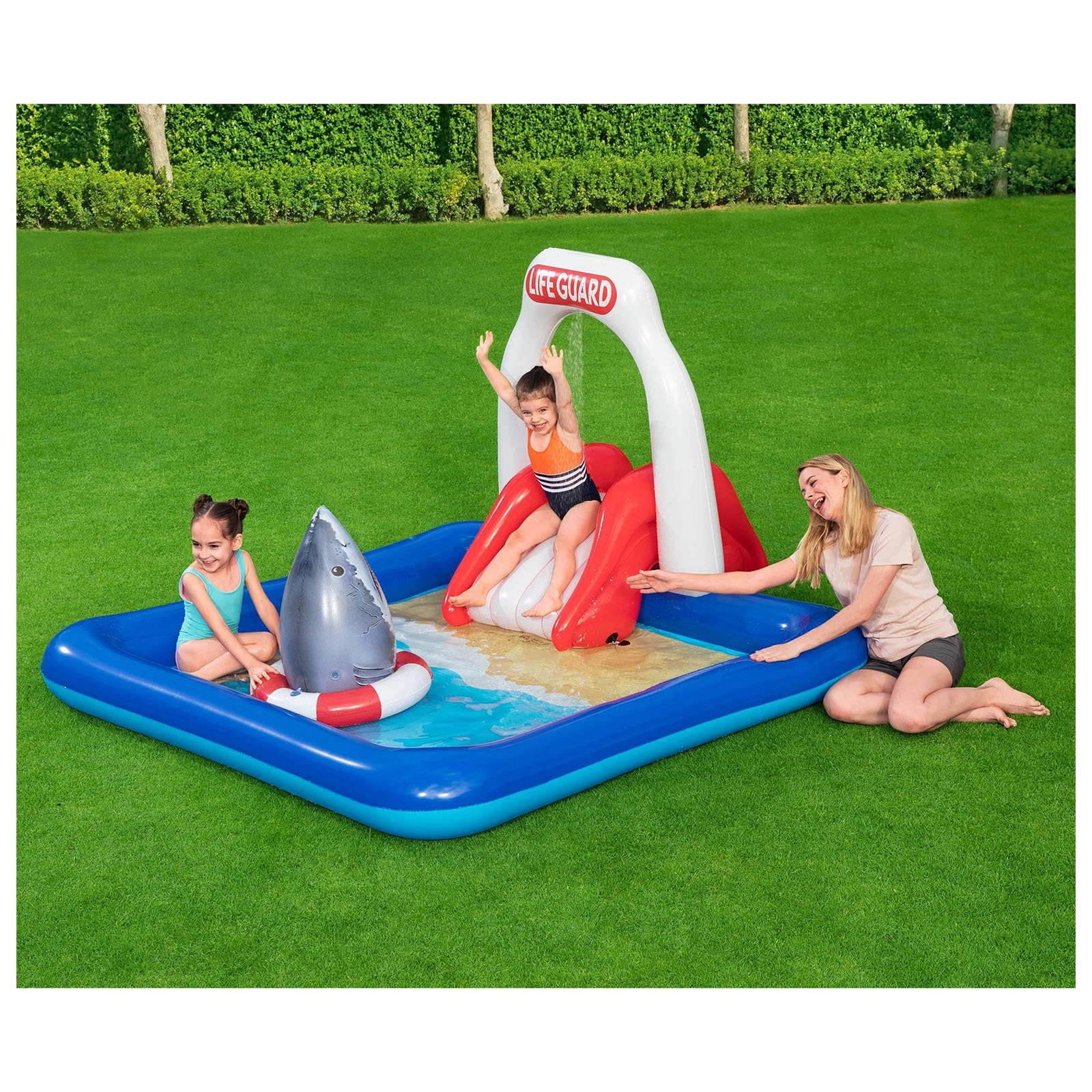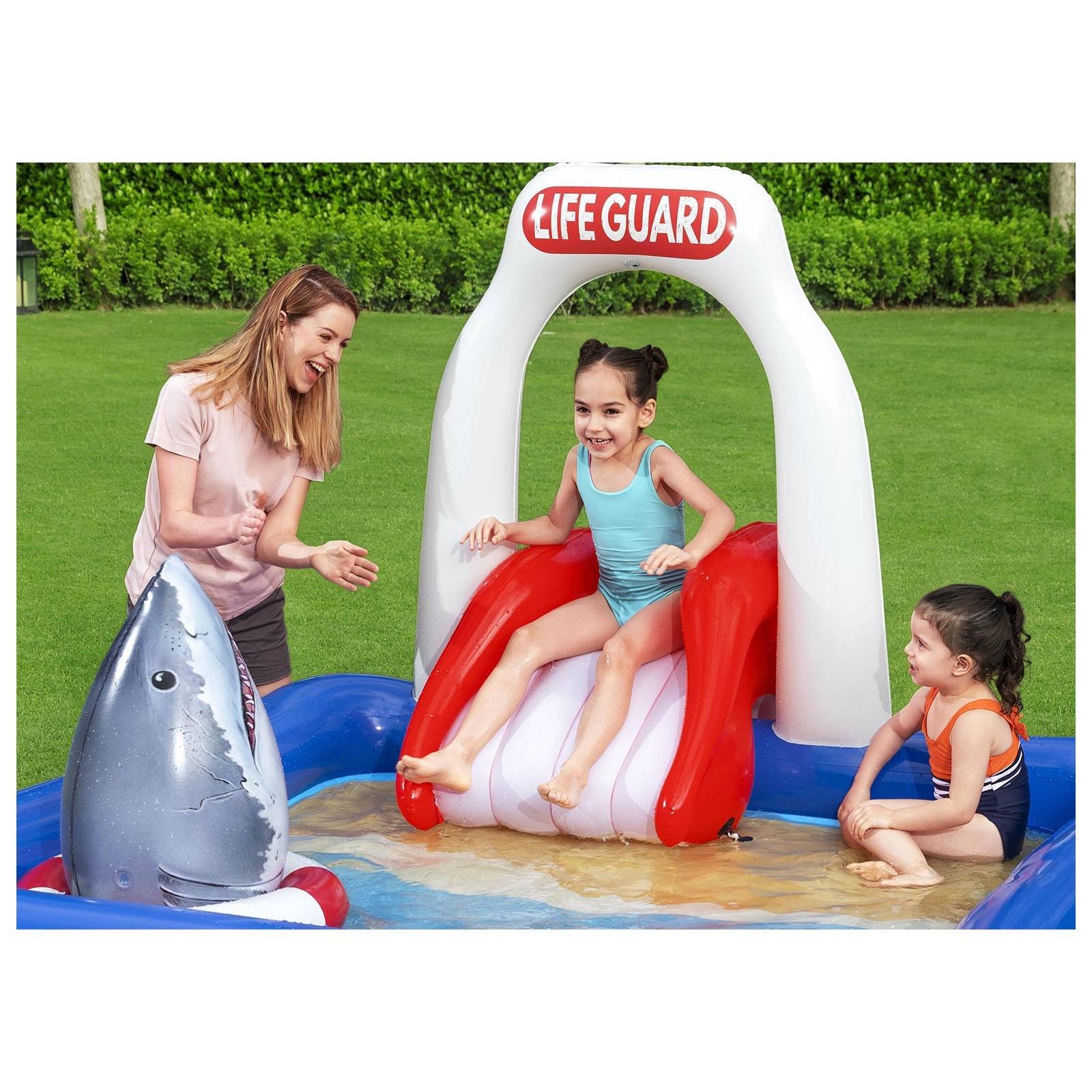 Комплектация: 1. Бассейн 2. Надувная неваляшка «Акула» 3. Горка 4. Ремонтная заплатаОписание:Детский надувной бассейн с игровым центром Bestway предназначен для активных игр детей в возрасте от 2-х лет. Игровой центр изготовлен из прочного испытанного вин