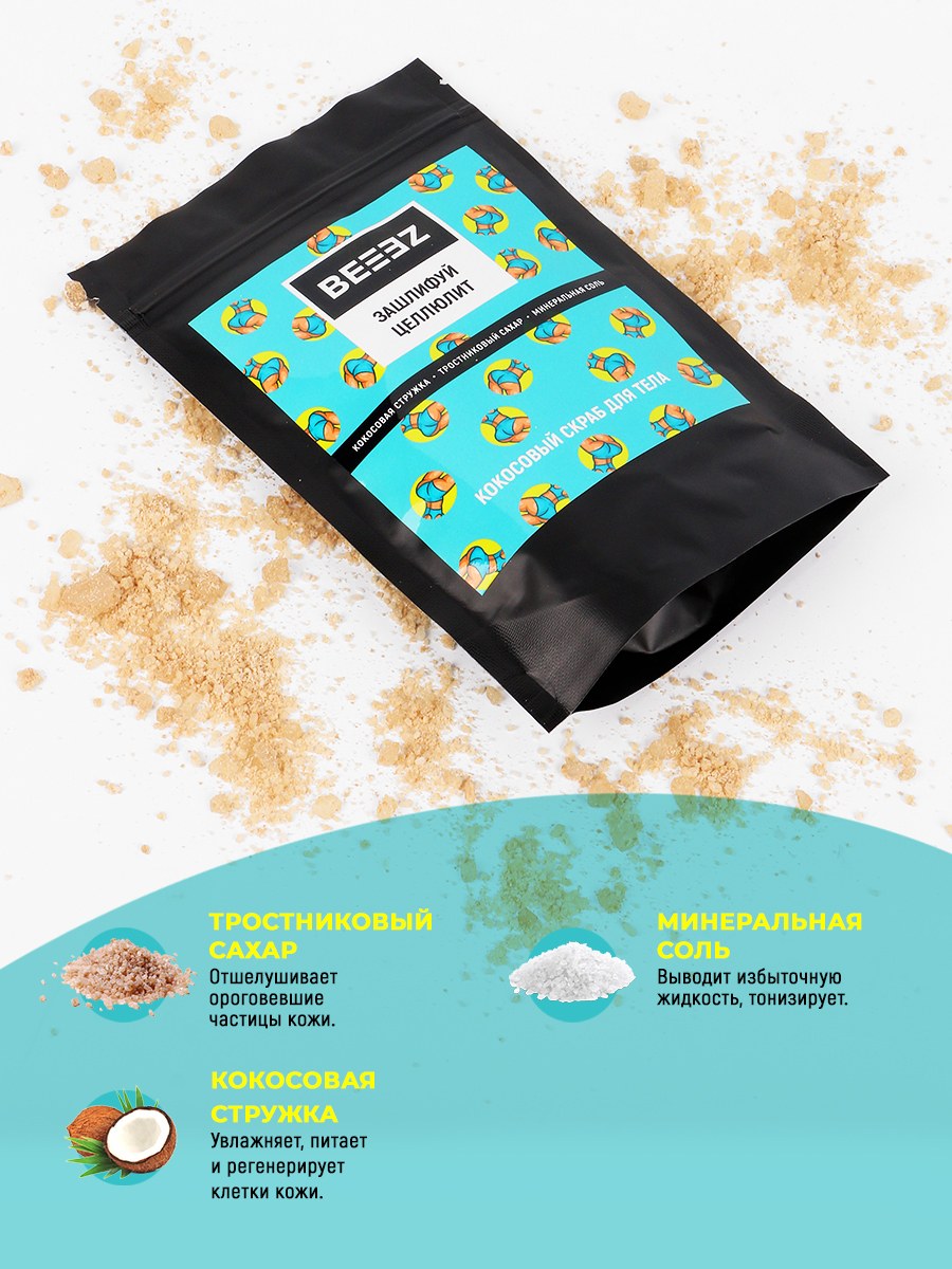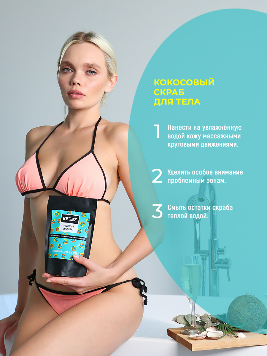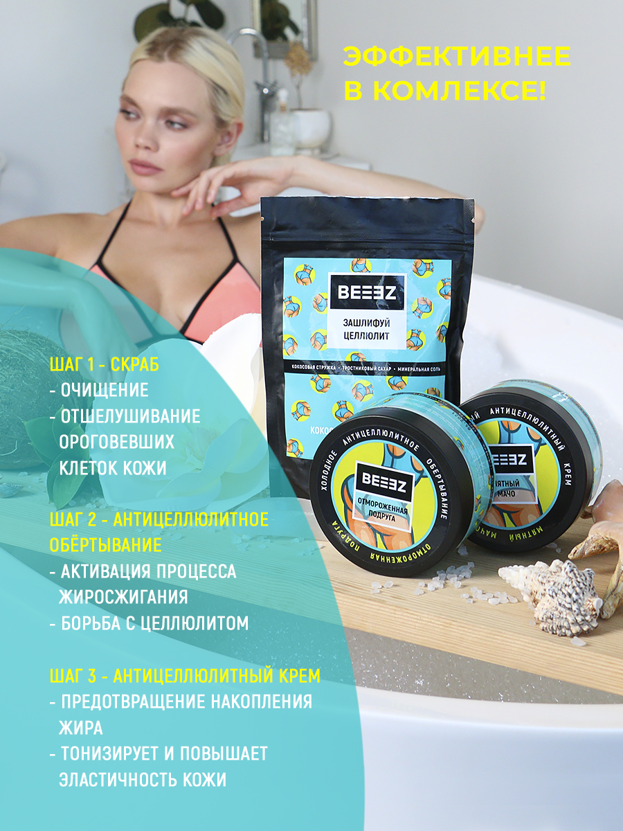 Способ примененияНанести скраб на предварительно очищенное и увлажненное тело массажными круговыми движениями, уделяя внимание проблемным зонам. По завершению смыть остатки скраба теплой водой. Для максимального эффекта использовать в комплексе с обертыванием BEEEZ.