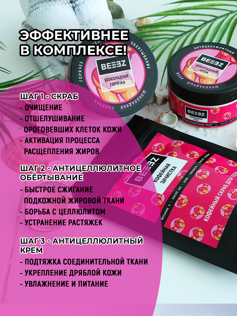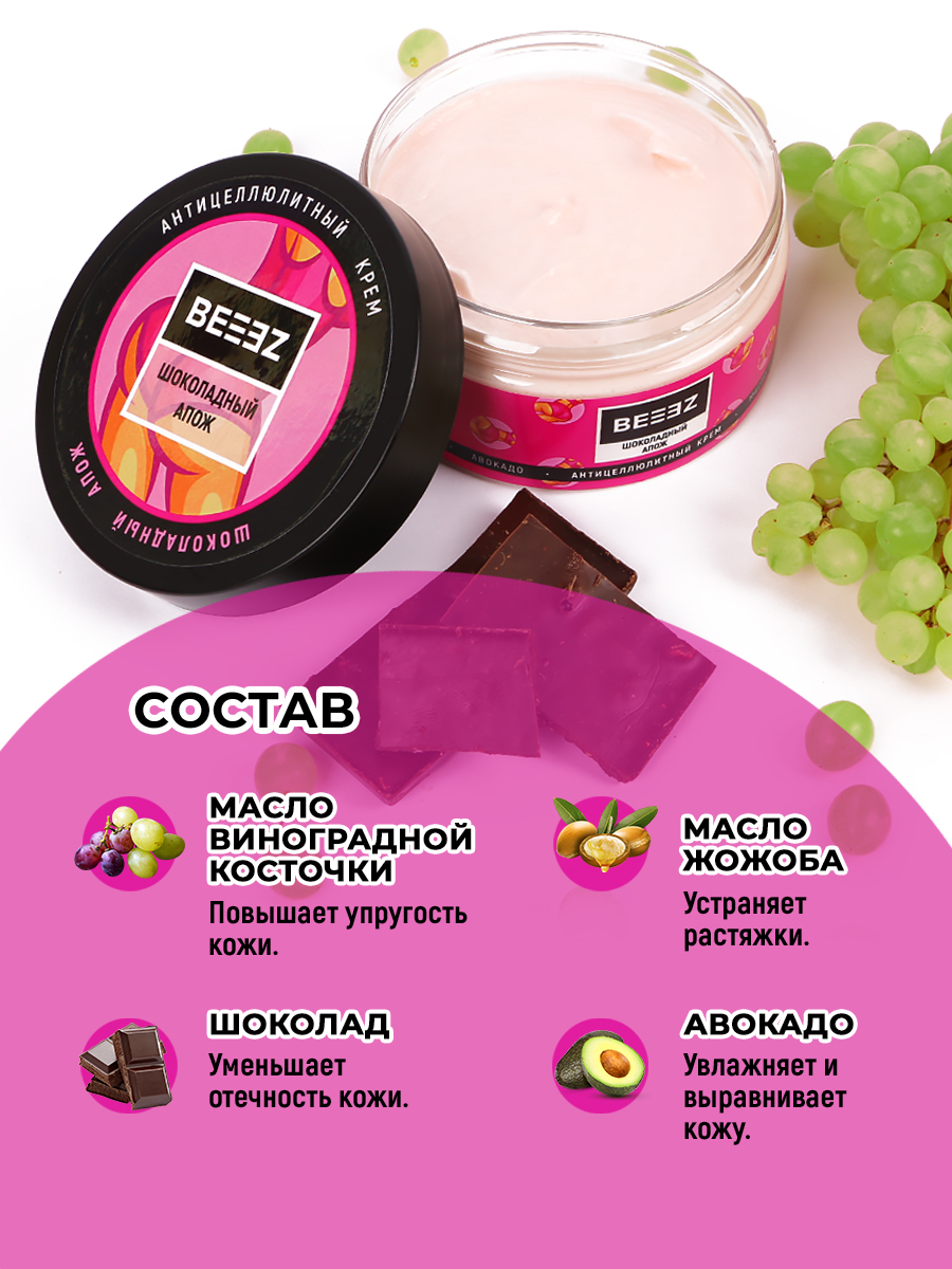 Антицеллюлитный крем BEEEZ "Шоколадный апож" усиливает подтяжку соединительной ткани, укрепляет дряблую кожу, улучшает припухшие линии тела, делая их эластичными, утонченными и очаровательными. Согревающие кожу вещества,содержащиеся в антицеллюлитном крем