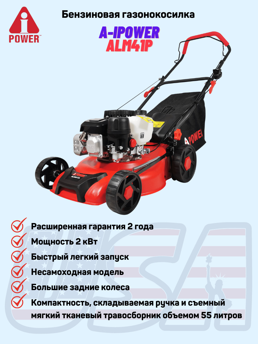 Комплектация:1. Газонокосилка в сборе - 1 шт. 2. Рукоятка верхняя часть - 1 шт. 3. Рукоятка нижняя часть - 1 шт. 4. Фиксатор рукоятки - 1 шт. 5. Травосборник - 1 шт. 6. Инструкция по эксплуатации - 1 шт. 7. Свечной ключ - 1 шт.