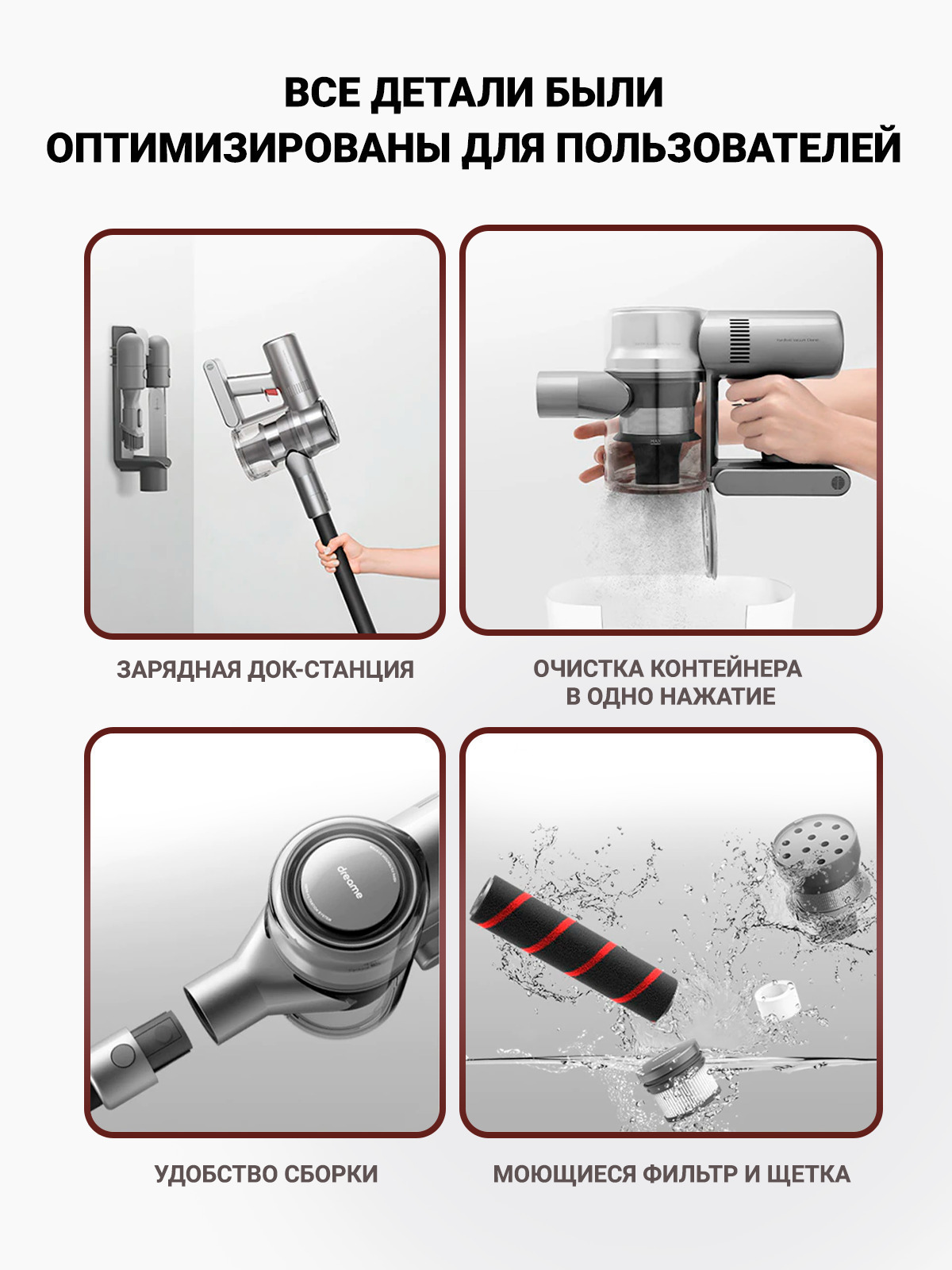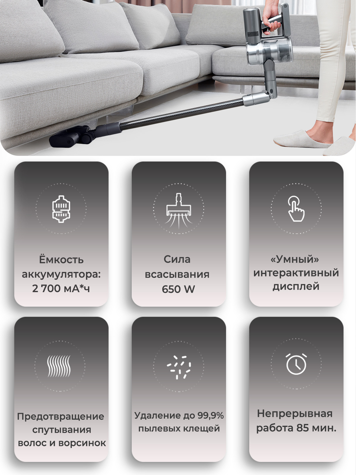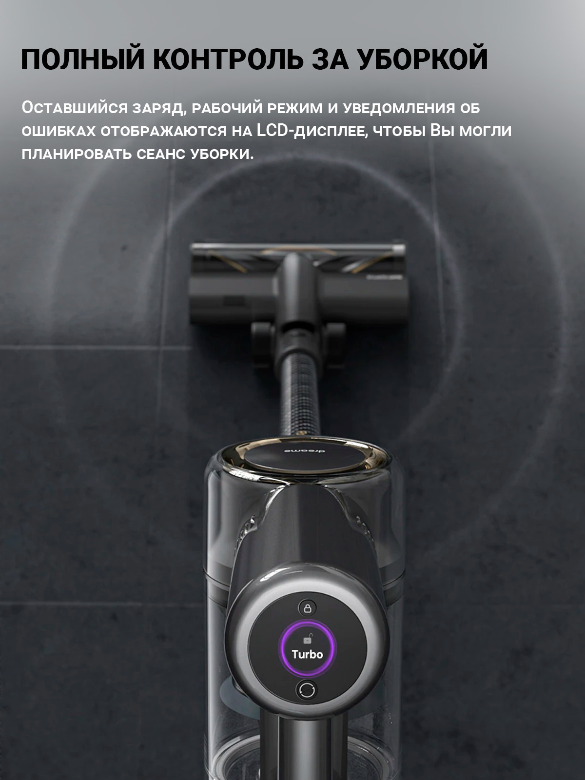 ОсобенностиВертикальная парковка, Регулировка мощности, Управление на рукоятке, Насадка с LED подсветкой, Светодиодный дисплей, Индикатор заполнения пылесборника, Контейнер для насадок