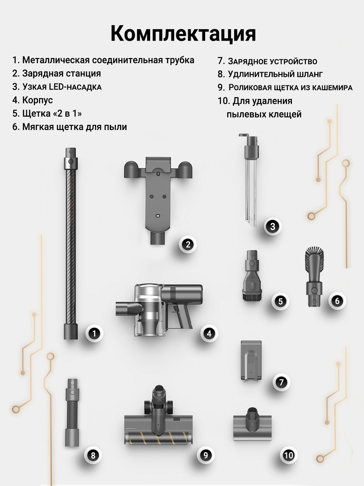 Насадки пылесосаДля мебели, Щелевая насадка, Для уборки пыли, Для уборки пола, Для ковра, Насадка с LED подсветкой, Моторизованная турбощетка, Гибкая щелевая насадка, Для матрасов