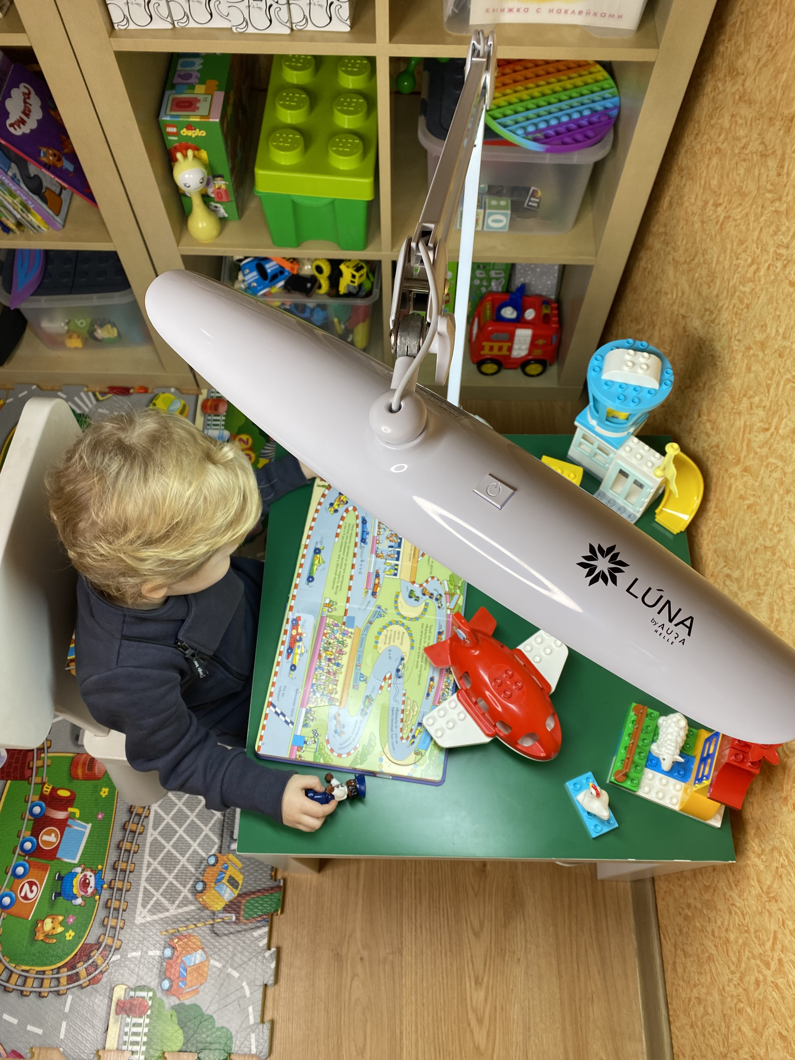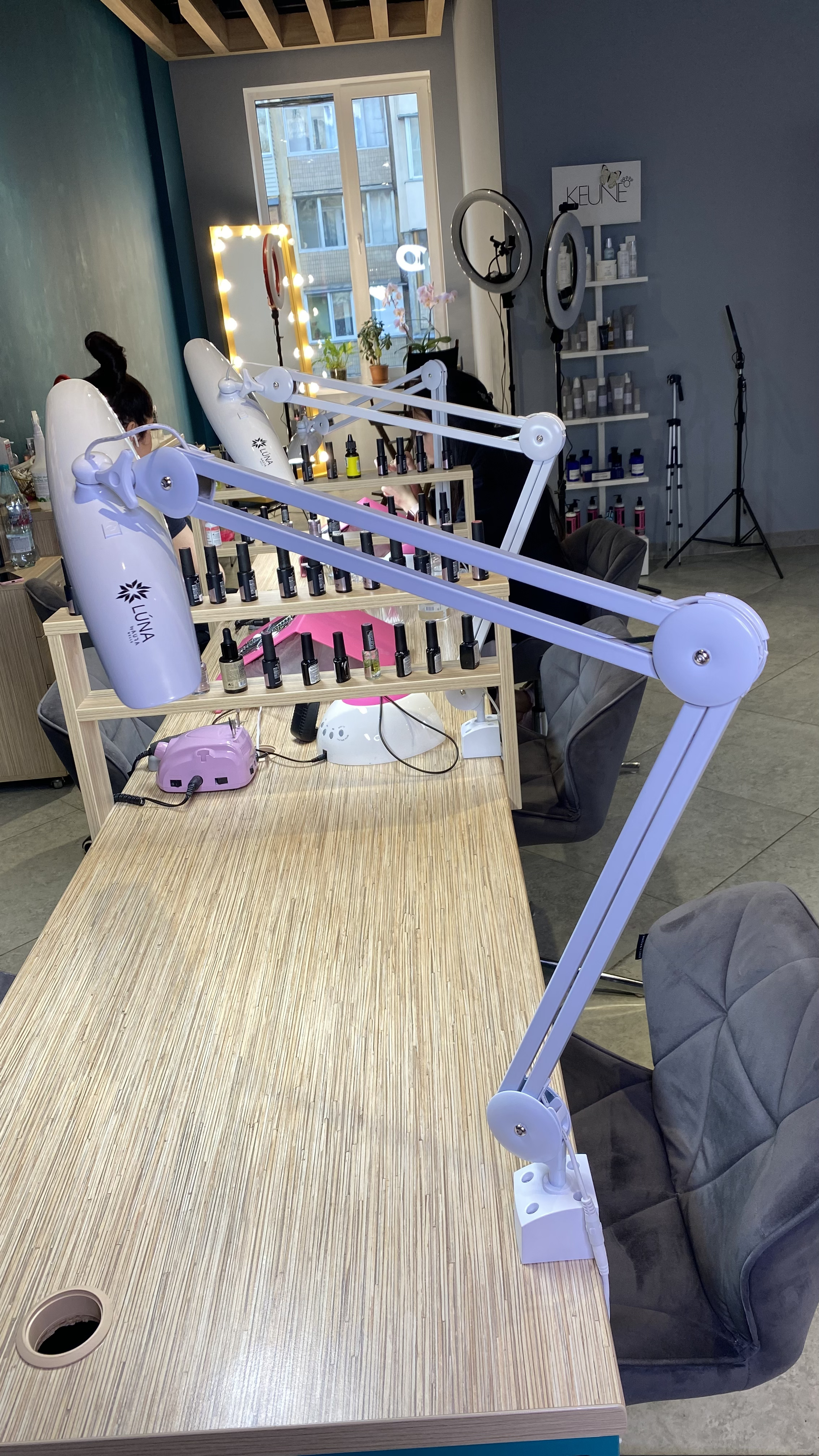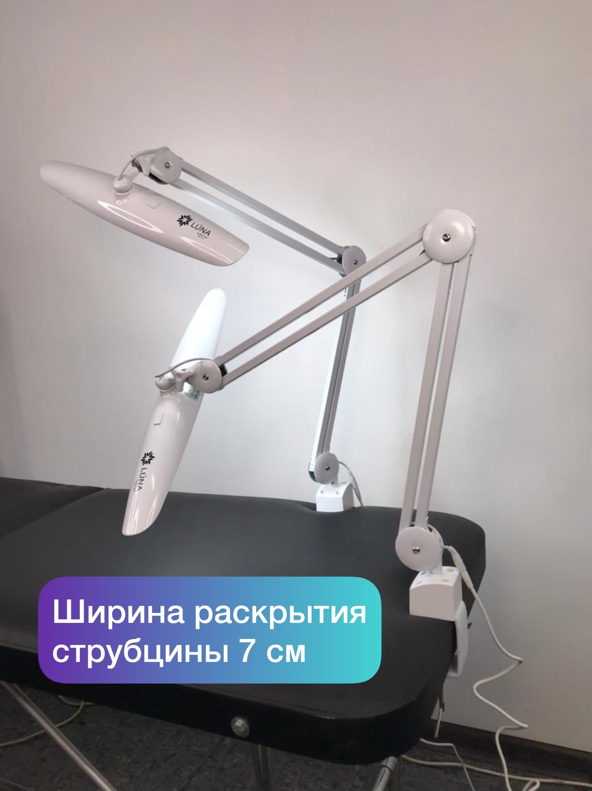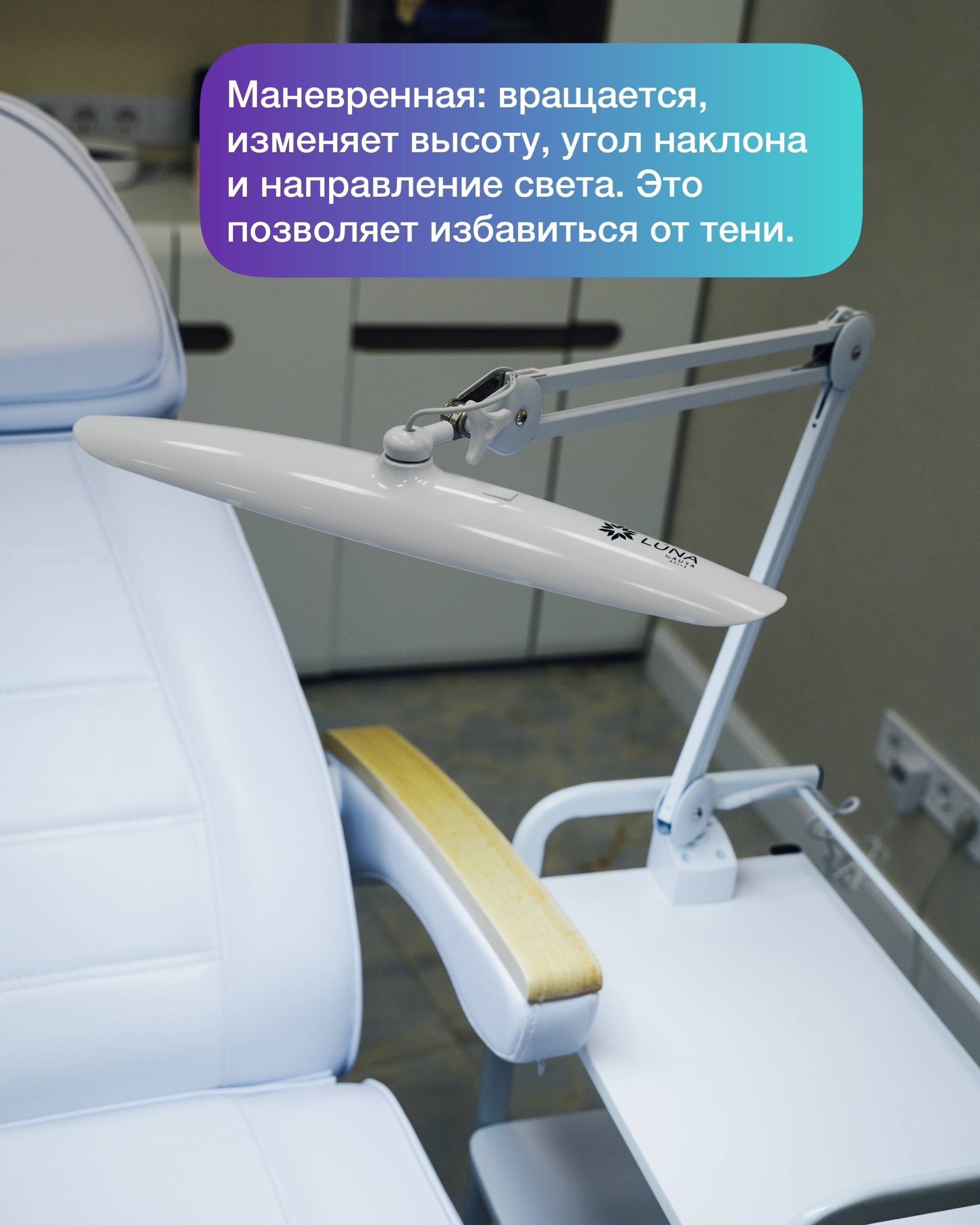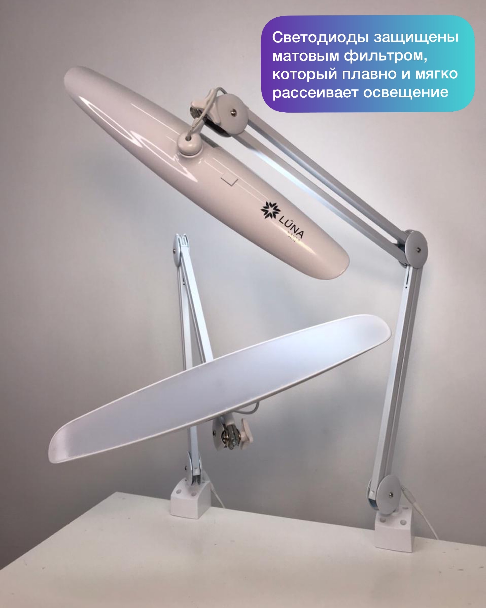 Лампа Aura Helle LUNA захватывает всю ширину кушетки и освещает равномерно даже за пределами ее границ!Длина светильника 50 см, доп размеры указаны на фото.Лампа LUNA ( заводское название 9501 LED, LED 117) крепится на стол или кушетку металлической струб