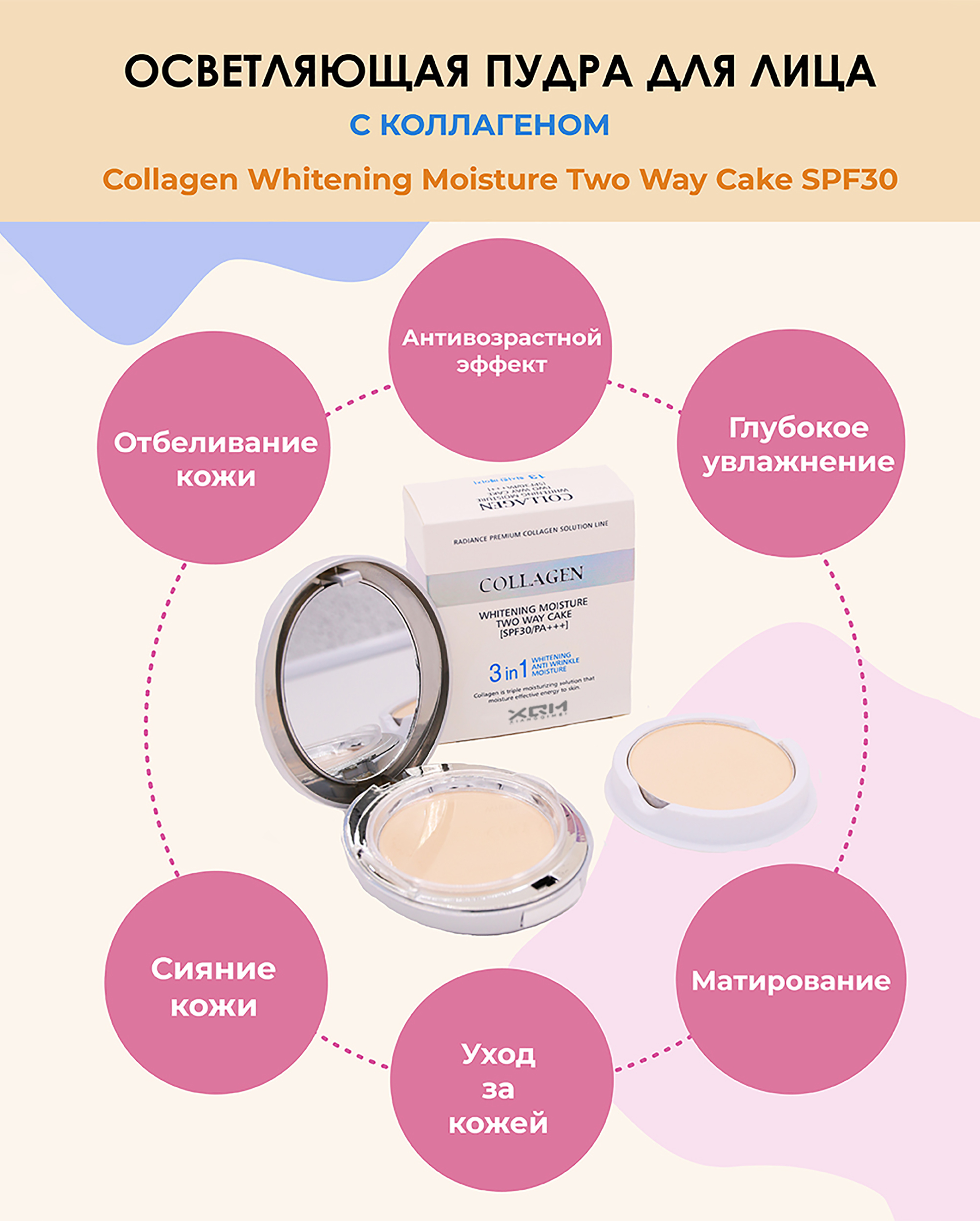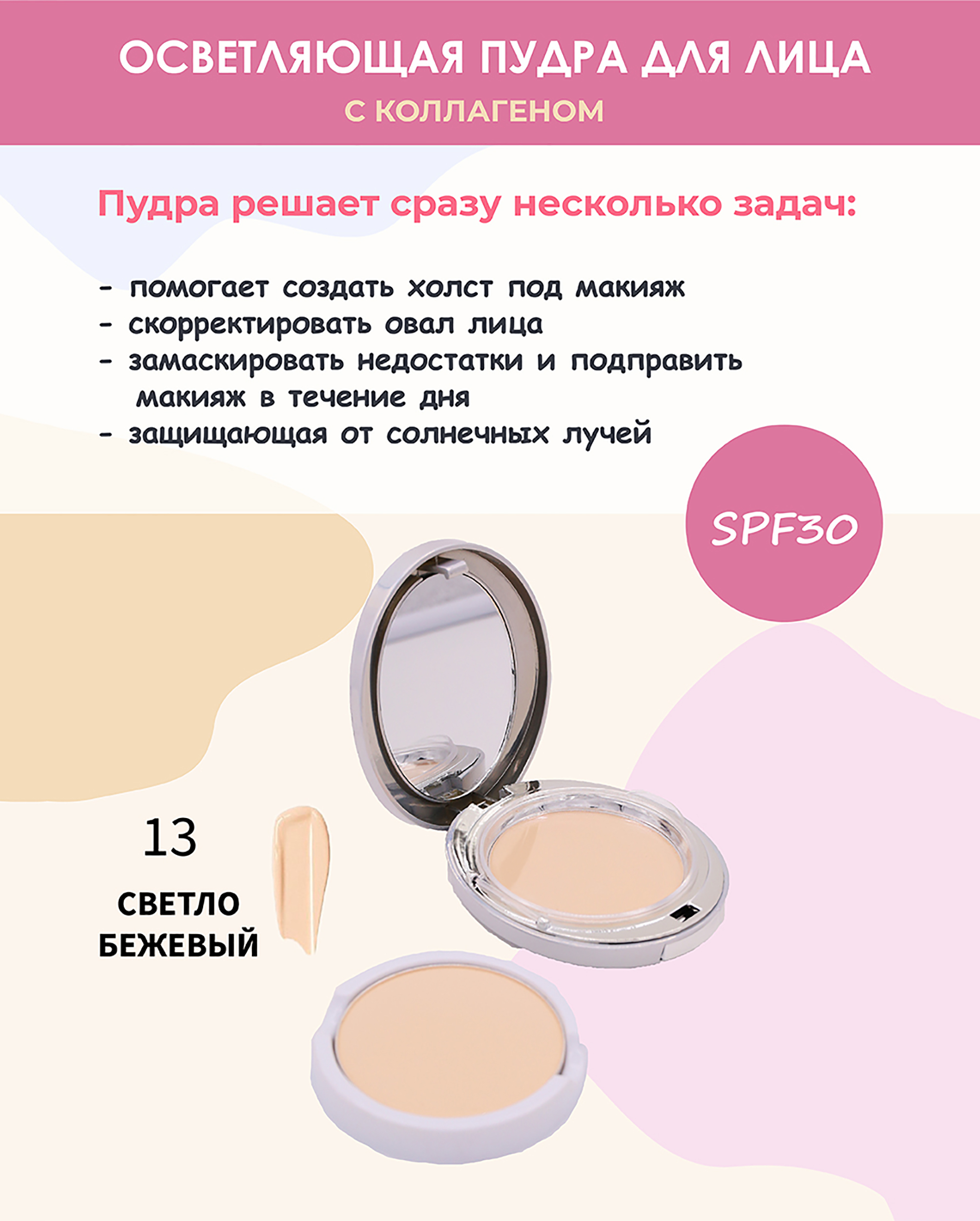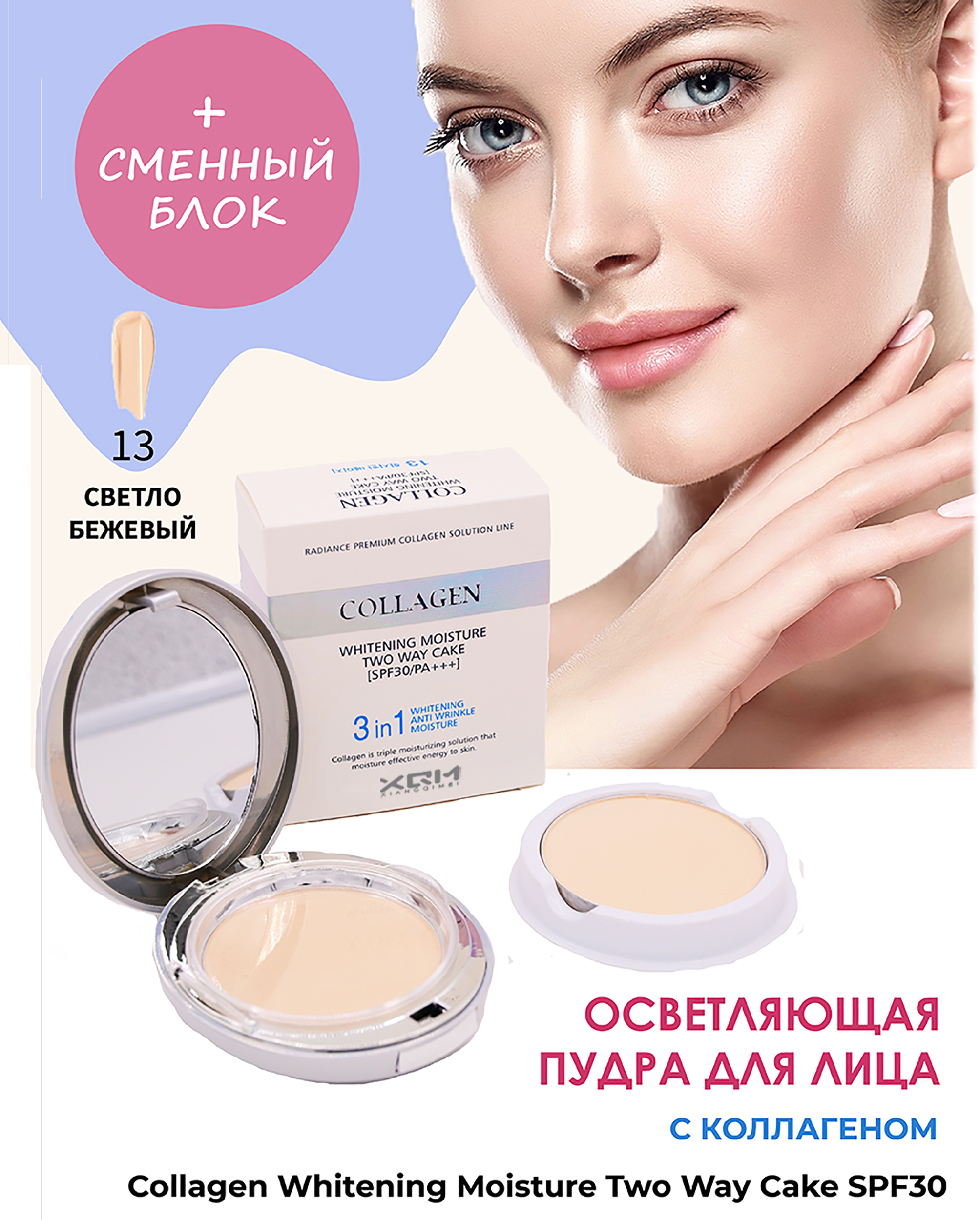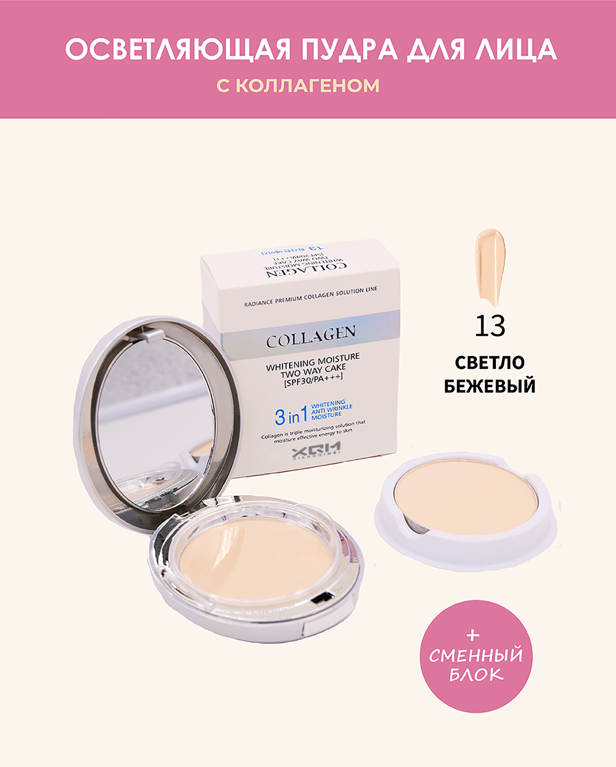 Пудра компактная с коллагеном XQM, 3 в 1, тон № 13, светло-бежевый. Подходит для всех типов кожи. Благодаря своему составу пудра обеспечивает эффект увлажнения, осветления и омоложения. Присутствие коллагена способствует повышению упругости и эластичности