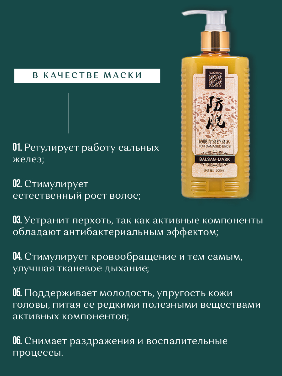 Бальзам - маска для волос «Biofollica» с гингеролом и высокоэффективными компонентами, используемыми в традиционной китайской медицине, стимулирует естественный рост волос, питает кожу головы, регулирует работу сальных желез.1. Бальзам для волос облегчает