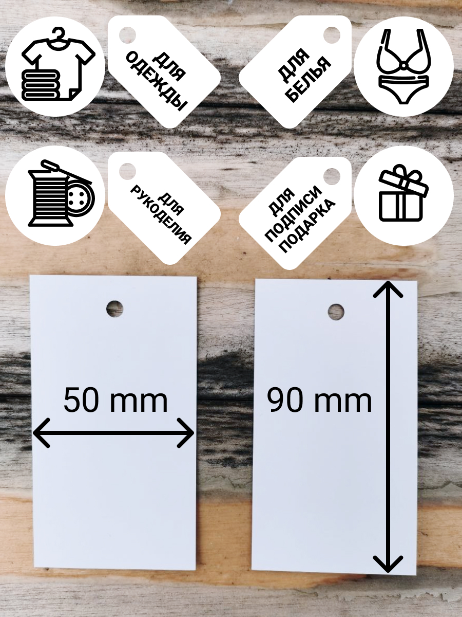 Белые картонные этикетки размером 90ммх50 мм. 100 шт в упаковке. Этикетки картонные подходят для любых категорий товаров: обувь,одежда, белье, детские товары, аксессуары, товары для дома ,как ценник на товар, можно использовать в поделках, творчерсте и ру