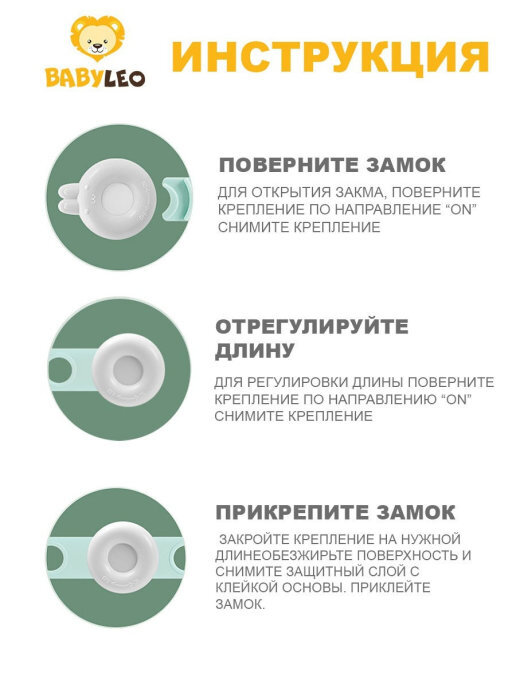 Детский замок BABYLEO – это универсальный замок для выдвижных ящиков, шкафов, дверей, дверей холодильника, СВЧ, морозильной камеры, крышки унитаза.Особенности:? Отлично держится на стеклянных, ламинированных, пластмассовых, деревянных и металлических пове