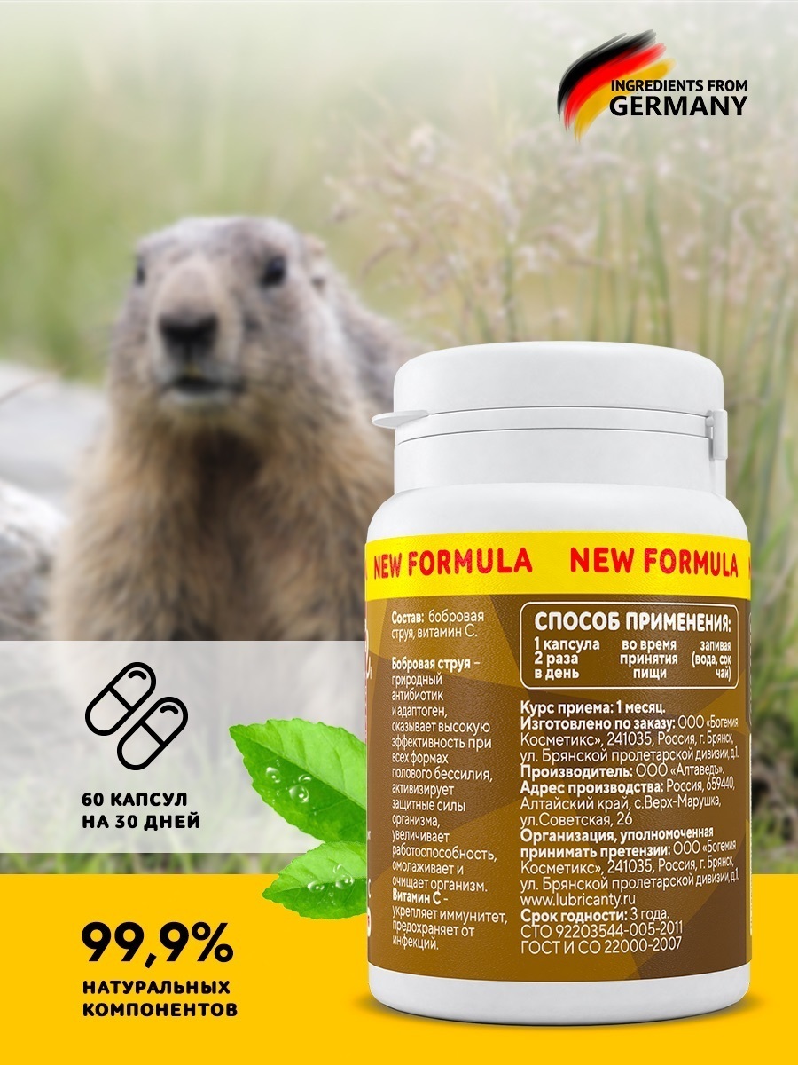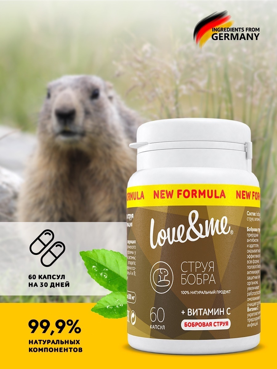 Бобровая струя концентрат пищевой на основе растительного и животного сырья Струя бобров с витамином C секрет бобра кастореум LOVE&ME бобровые железа Натурведъ №1 мускус бобра от полового бессилия активизирует защитные силы организма Алтаведъ 60 капсул.Пр
