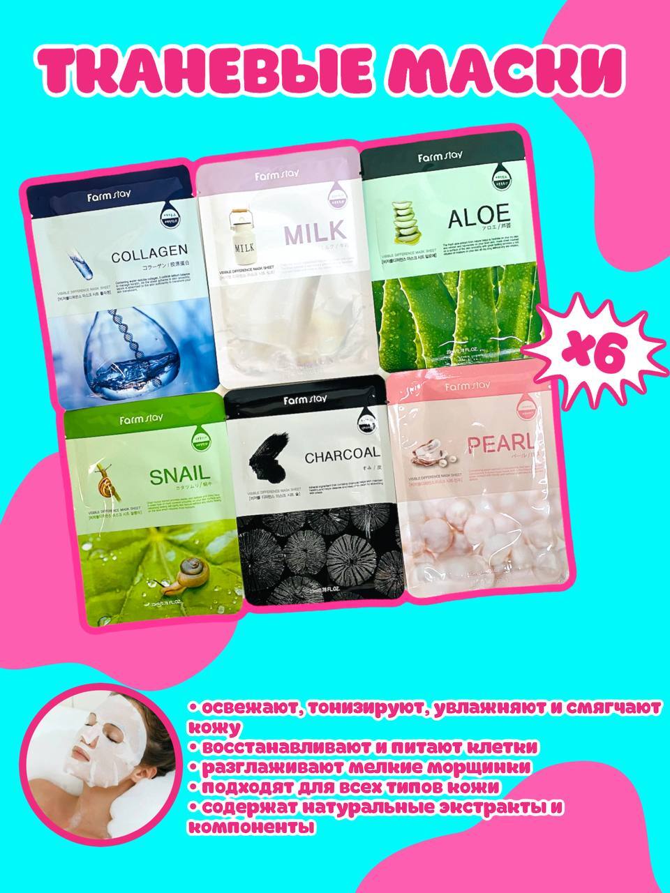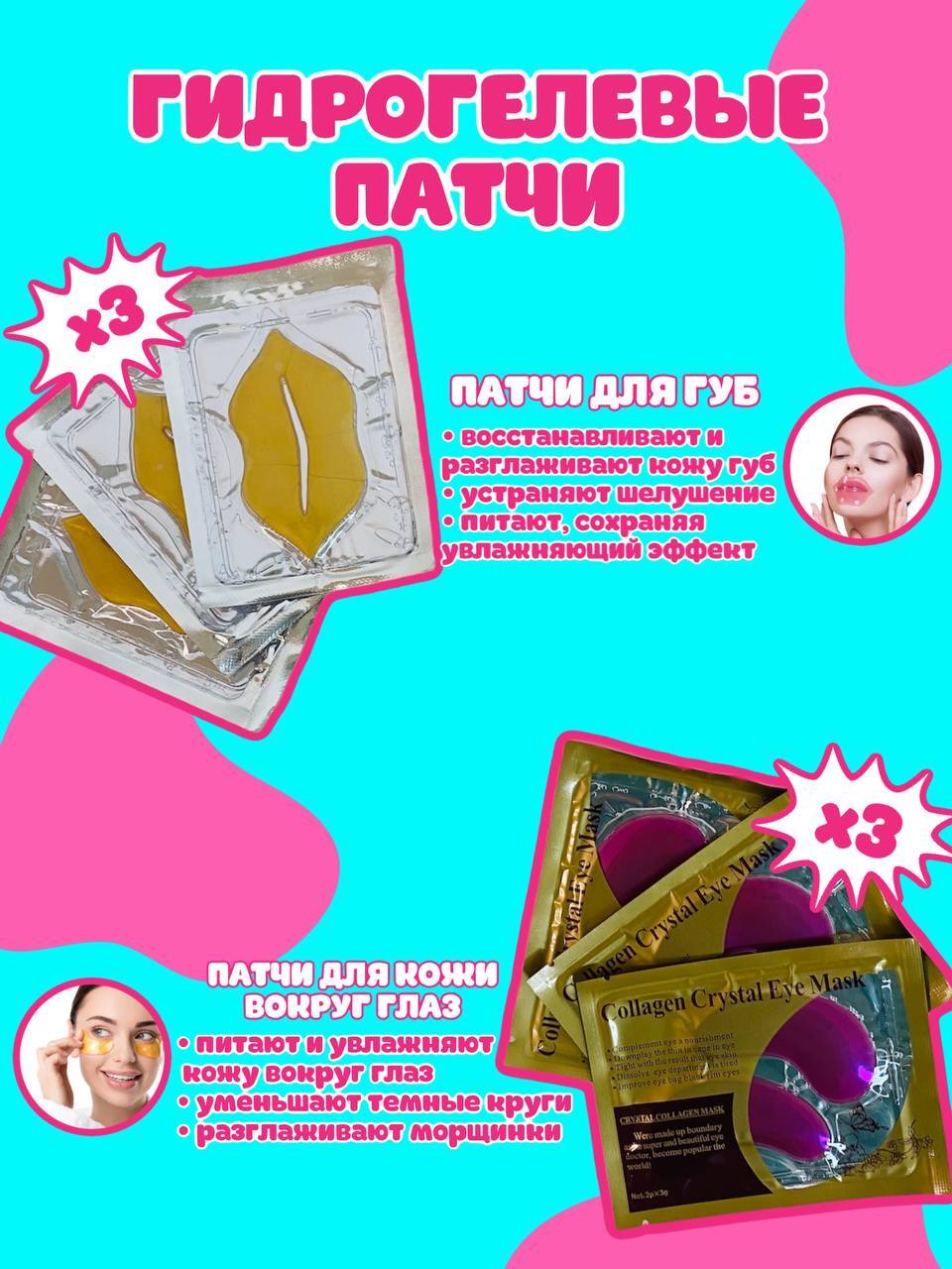 Способ применения:Тканевые маски наносить на 10-15 минут, после снять и массирующими движениями остатки маски оставить.Крем для рук наносите и не смываете.Патчи для глаз и губ(лучше хранить в холодильнике), держите 10-15 минут. Состав:Тканевые маски-6 шт