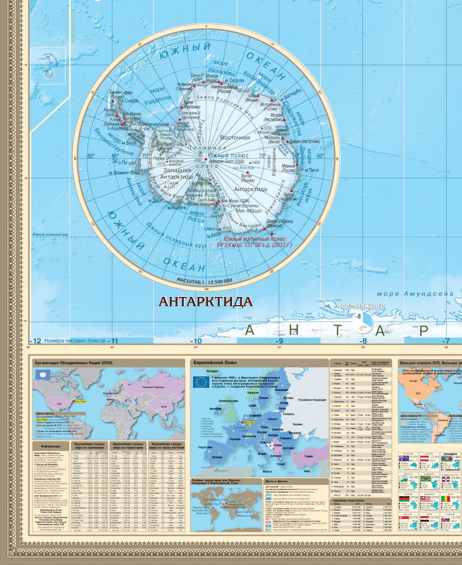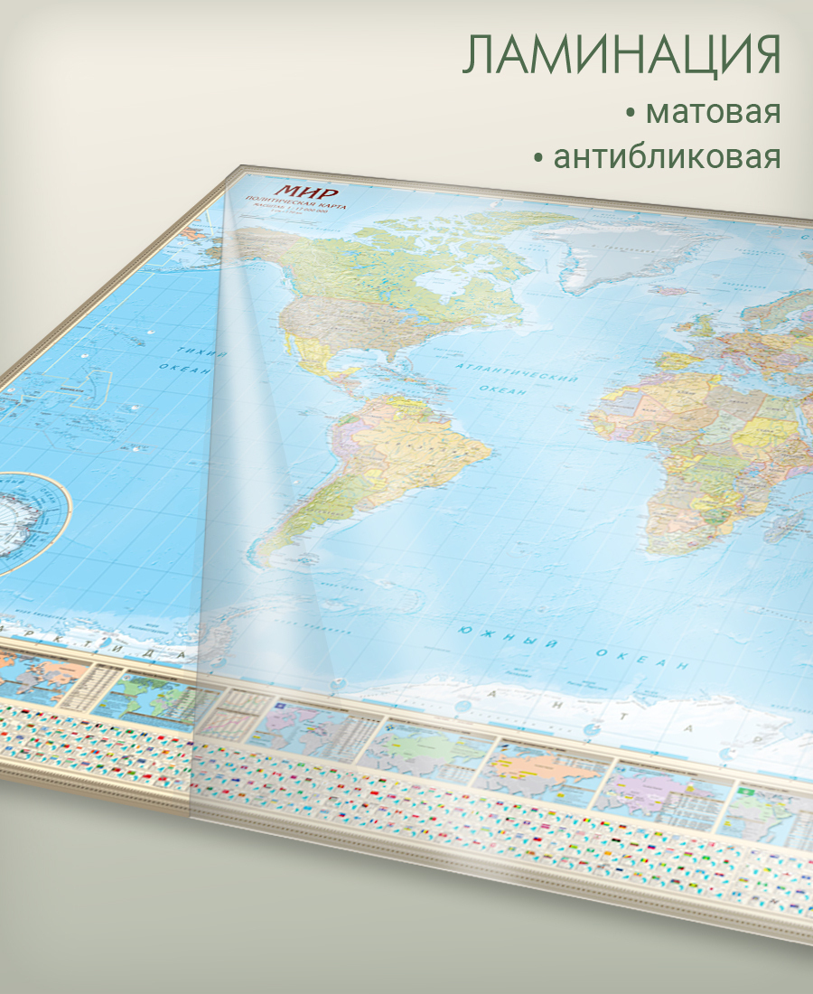 Подробная настенная политическая карта мира с инфографикой. Размер 234х156 см, масштаб 1:17 млн (1 см = 170 км).На карте показаны все государства и территории с особым статусом, их столицы и основные города, нанесены железнодорожные и автодорожные сети. В