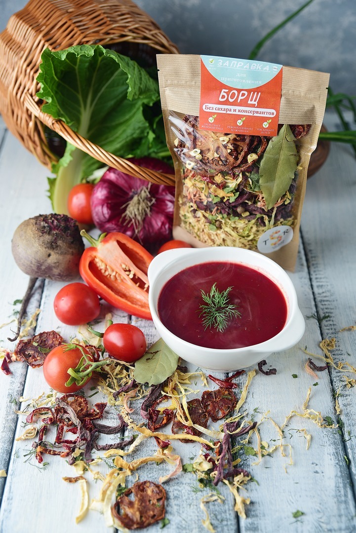 Состав:Капуста, свекла, морковь, красные помидоры, болгарский перец красный, петрушка, укроп, лук, чеснок,душистый перец, лавровый лист.Условия хранения:Хранить в тёмном месте при температуре от +5 до +25, при относительной влажности воздуха не более 75%