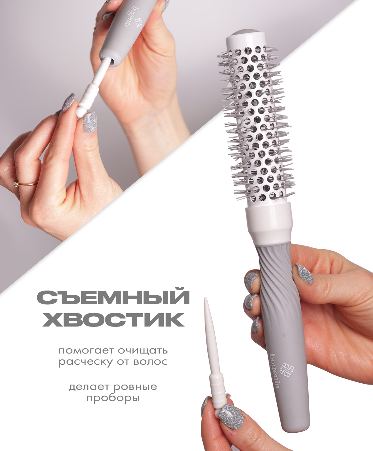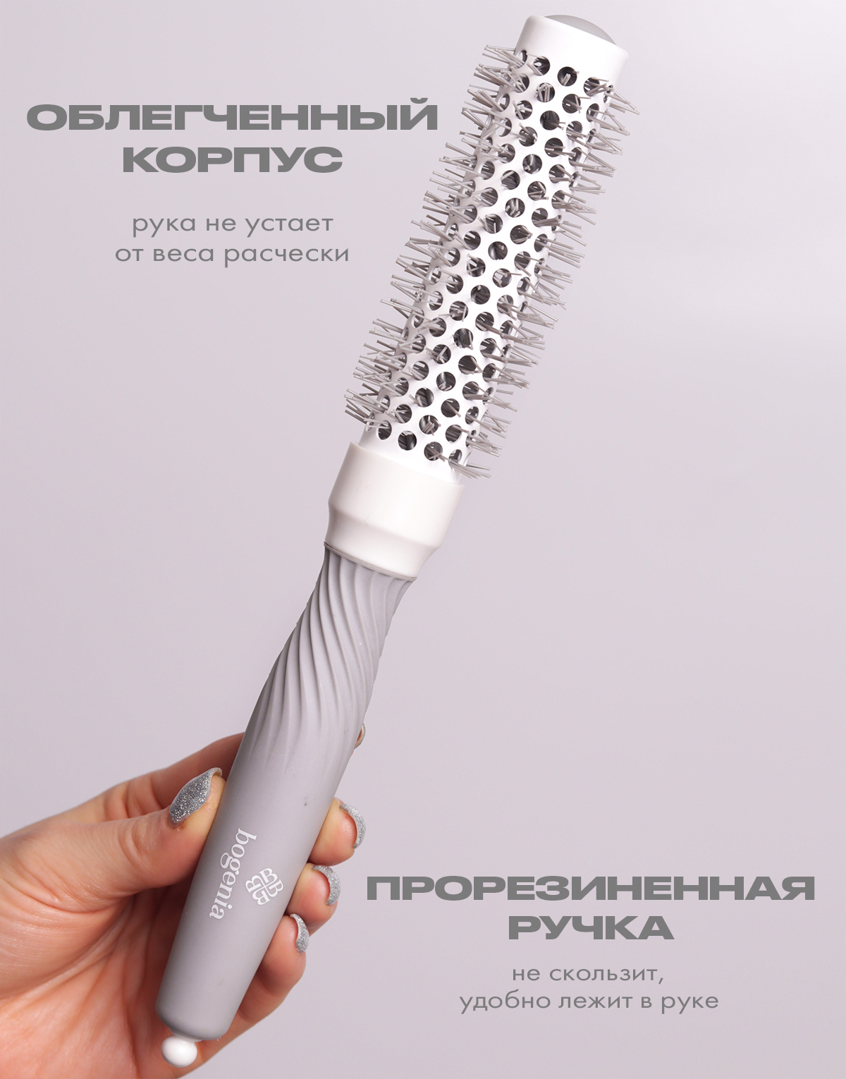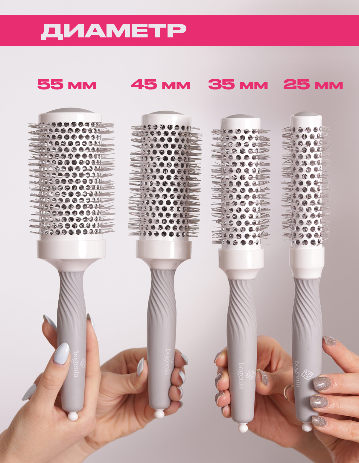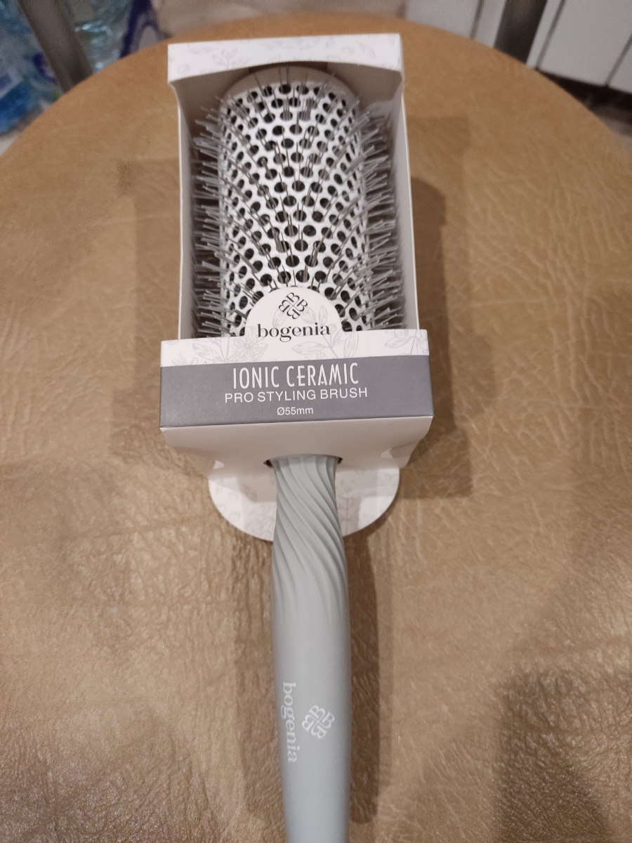 Расческа брашинг для волос Ionic Ceramic Pro от бренда Bogenia – ваш выбор в пользу быстрой укладки и здоровых прядей. За это отвечают сквозные отверстия в барабане, равномерно распределяющие горячий поток воздуха, а также керамическо-ионное покрытие, при