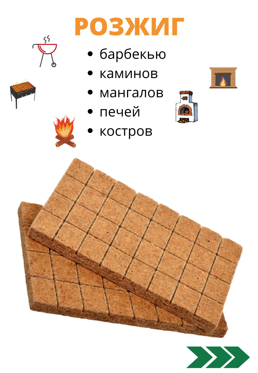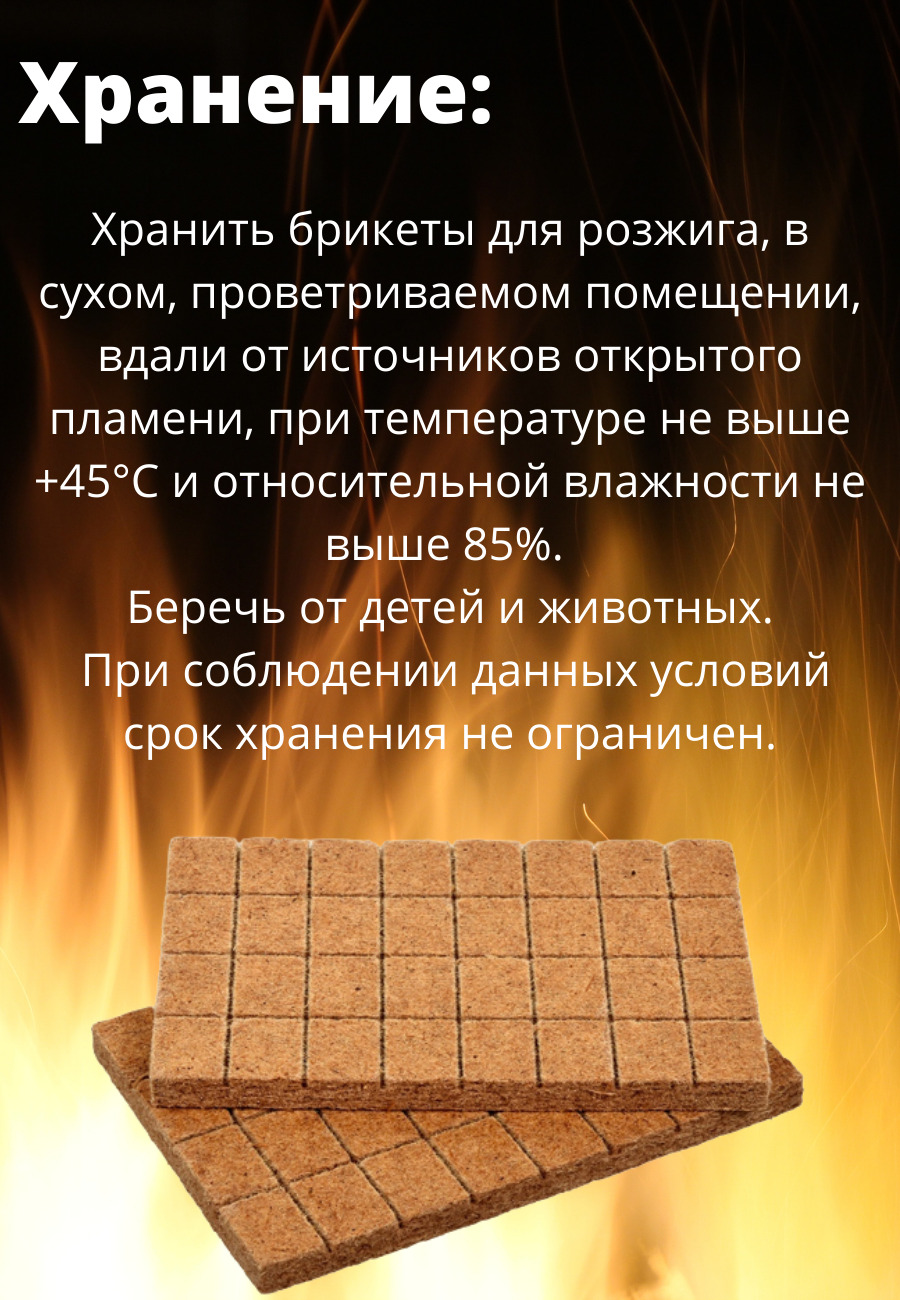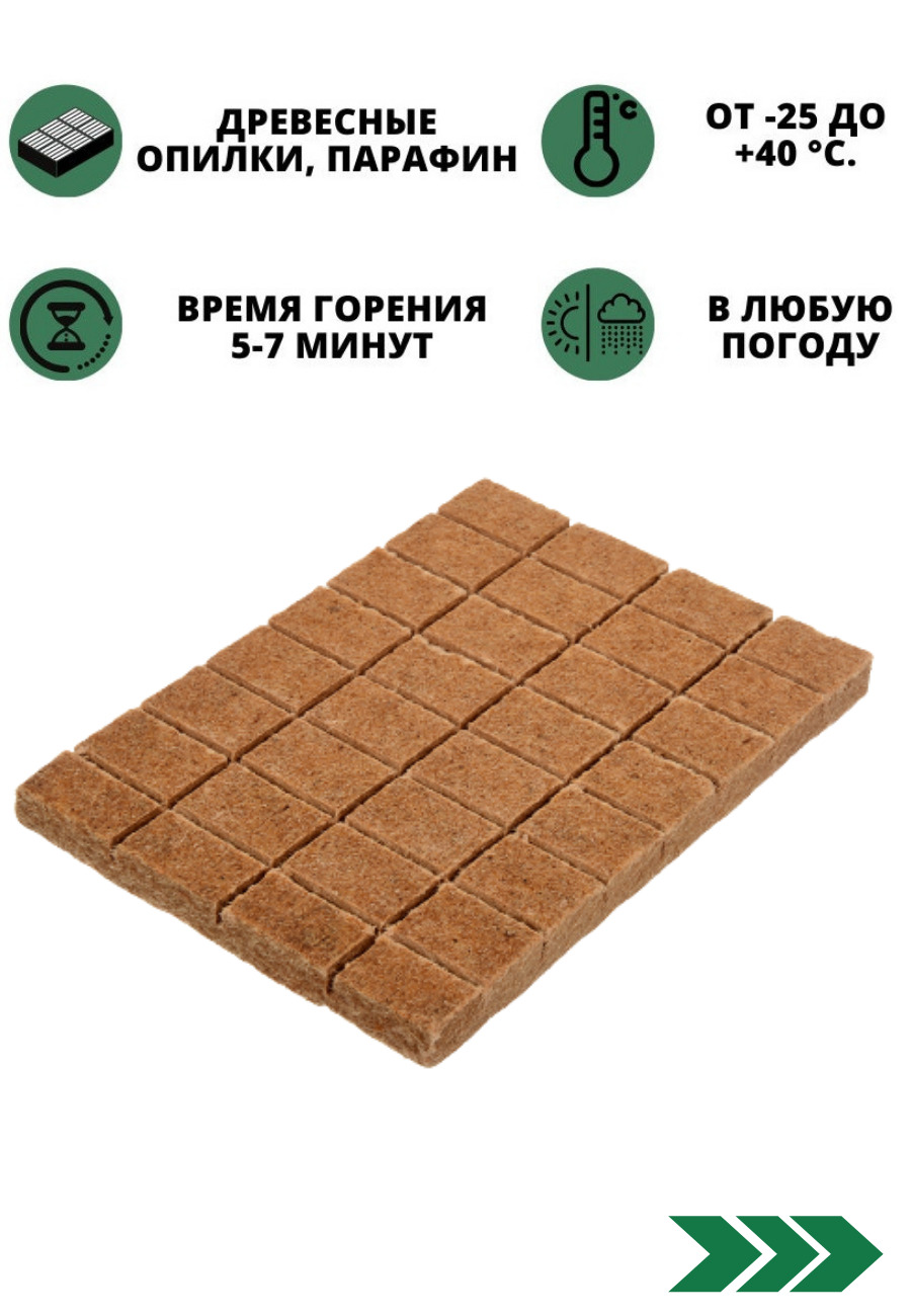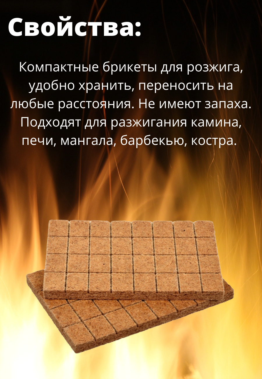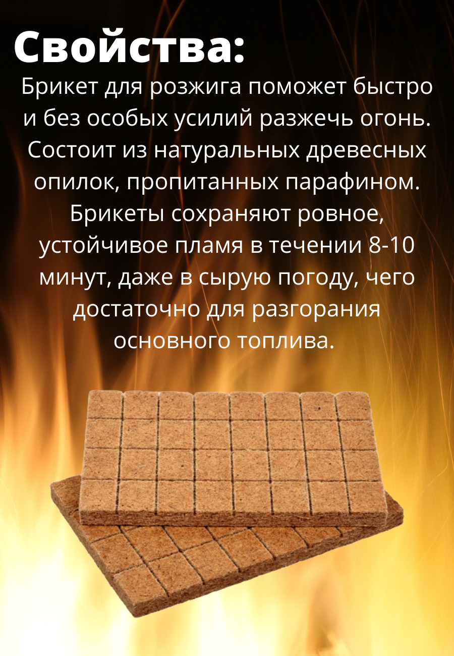 Брикеты для розжига представляют собой спрессованную смесь древесной пыли и твердого парафина. Для удобства использования выполнены в виде плитки, разделенной на 32 брикета. Брикеты для розжига позволяют без труда разжечь огонь в сырую ветреную погоду.Раз