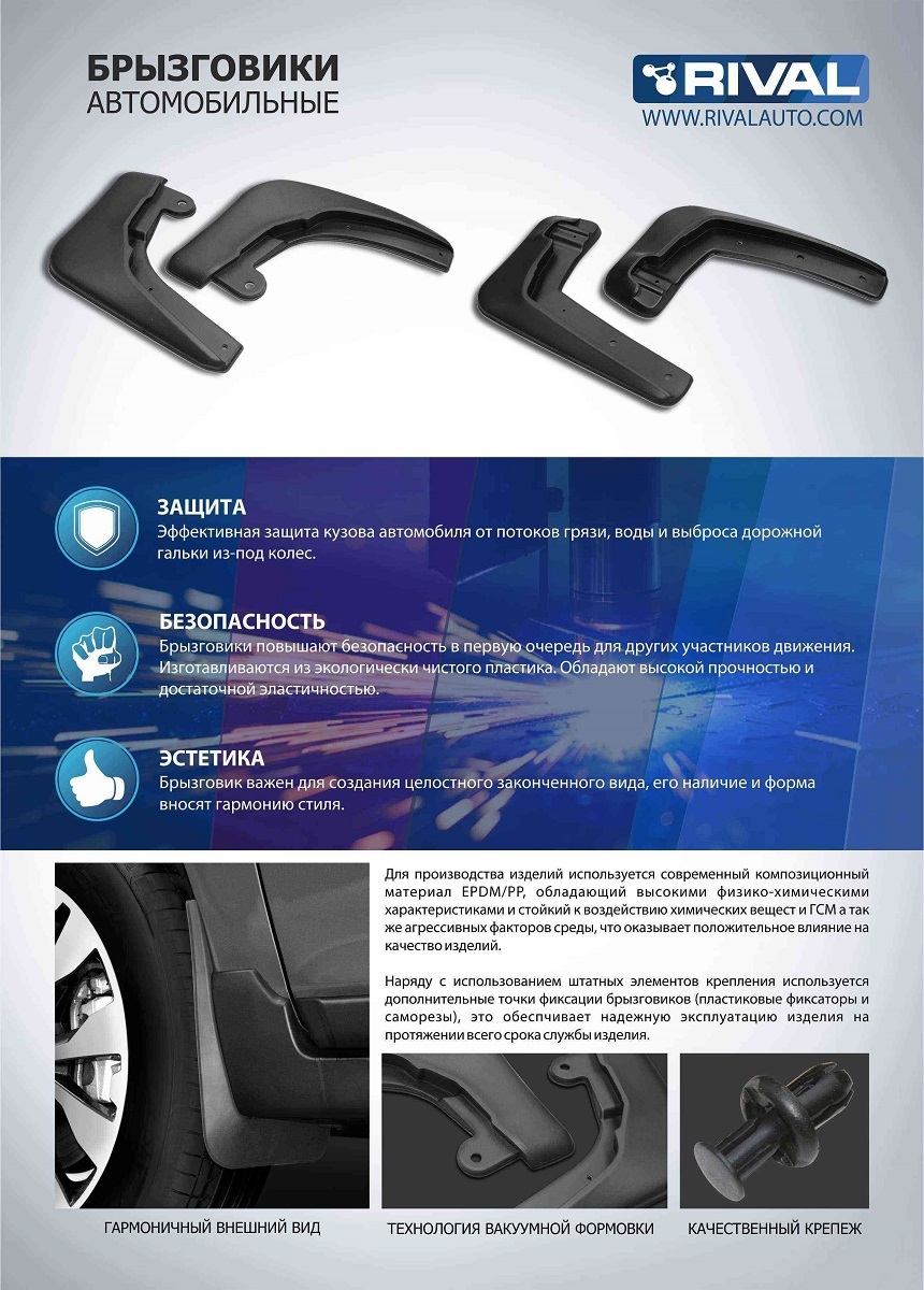 Брызговики Rival защищают покрытие автомобиля от грязи, мусора и посторонних предметов, летящих из-под колес вашего автомобиля во время движения.Особенности брызговиков Rival:- Изготовлены из высококачественного, нетоксичного и экологичного материала, что