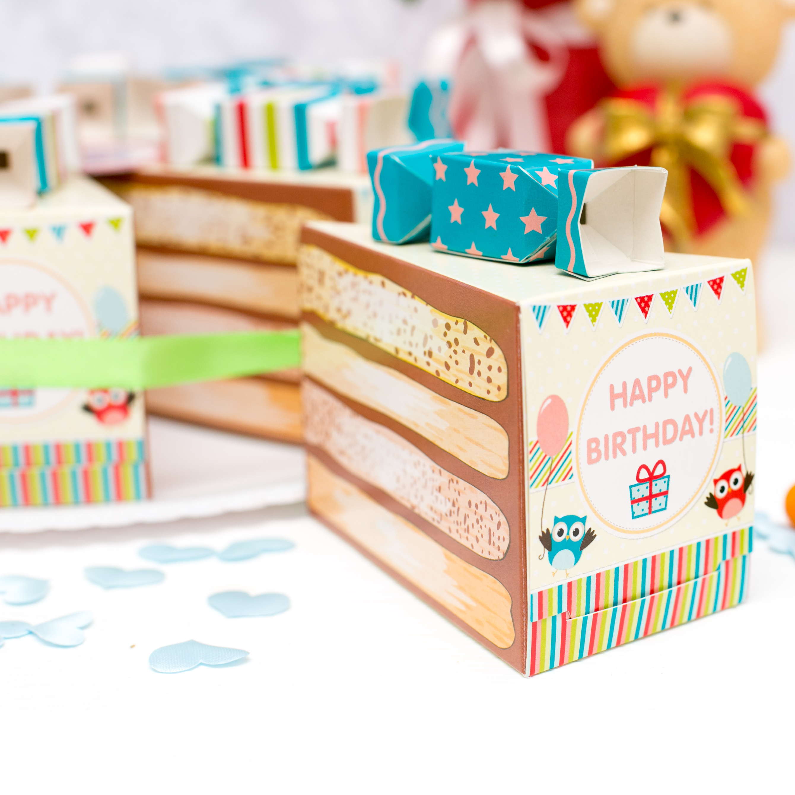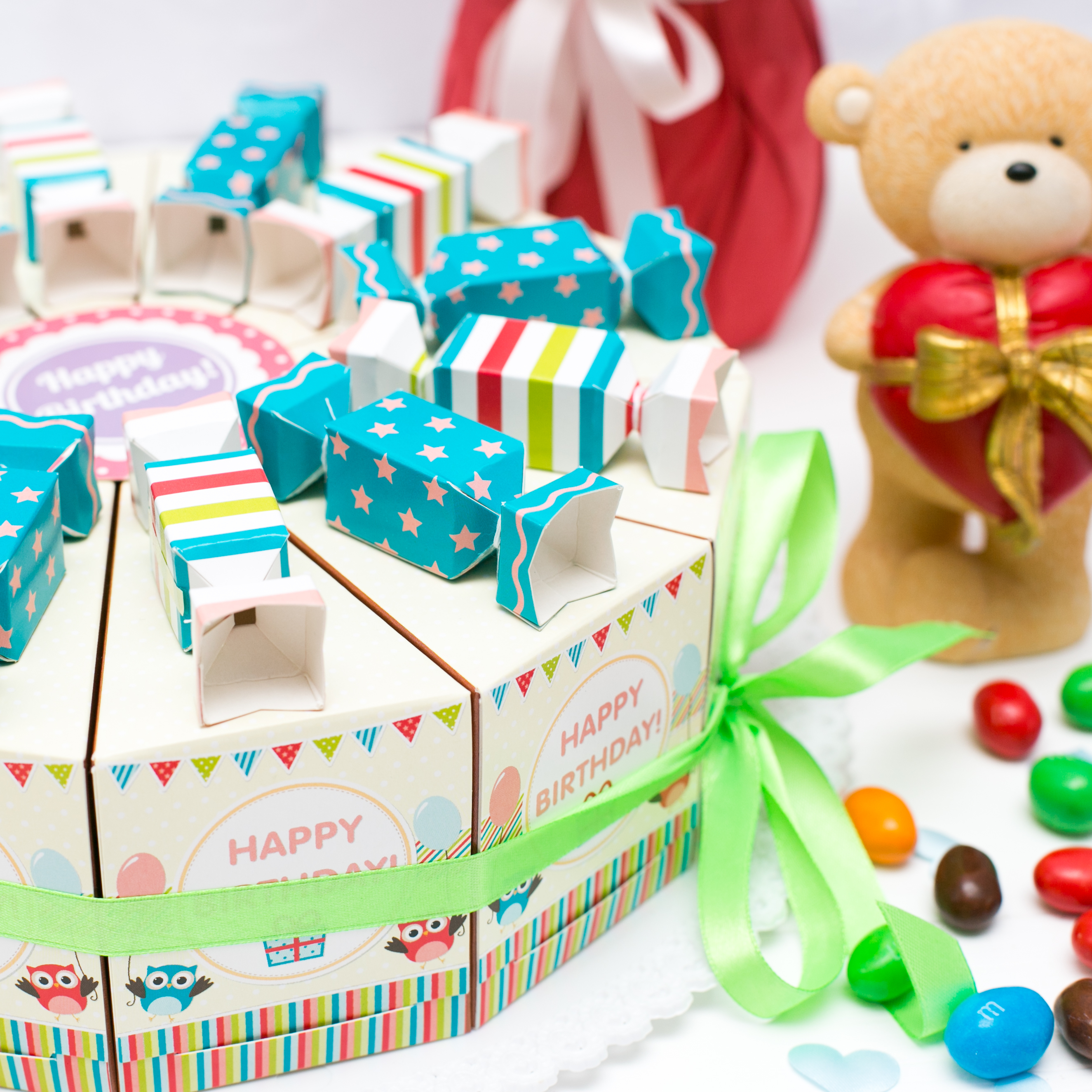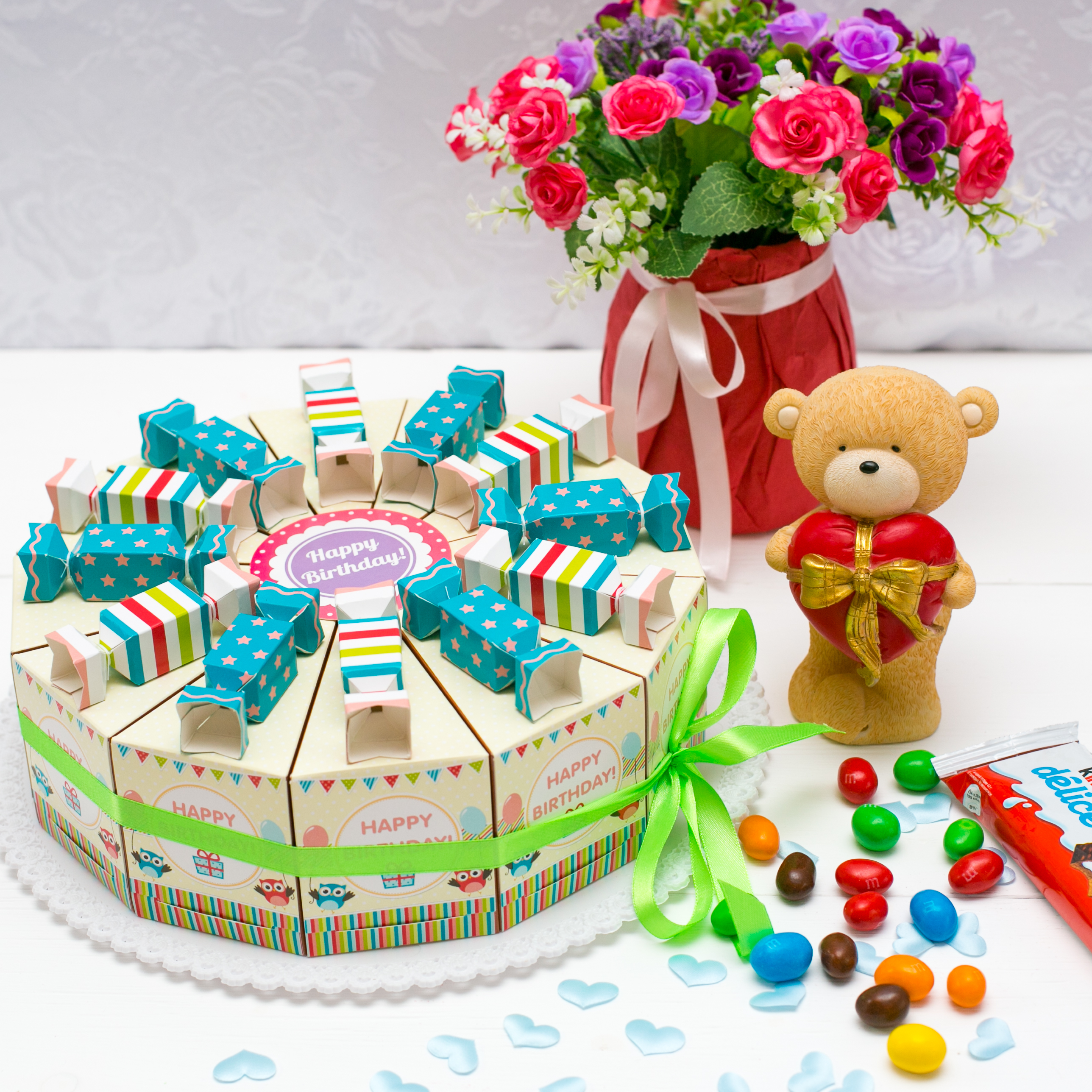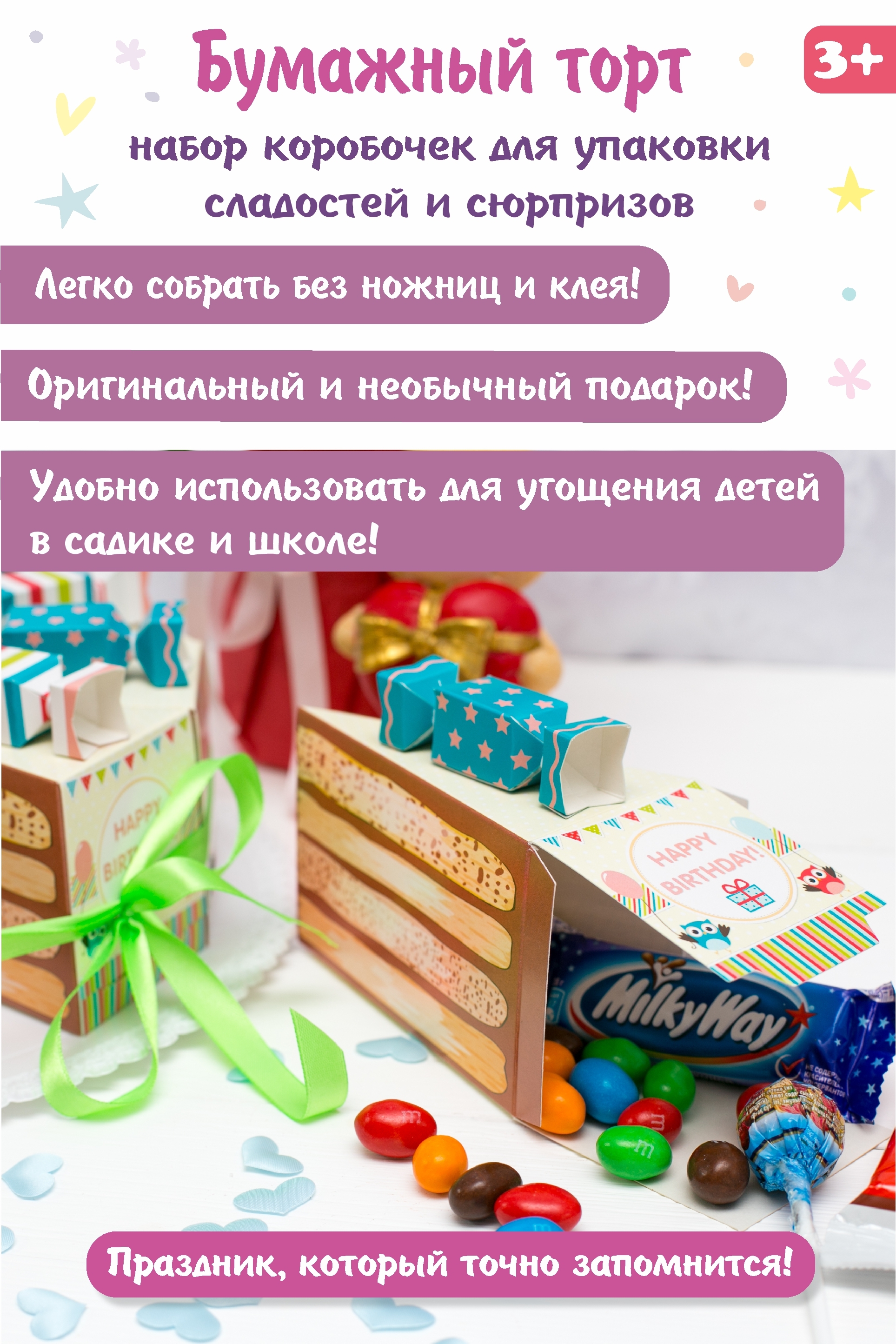 Состав набора:12 коробочек с украшениямиКомплектация:Самосборные коробочки - 12 шт; украшения в виде бумажных конфет - 12 шт; кружок в центр тортика; атласная ленточка; двухсторонний объемный скотч для крепления украшений; инструкция по сборке. Поднос для