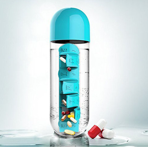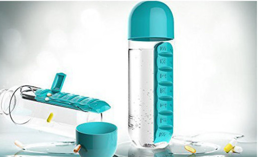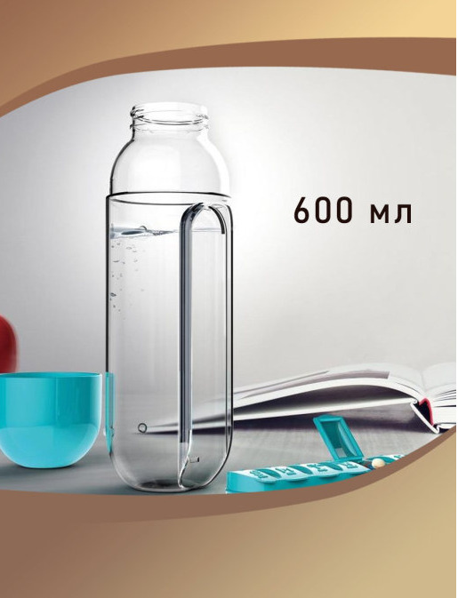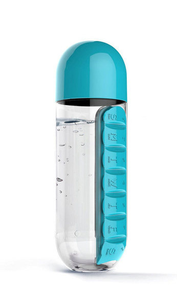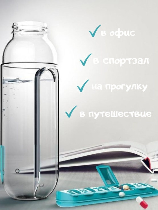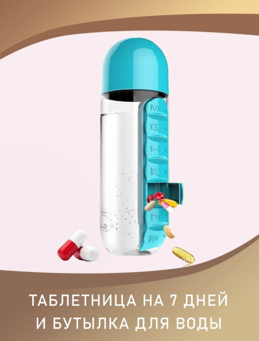 Бутылка со съемным пеналом на 7 секций для таблеток на каждый день недели. Крышку можно использовать в качестве стаканчика для питья. Размер 24 см х7 см.Объём 600 мл. Многофункциональный органайзер-бутылка выполнен из легкого, прочного материала не содерж