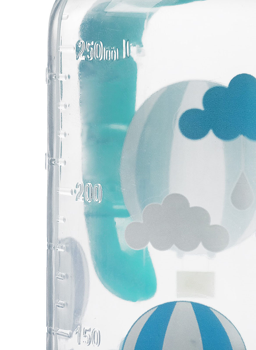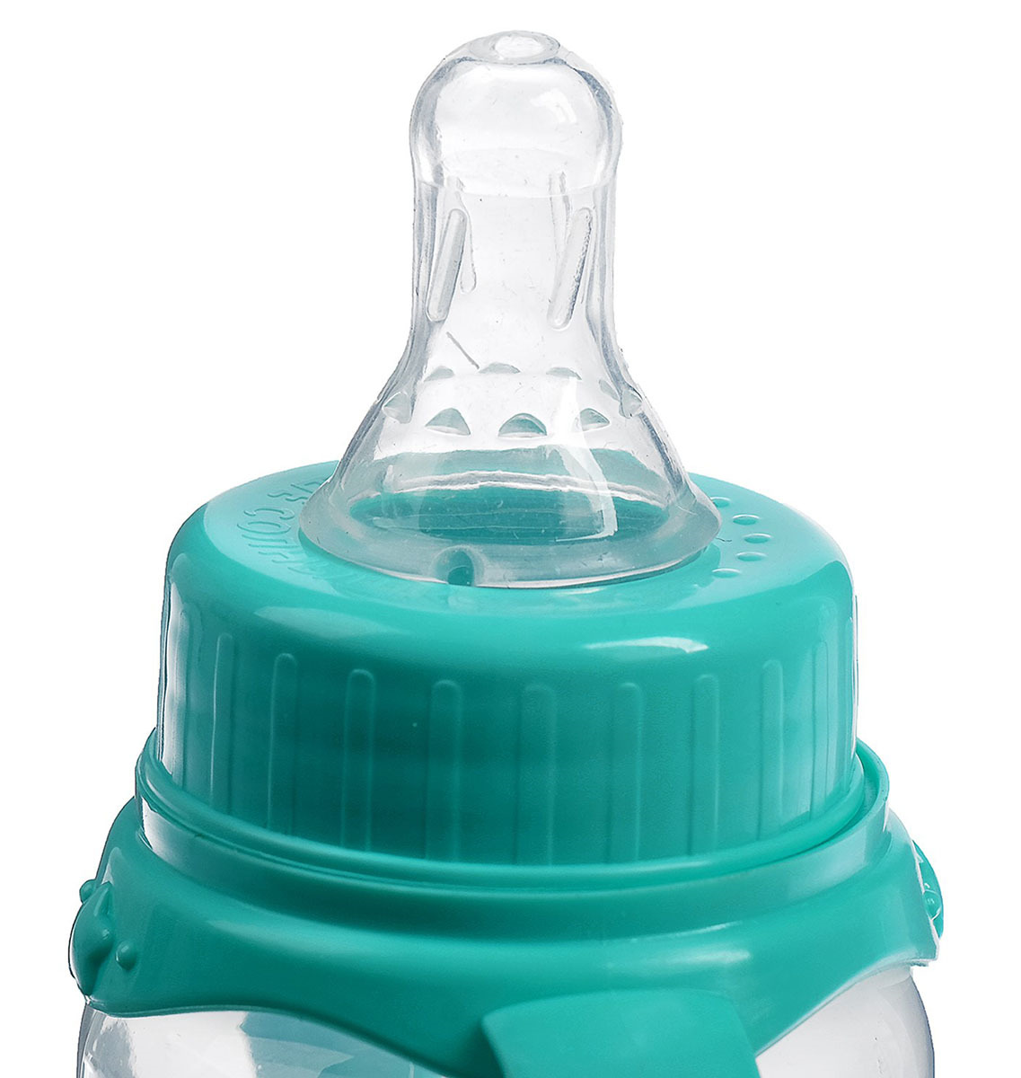 Пластиковая бутылочка мало весит, поэтому её удобно давать ребёнку. Износостойкий материал прослужит около 2 лет.ОсобенностиСиликоновая соска не имеет вкуса и запаха.Средний поток оптимален для молока, молочных смесей, воды и чая.Рёбра жёсткости соски не