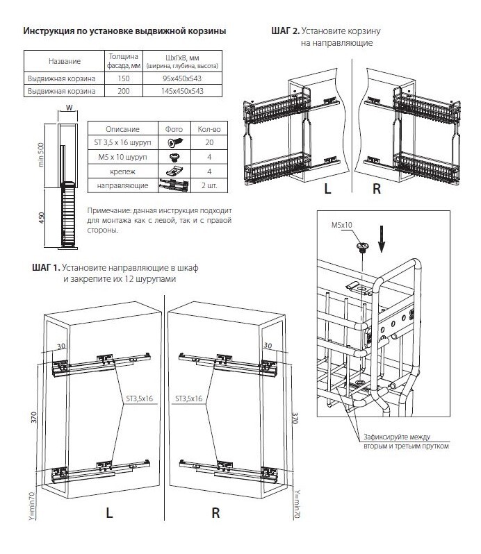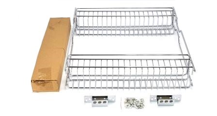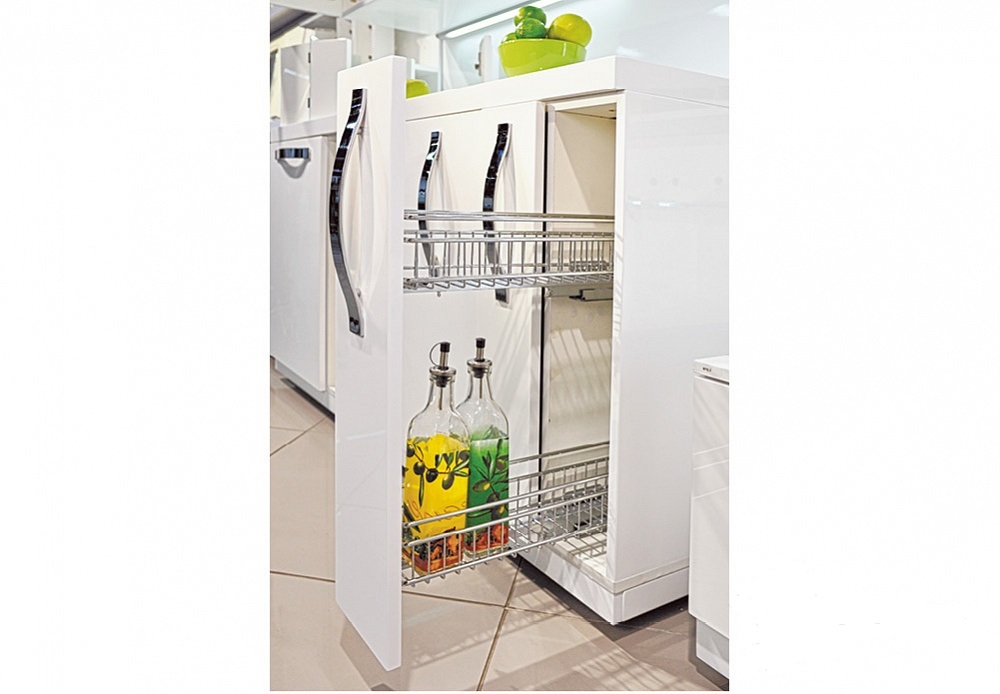 Бутылочница (карго) — выдвижная проволочная корзина, которая встраивается в шкафы кухонного гарнитура. Выдвигается благодаря телескопическим направляющим, а ее передняя сторона закрывается мебельным фасадом.Выдвижная корзин из стального прутка.Направляющи
