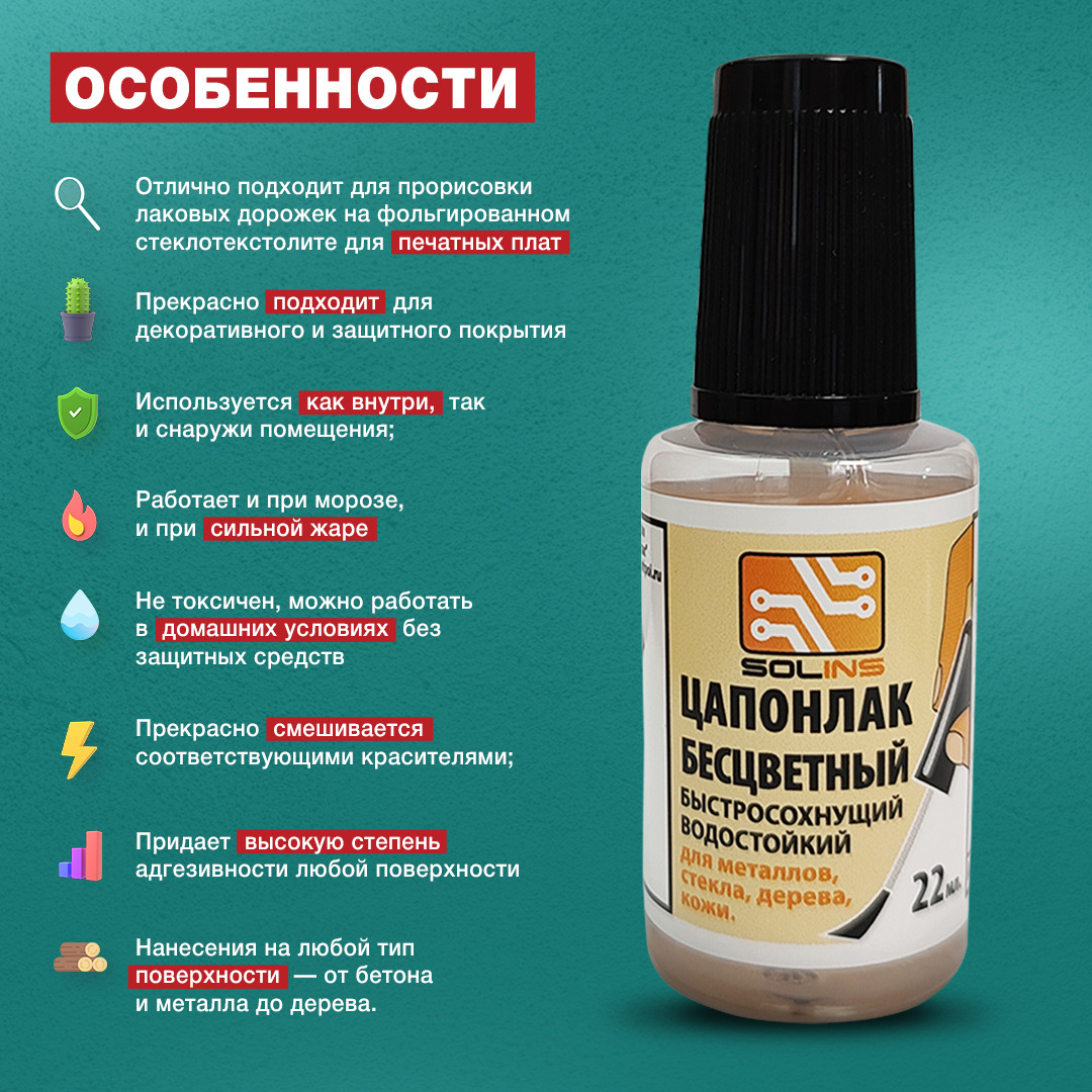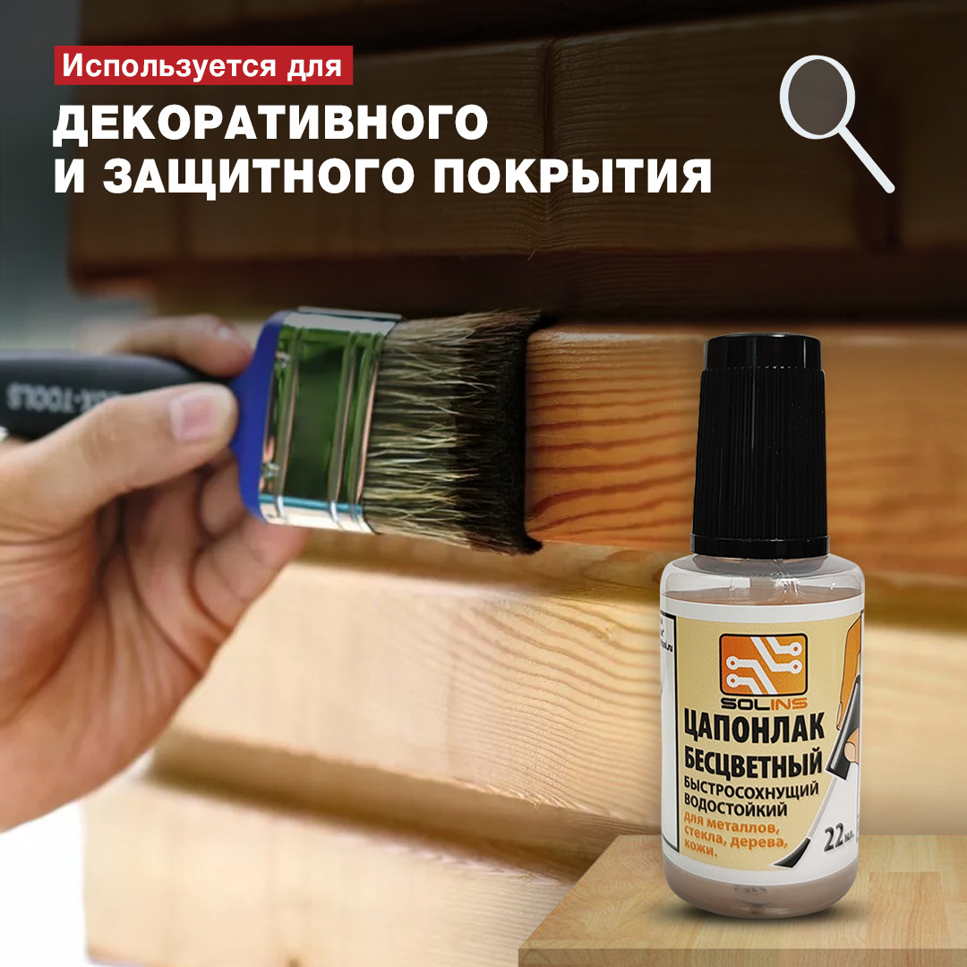 Основное применение цапонлака в технике — покрытие им паяных оловянно-свинцовыми припоями электрических соединений.В светотехнике лаком окрашиваются стеклянные колбы ламп накаливания и светодиоды, например, в ёлочных электрических гирляндах.Цапонлак приме