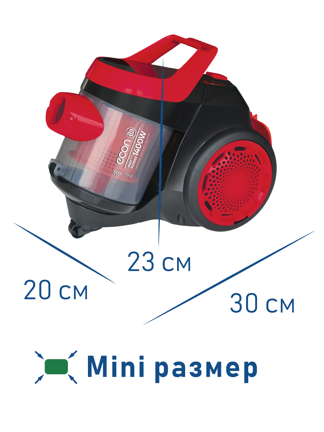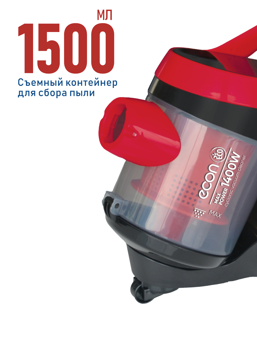 Бюджетный супермощный циклонный мини-пылесос ECON прекрасно подойдет для уборки небольших квартир и станет верным помощников на вашей даче.Мощность прибора 1400 Вт, мощность всасывания 280 Вт, длина шнура 3м. В пылесосе установлен съемный пластиковый конт