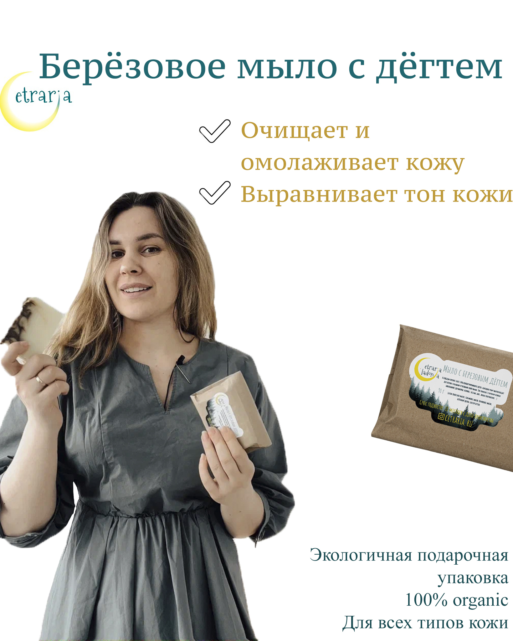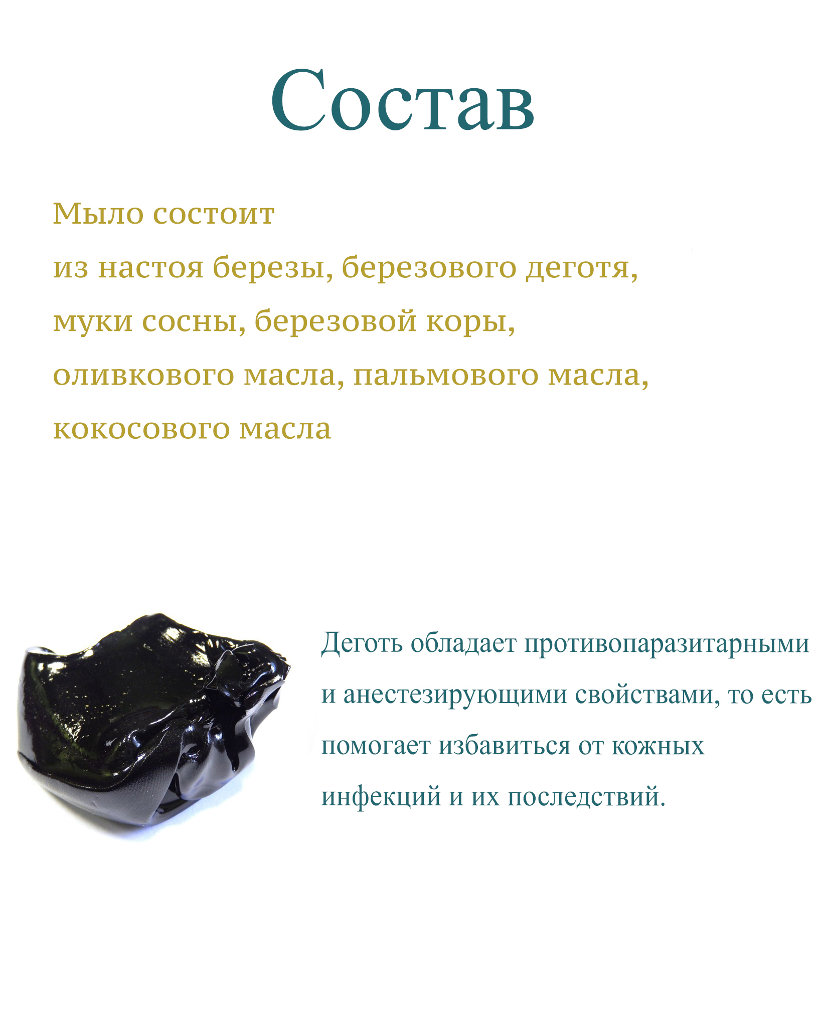 Состав:Настой березы, березовый деготь, мука сосны, березовая кора, оливковое масло, пальмовое масло, кокосовое масло.Способ применения:На влажную кожу нанести массирующими движениями, смыть водойКомплектация:Натуральное мыло "Березовый деготь"Описание:Ор