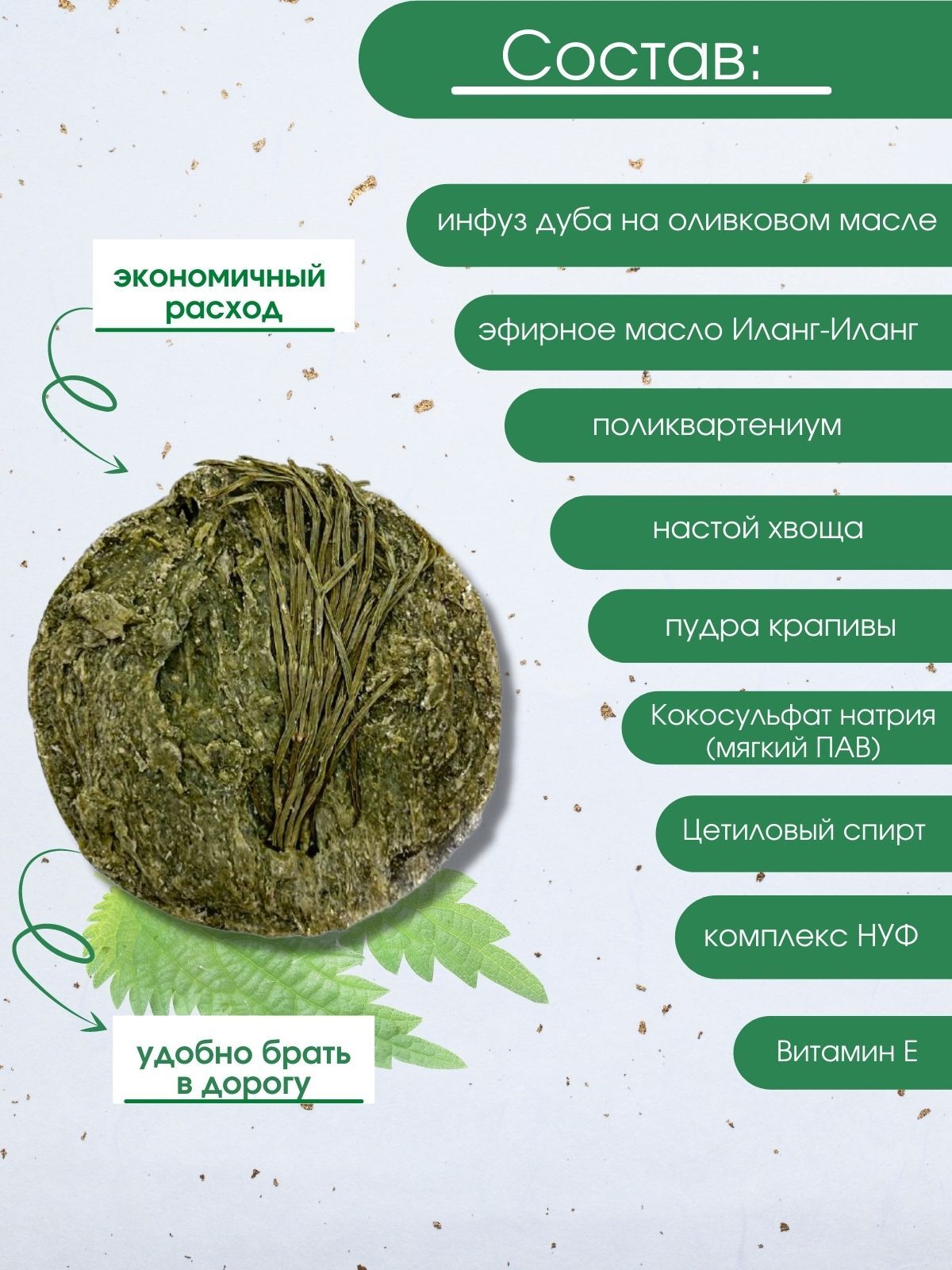 Состав:Настой хвоща,пудра крапивы,инфуз дуба на оливковом масле,витамин Е,поликвартениум,комплекс НУФ,эфирное масло Иланг Иланг,цетиловый спирт,натрий кокосульфат(мягкий ПАВ)Комплектация:твердый шампуньОписание:Если Ваши волосы ломкие,тусклые и медленно р