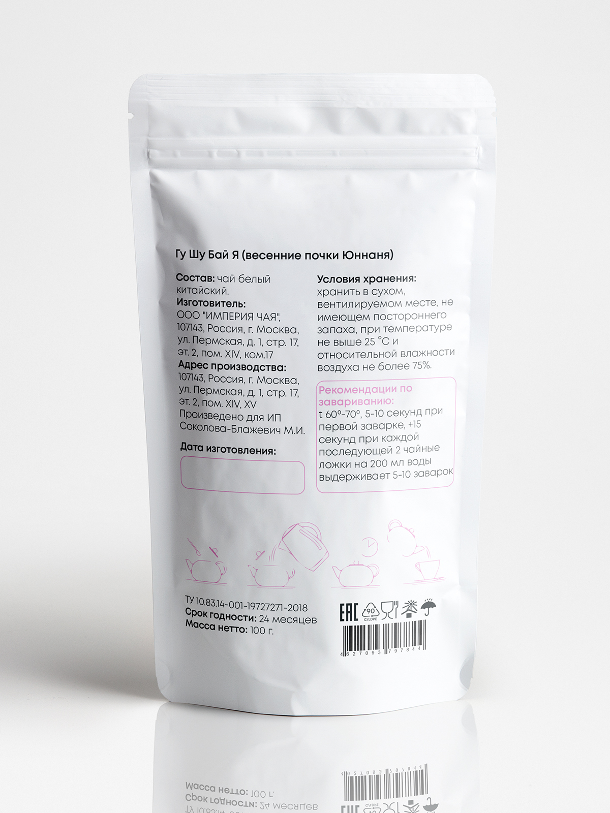 Условия хранения:хранить в сухом, вентилируемом месте, не имеющем постороннего запаха, при температуре не выше 25 °С и относительной влажности воздуха не более 75%.Состав:чай белый китайскийОписание:Чай белый Гу Шу Бай Я (Весенние почки Юннаня) от ONE MOO
