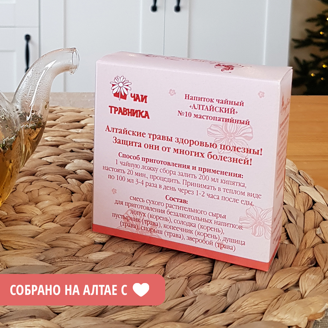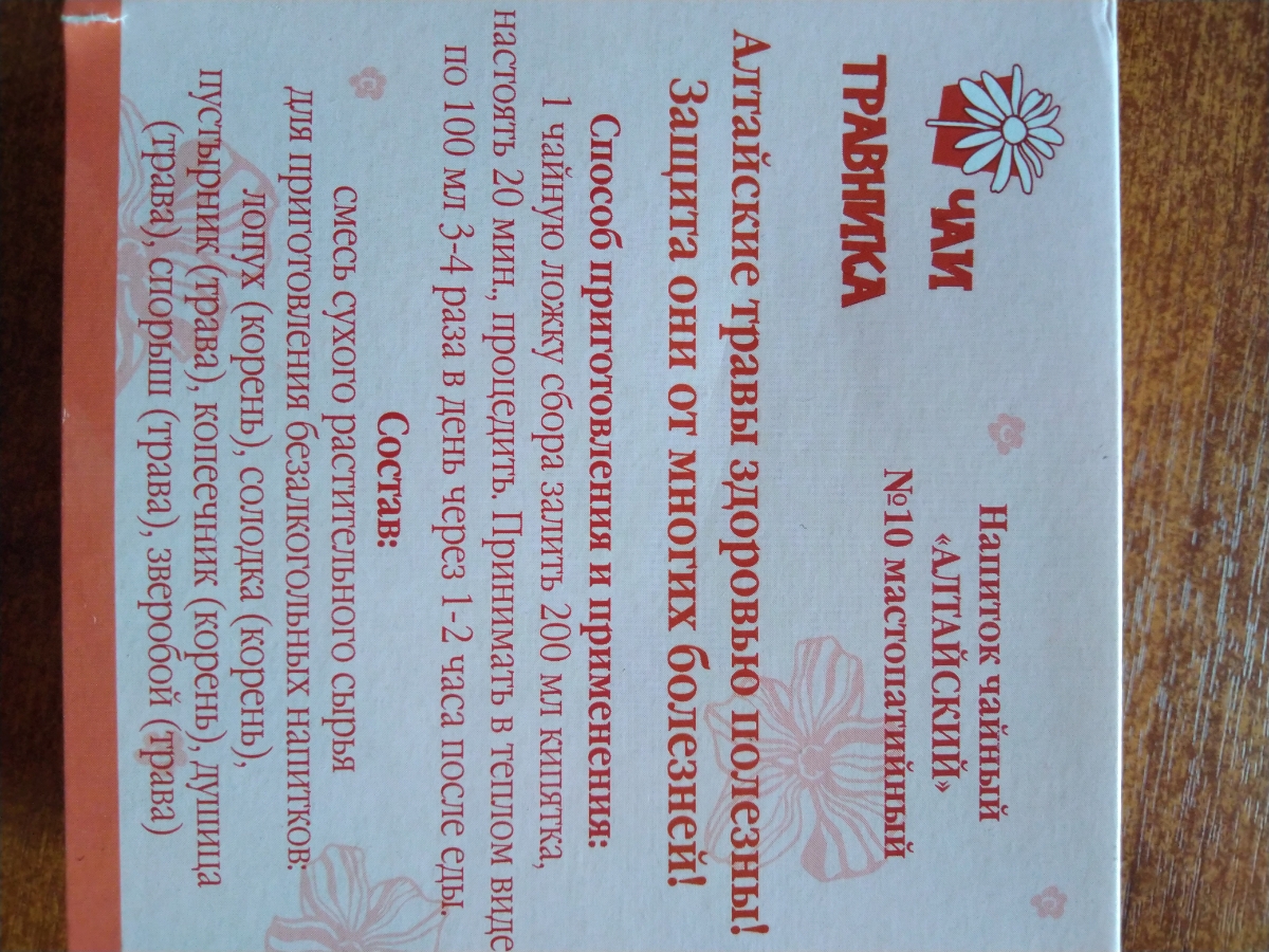 Условия хранения:При температуре не выше 25 С и относительной влажности не более 75%Приготовленный напиток - в прохладном месте не более двух сутокСостав:Пустырника трава, лопух, солодка, копеечник, душица, спорыш, зверобойОписание:Алтайский травяной сбор