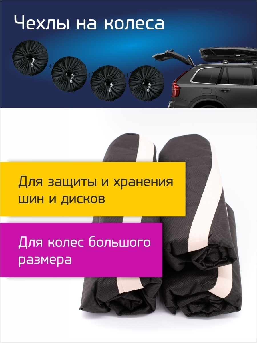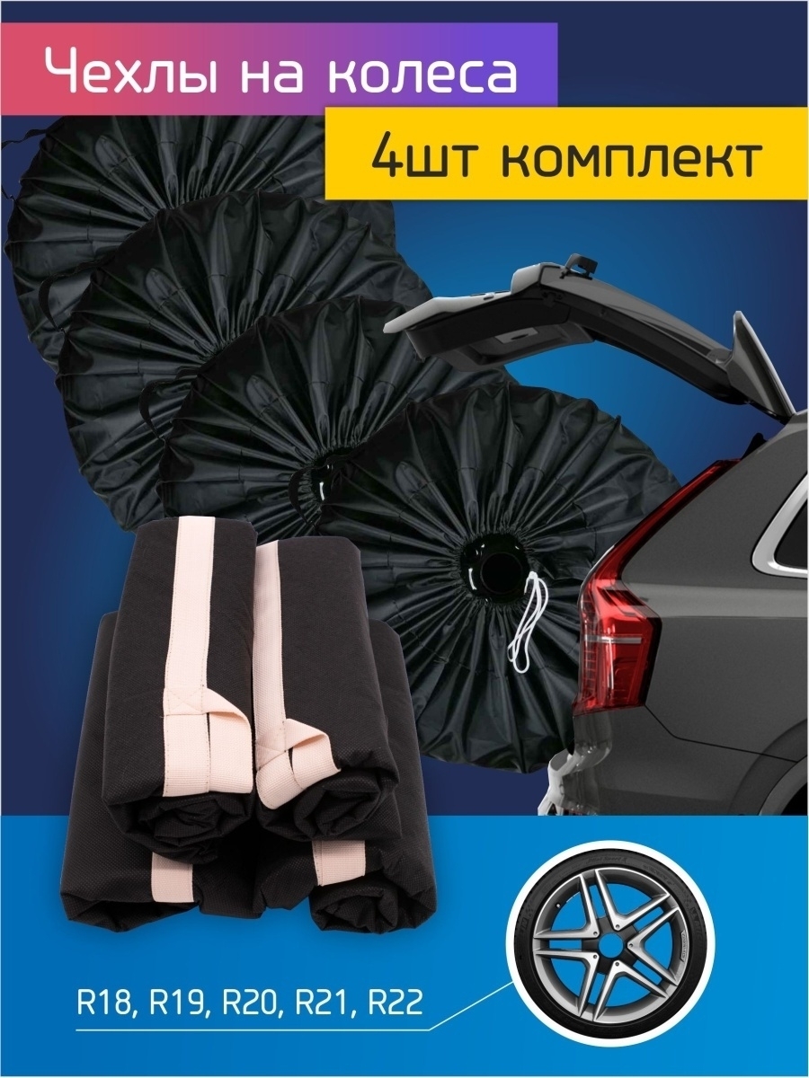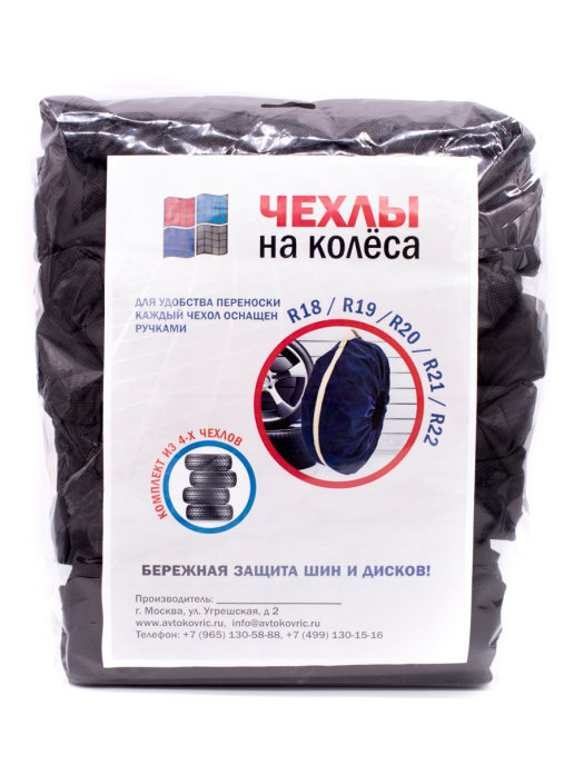 Комплектация:Чехлы для колес R18/19/20/21/22 - 4 штОписание:Чехлы для колес автомобиля предназначены для межсезонного хранения и транспортировки колес. Чехлы для автомобильных колес изготовлены в России на современном оборудовании из качественного материа