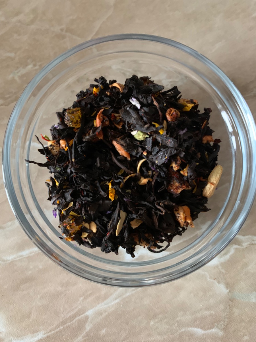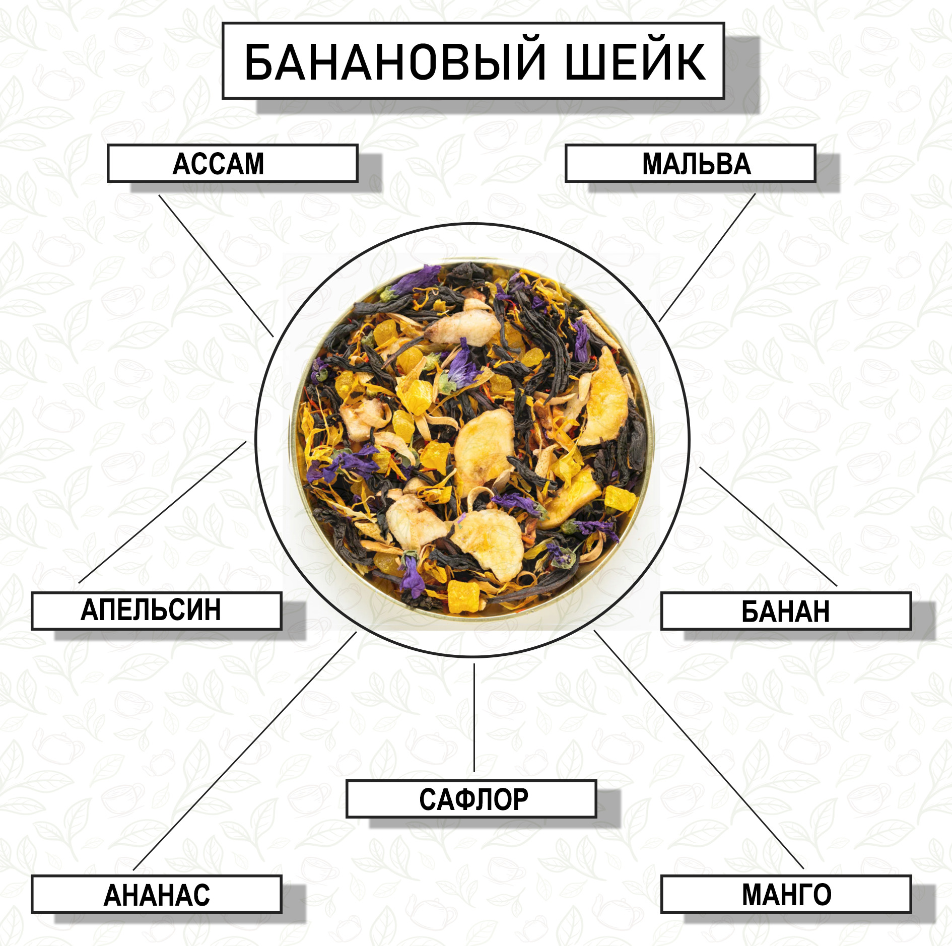 Условия хранения:Хранить при температуре не выше +20°C при относительной влажности воздуха не выше 75%Состав:Индийский черный байховый чай, банановые чипсы, цветки апельсинового дерева, сафлор, цукаты ананаса, цукаты манго, цветки мальвы, календула, кусоч